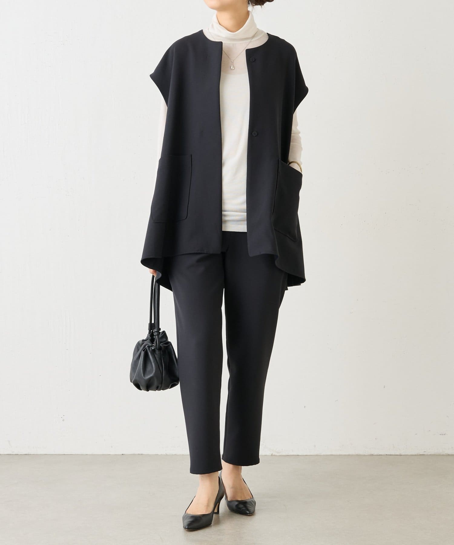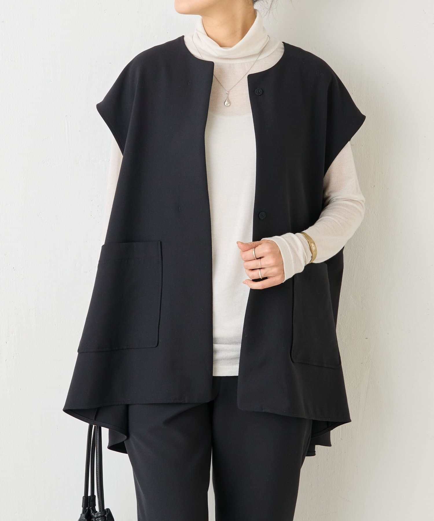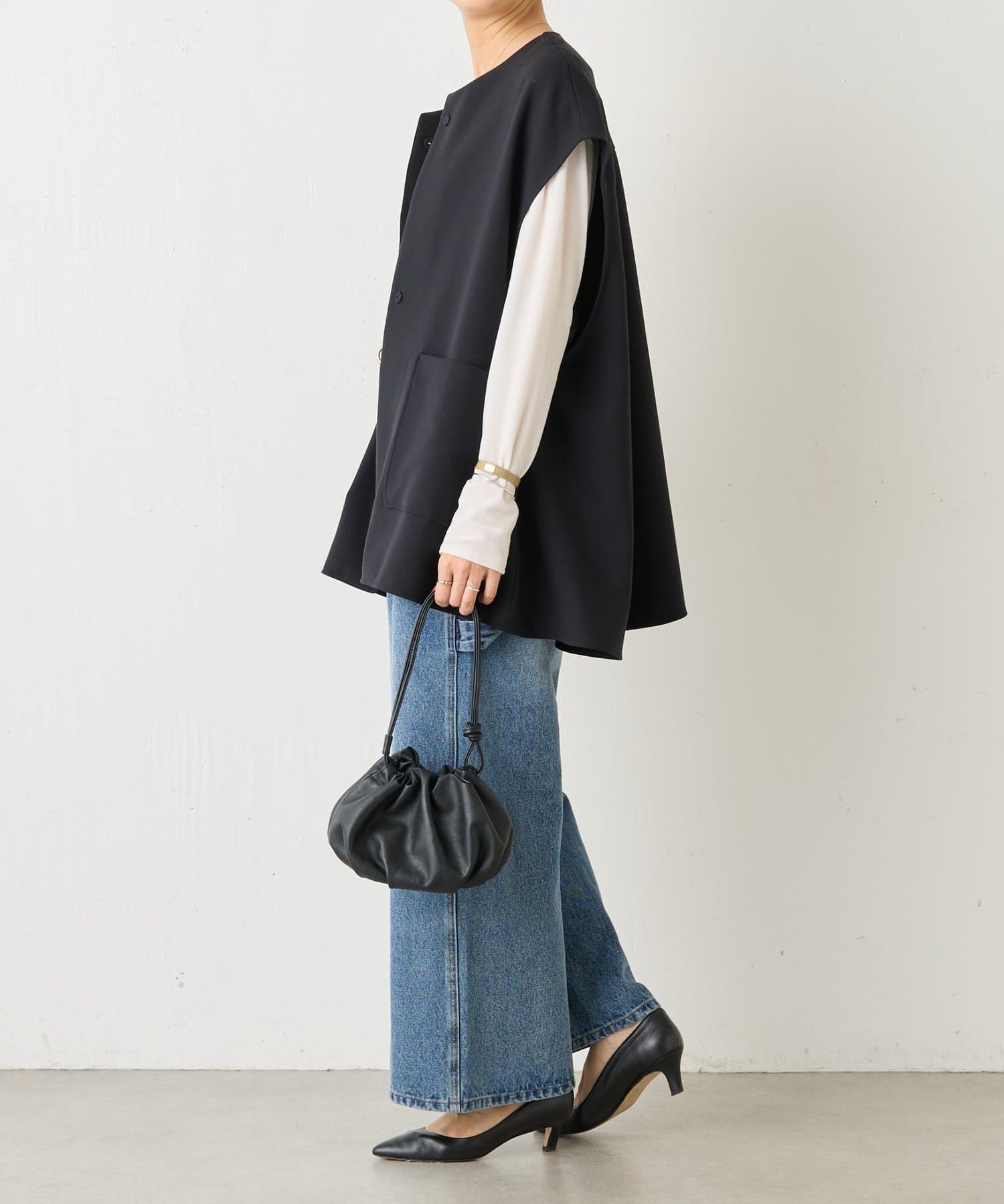 この丈感のジレが好きで、シルエットもデザインも素材感も好みです。インナーやボトム次第でカジュアルにもオケージョンにも合わせられると思います。