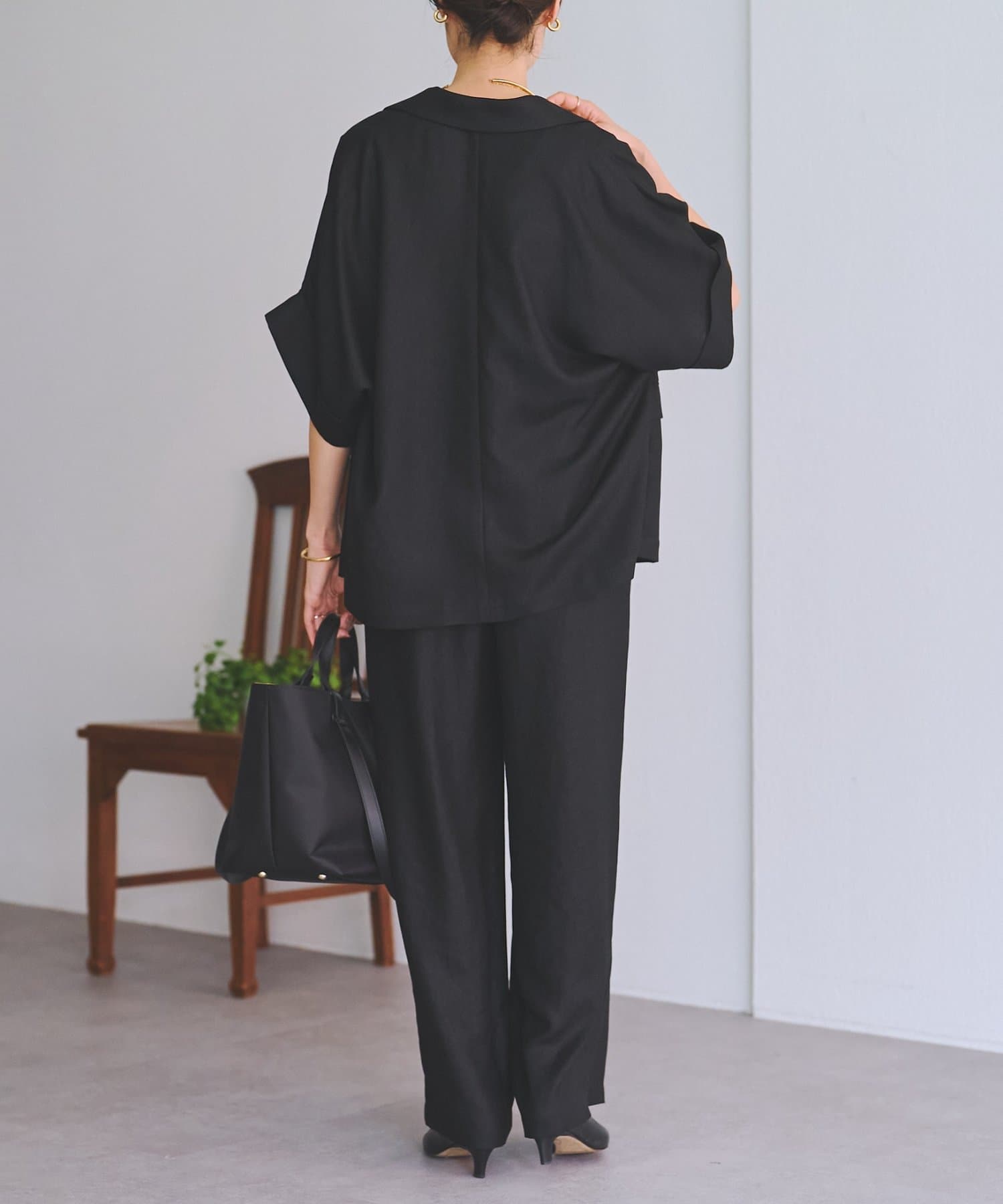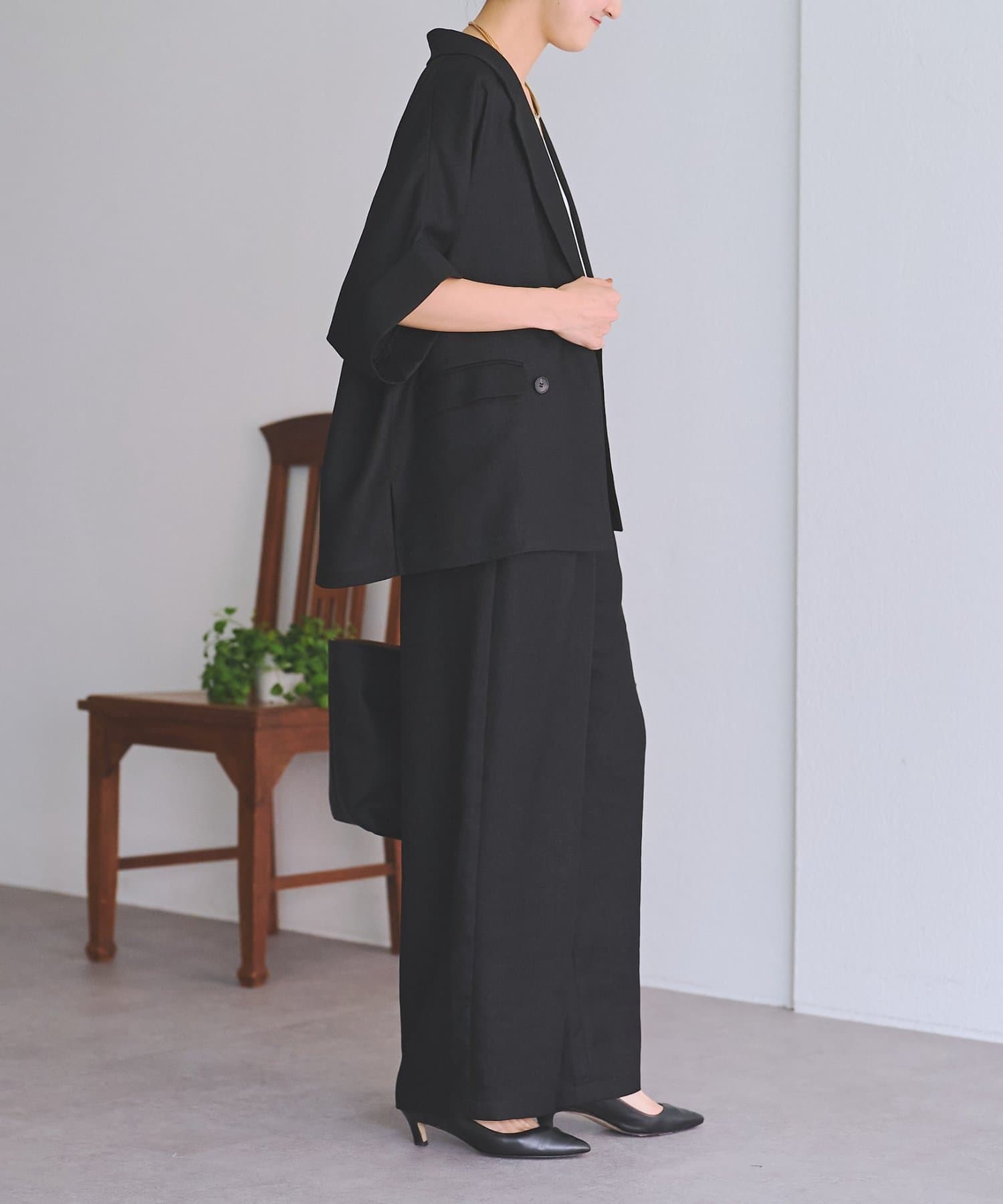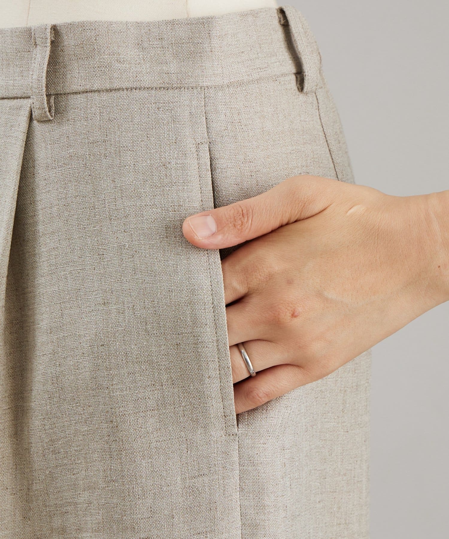 ナチュラルな表情のリネンライク素材を使用し、涼しげな生地感ですがシワになりにくくイージーケアなのも嬉しいポイント。