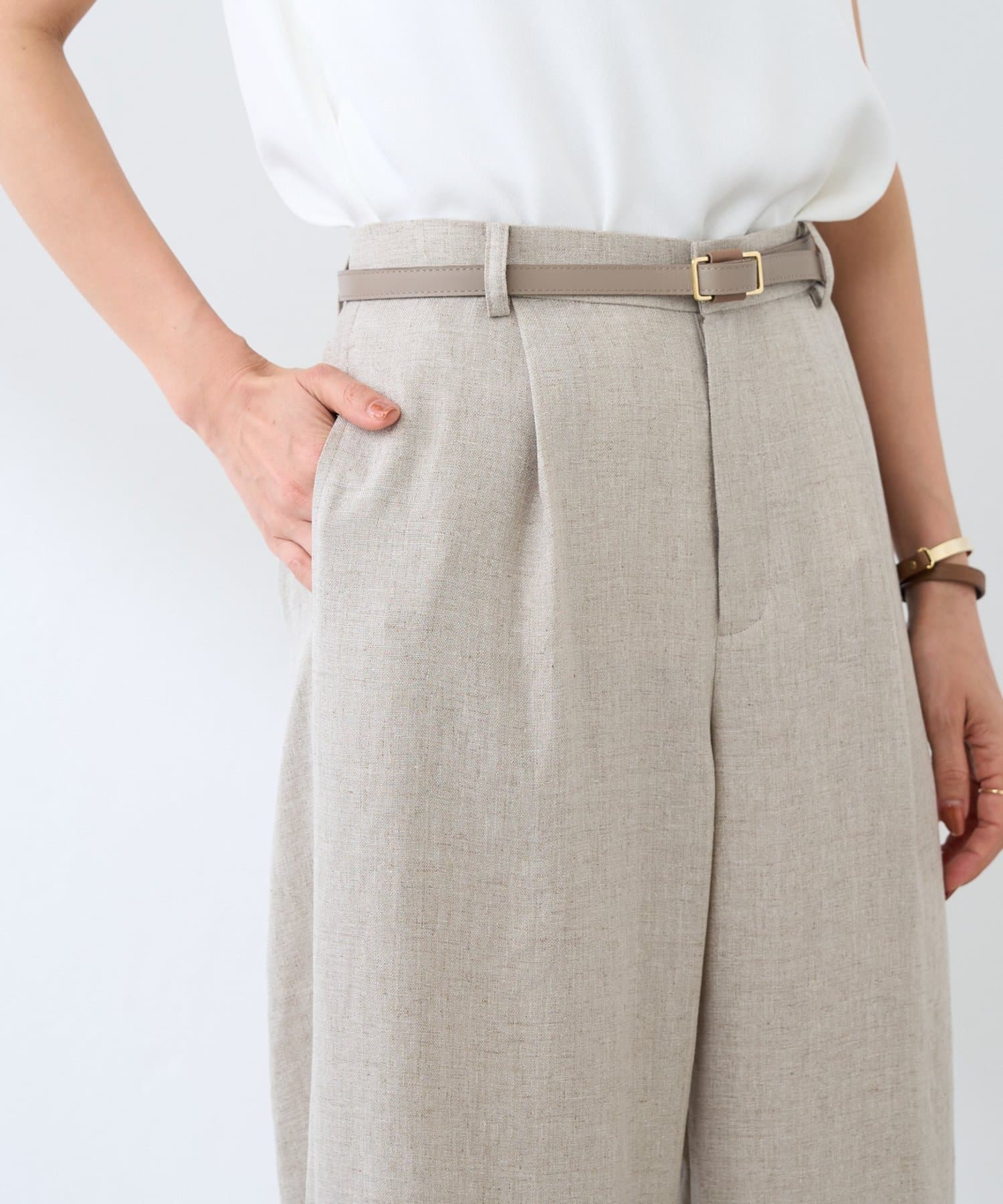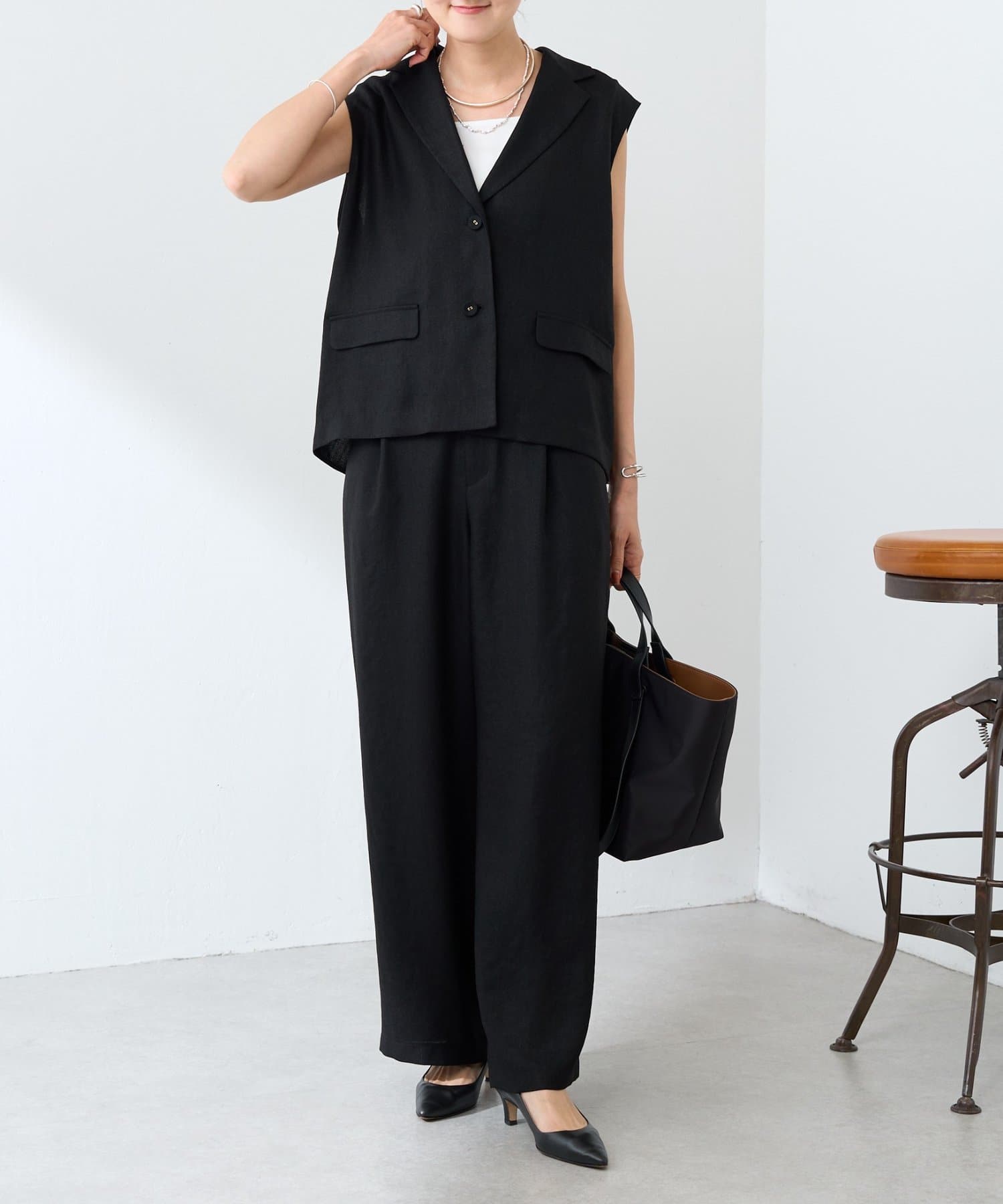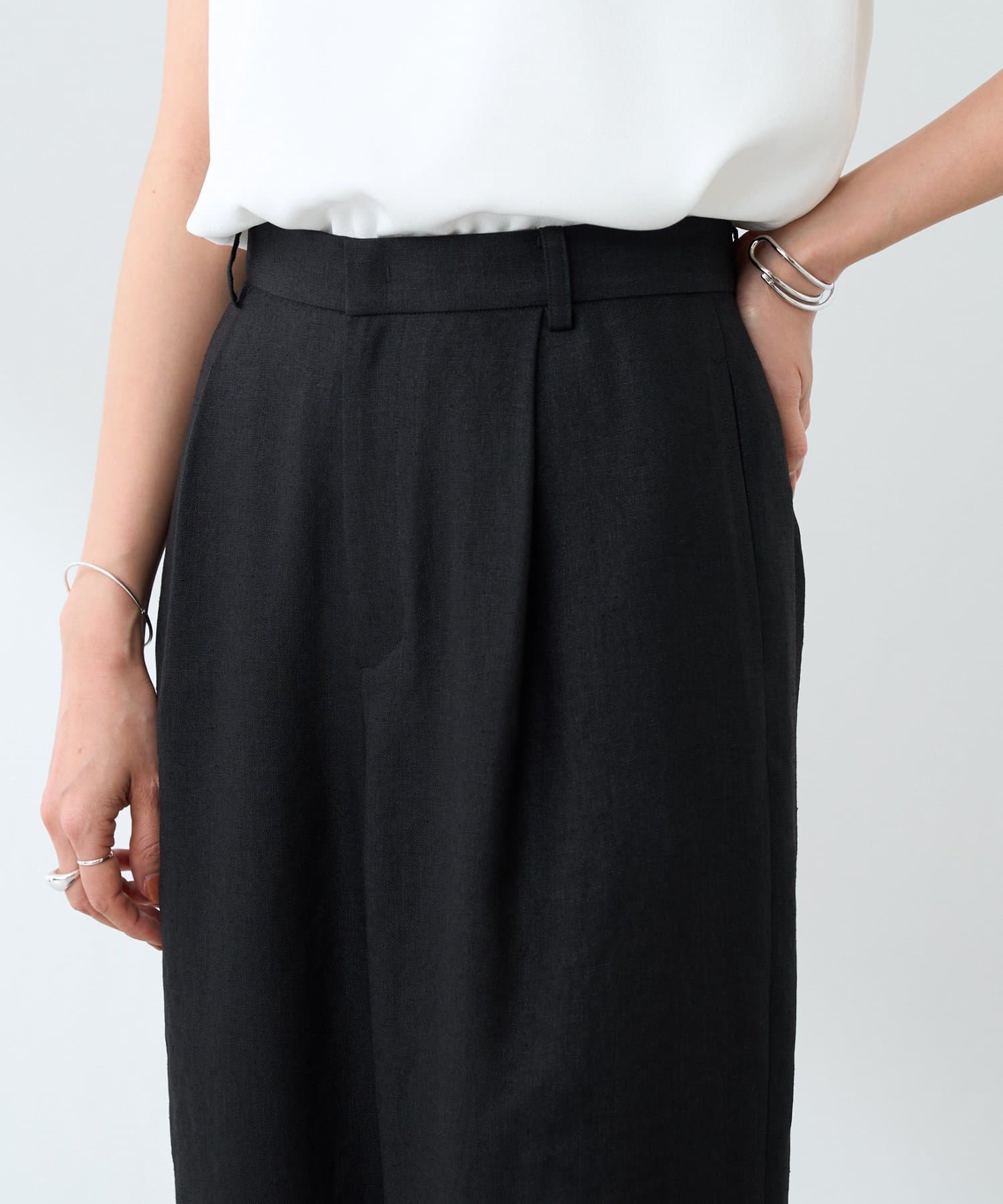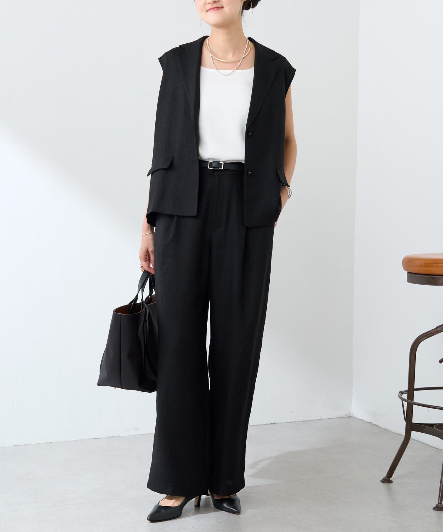 同素材のブラウスやジレと合わせたセットアップで揃えておくと暑い時期にコーデに悩まない"カセット服"として重宝しますし、