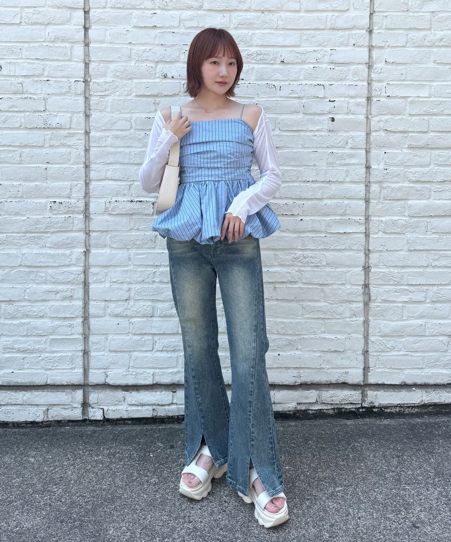 ・ボトムスはワイドデニムパンツや、ストレートスカートと相性◎