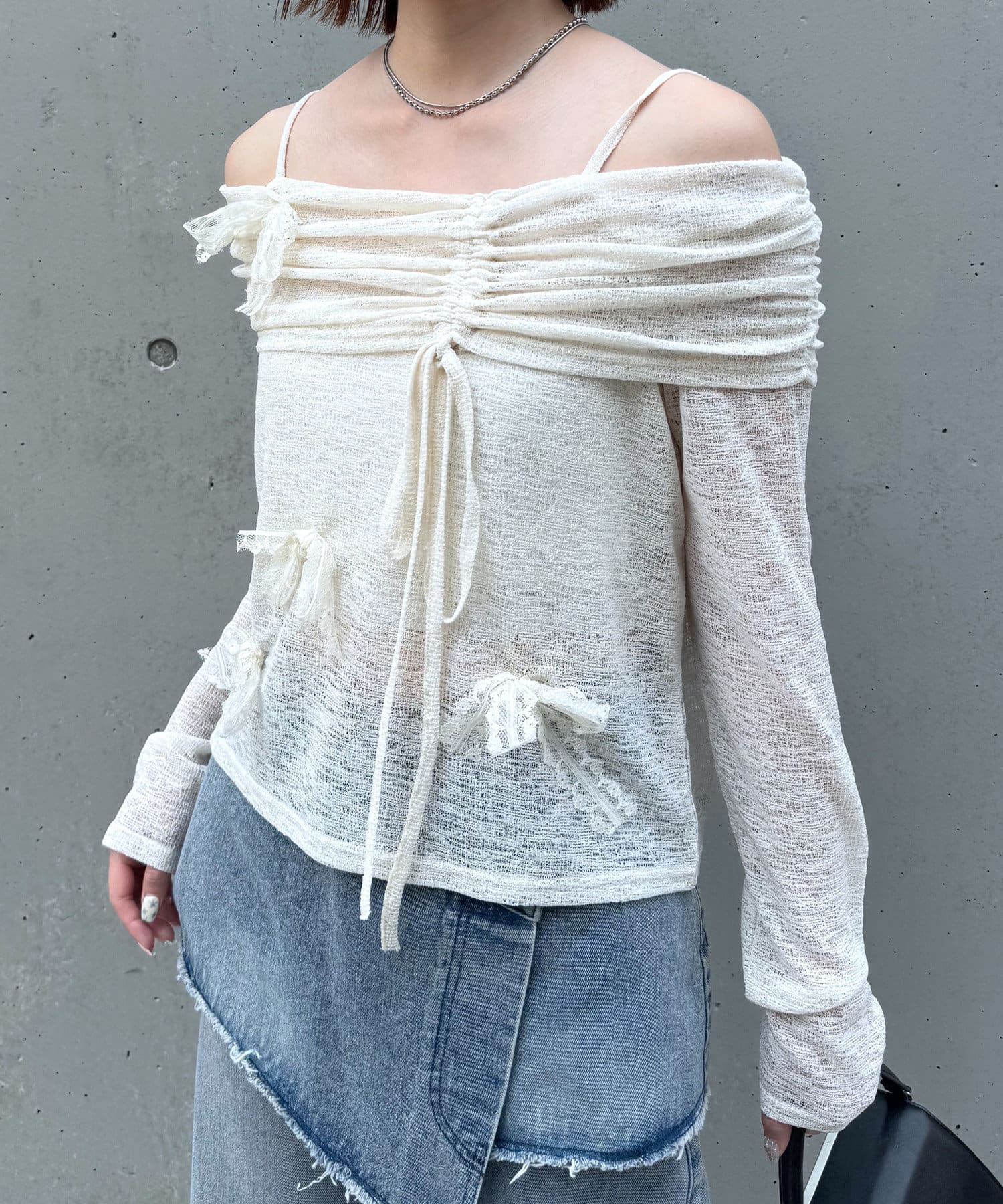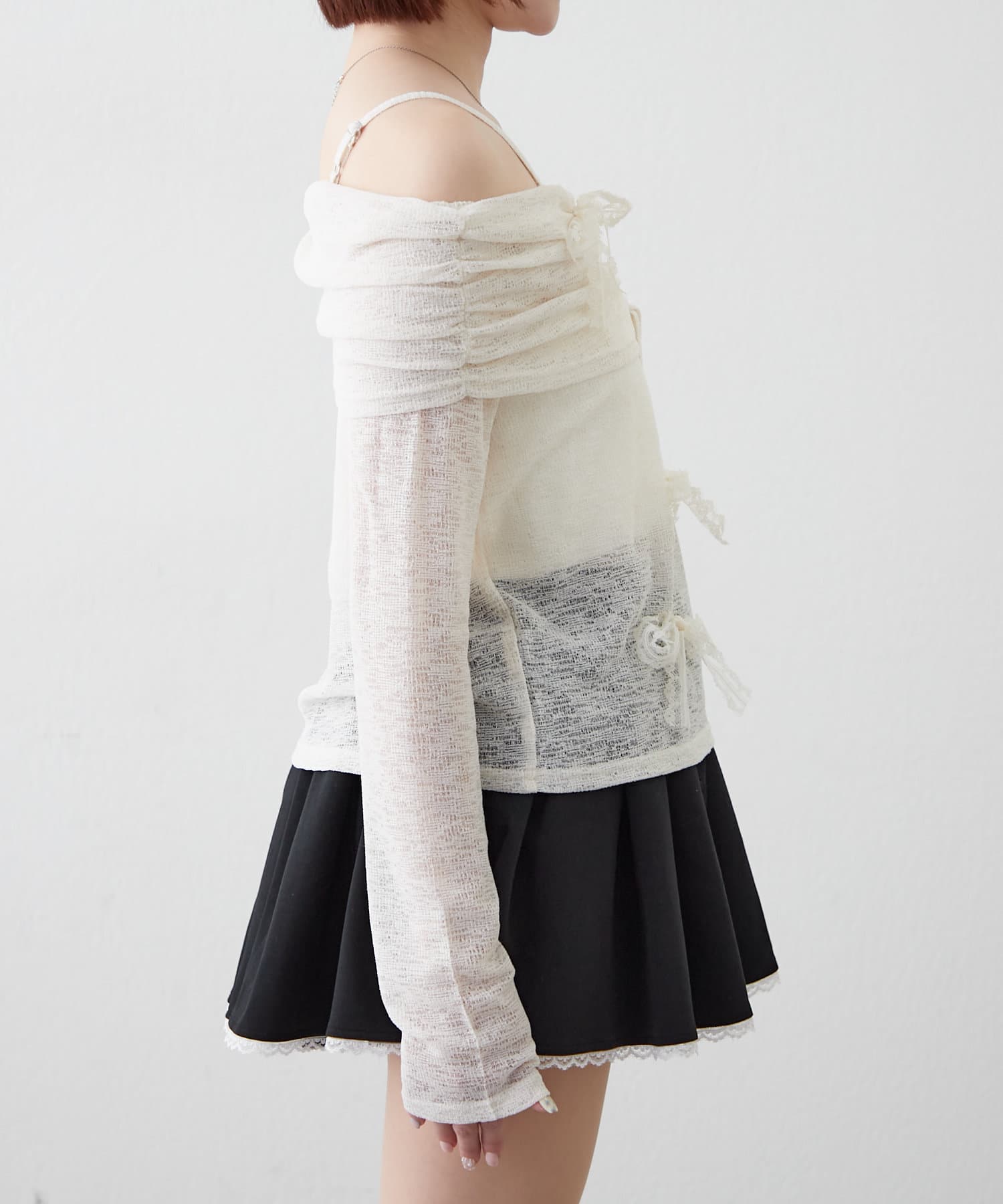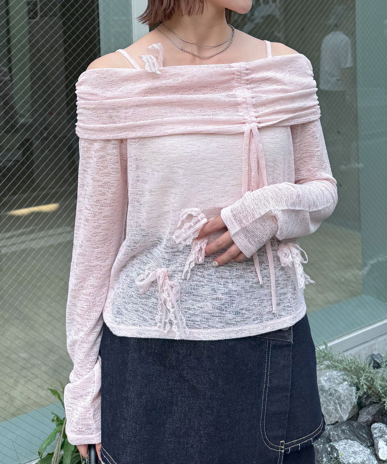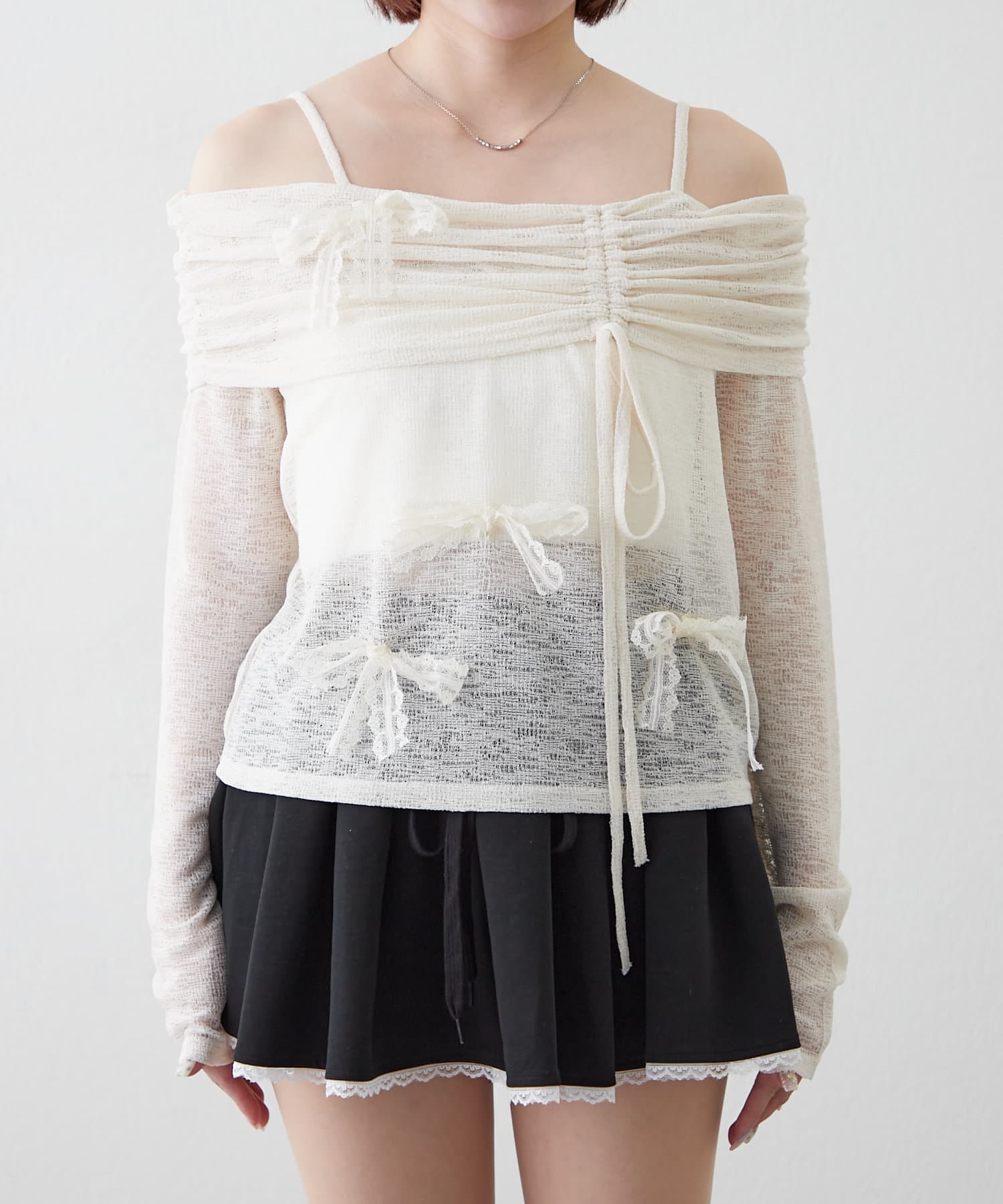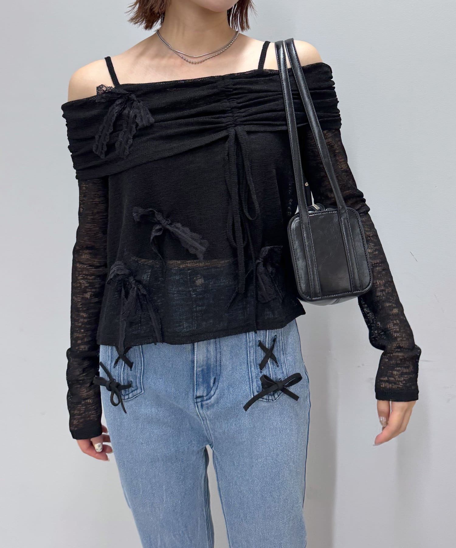 シアー素材で抜け感がありながら、ポイントのリボンとオフショルで女子っぽいブラウス。