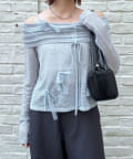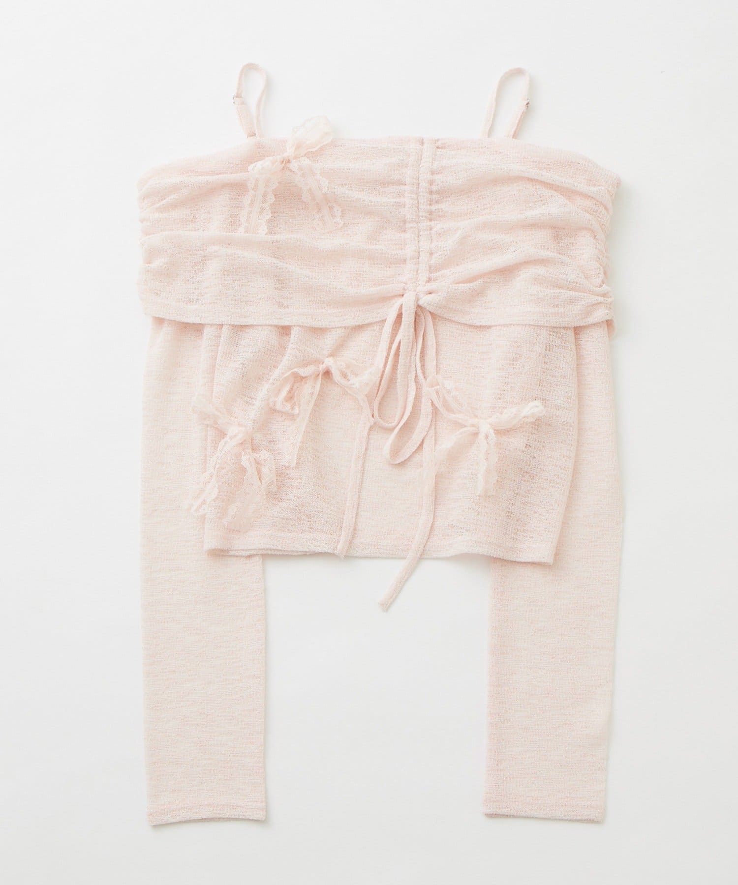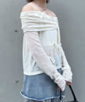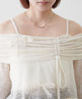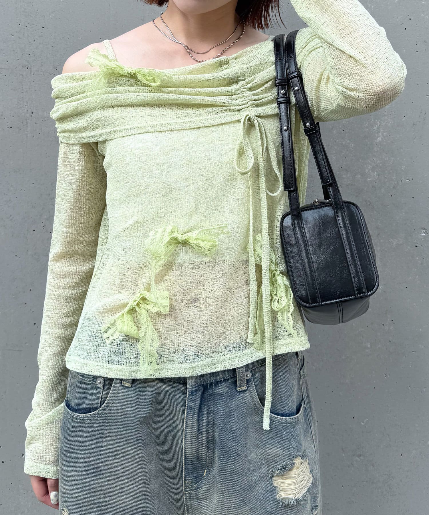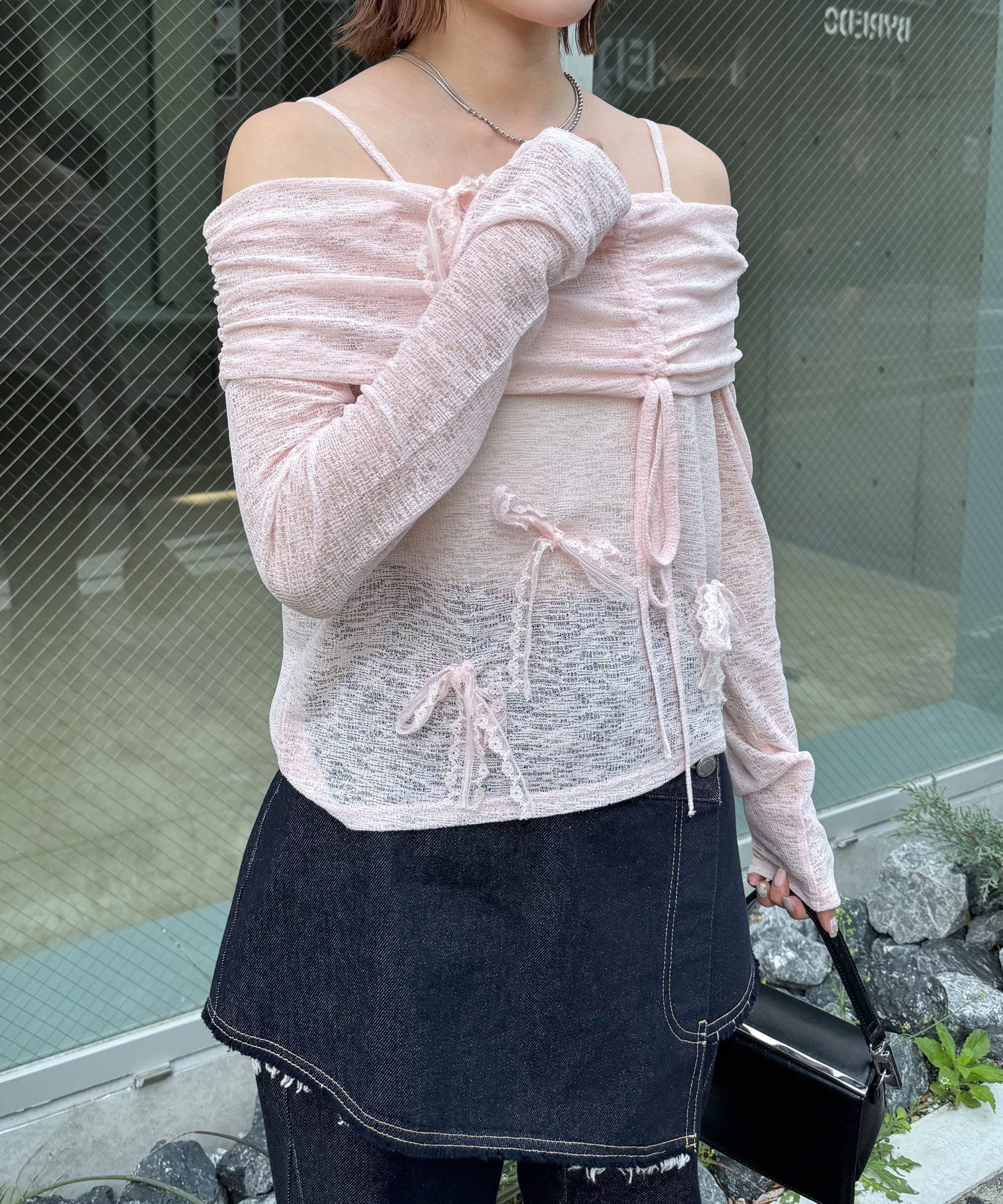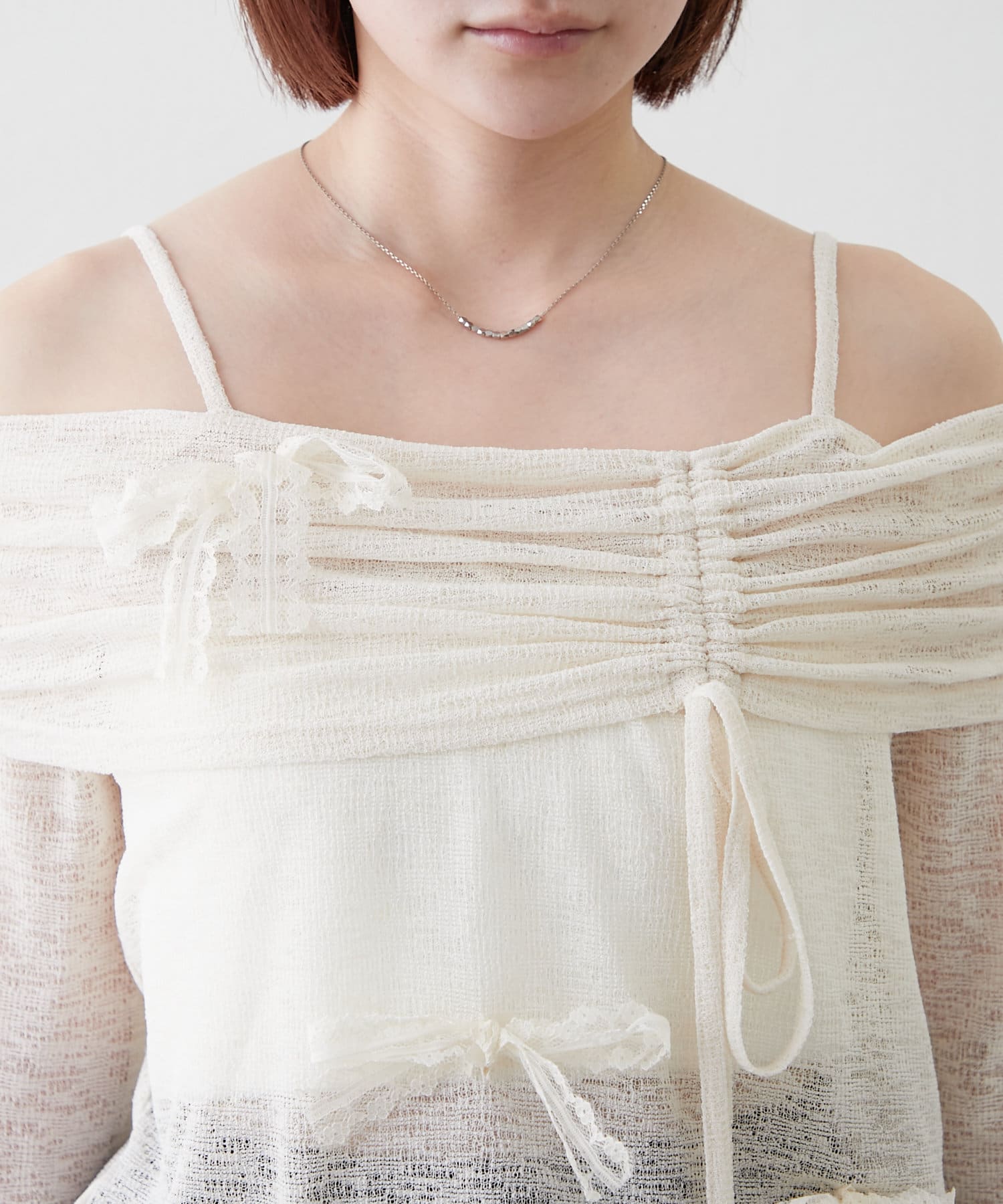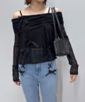 シアー素材で抜け感がありながら、ポイントのリボンとオフショルで女子っぽいブラウス。