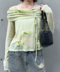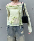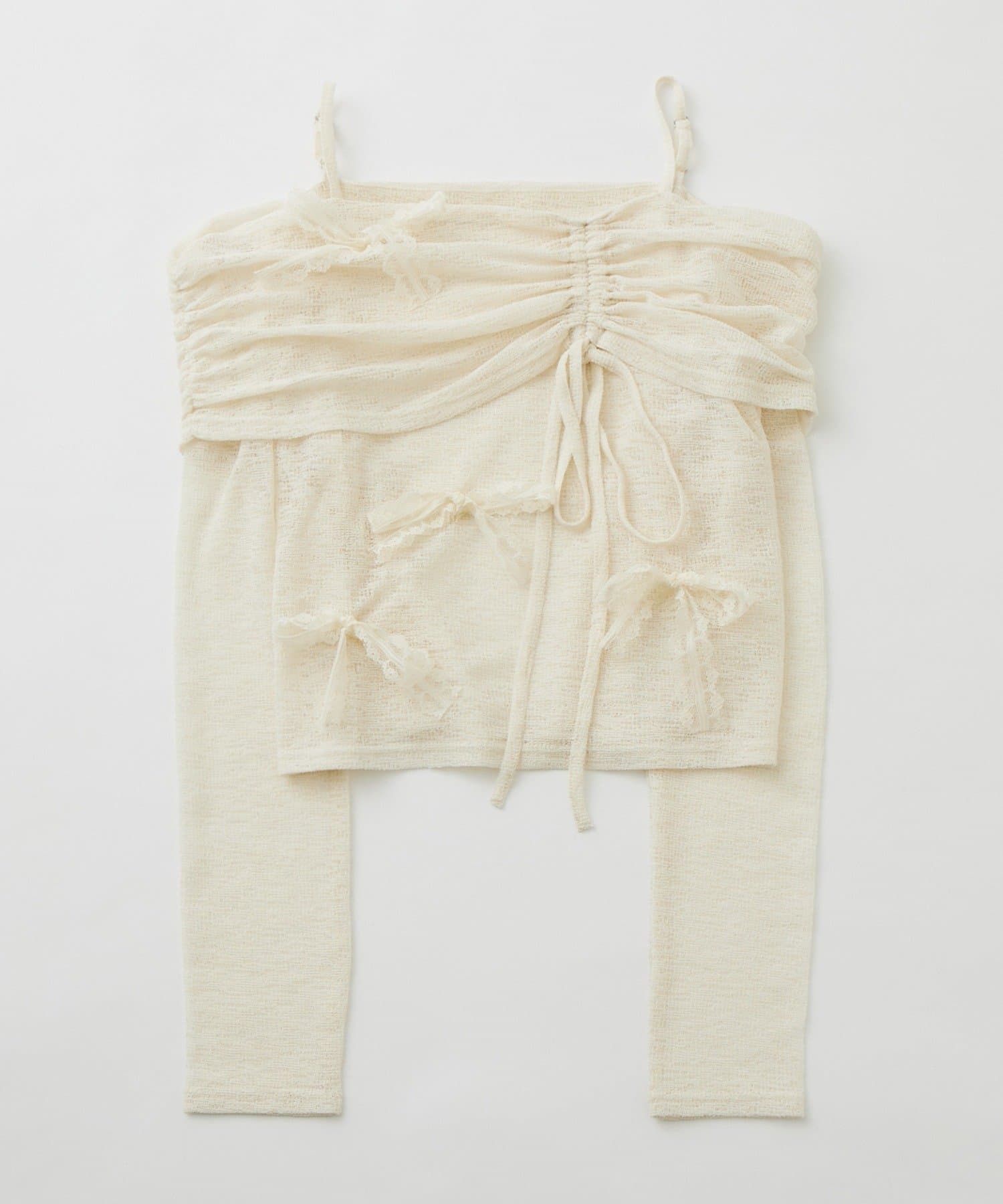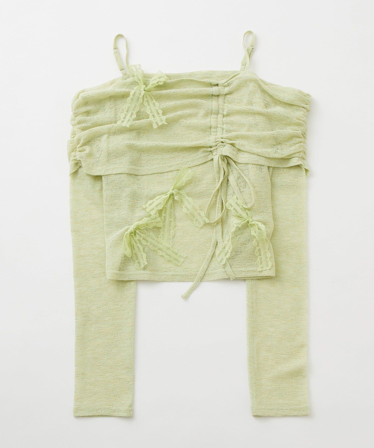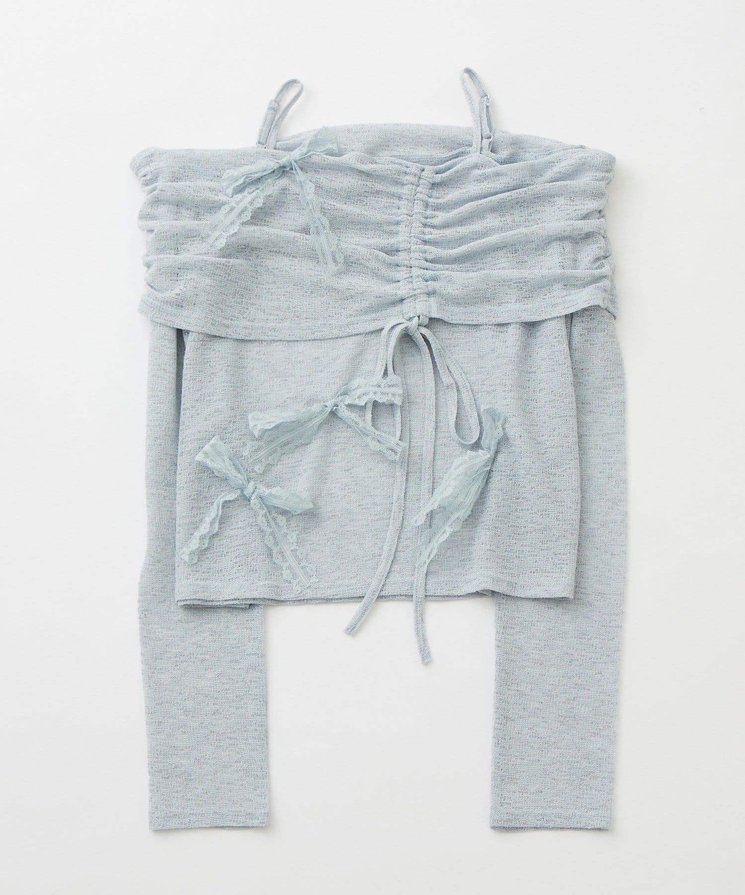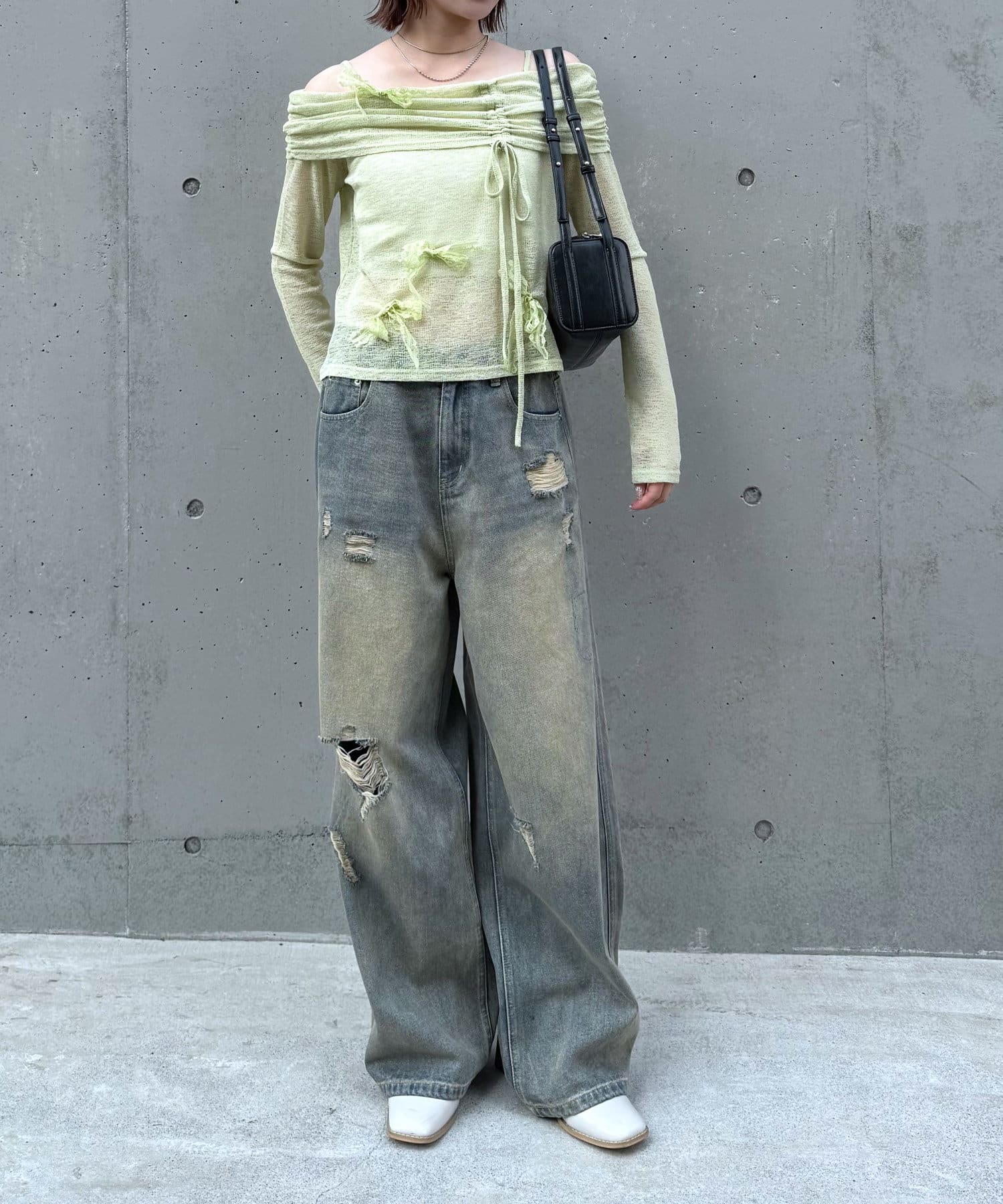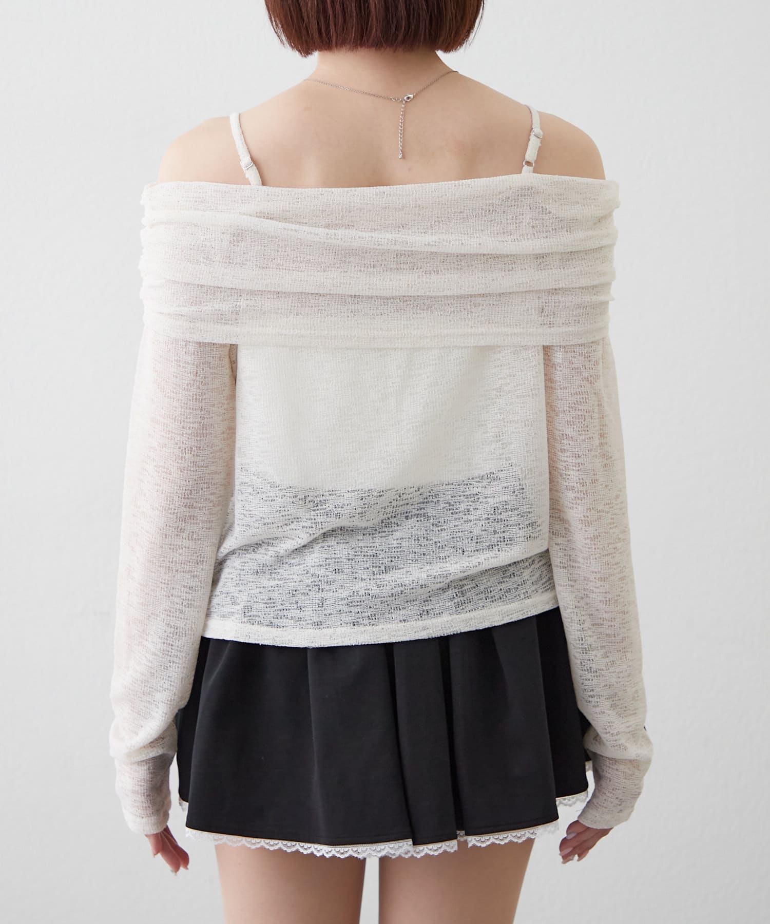 シアー素材で抜け感がありながら、ポイントのリボンとオフショルで女子っぽいブラウス。
