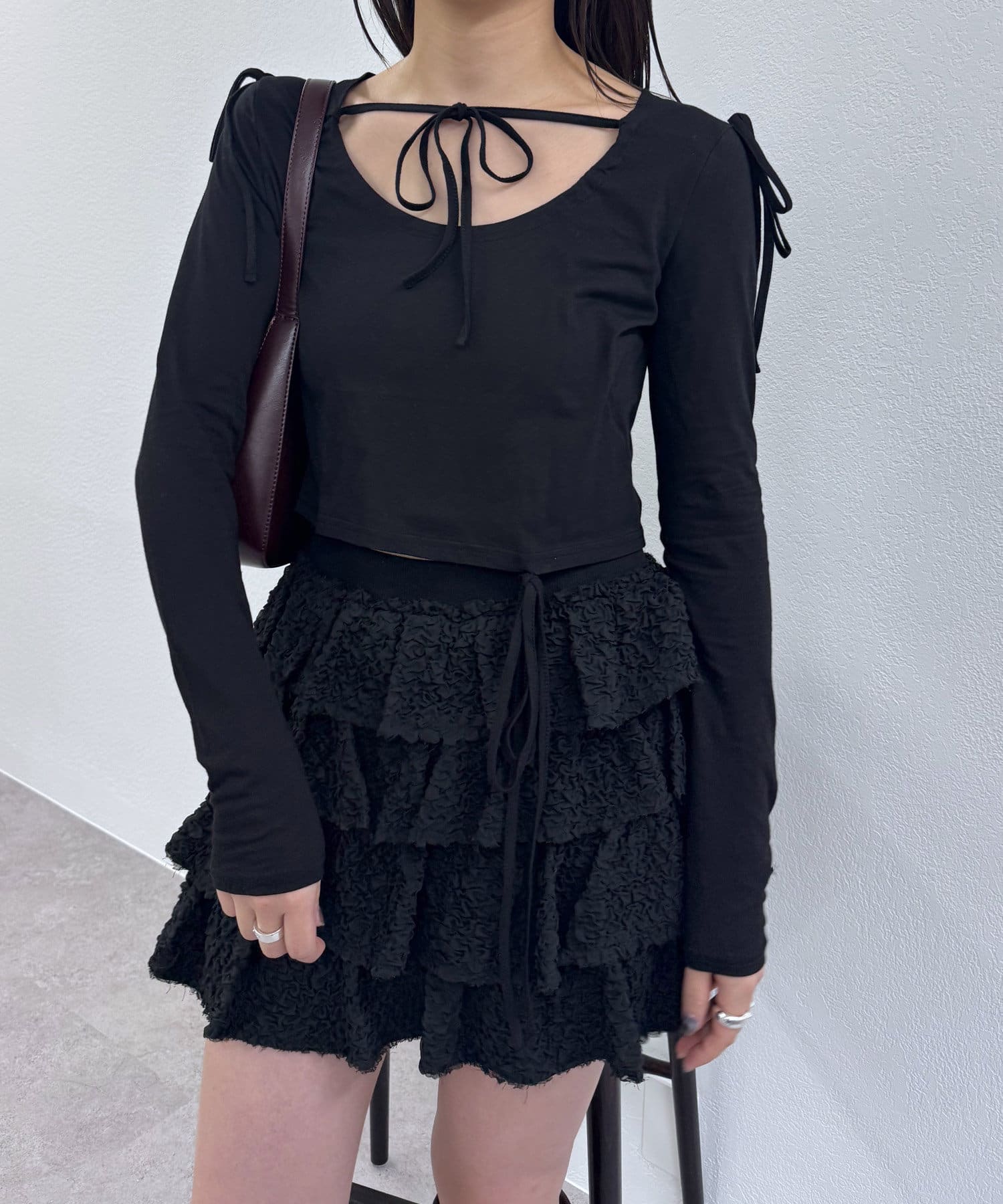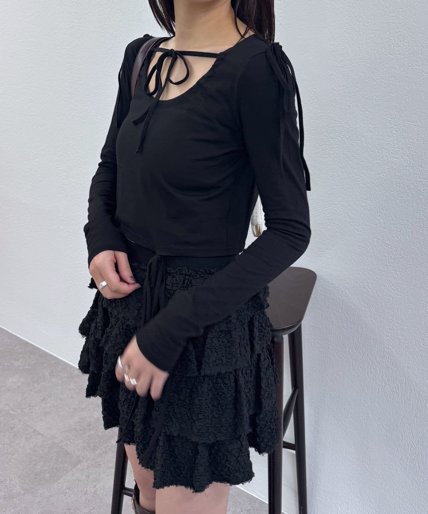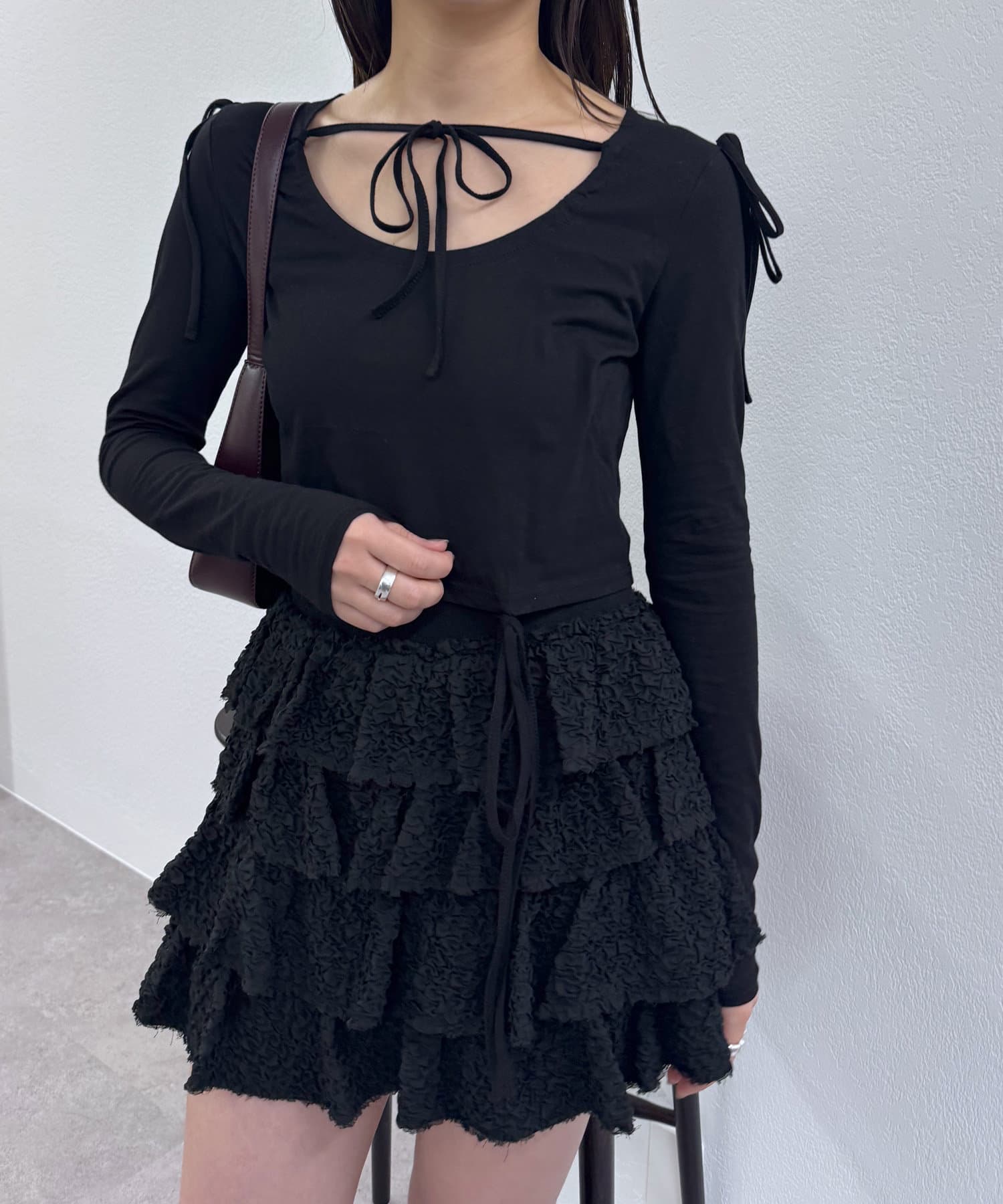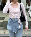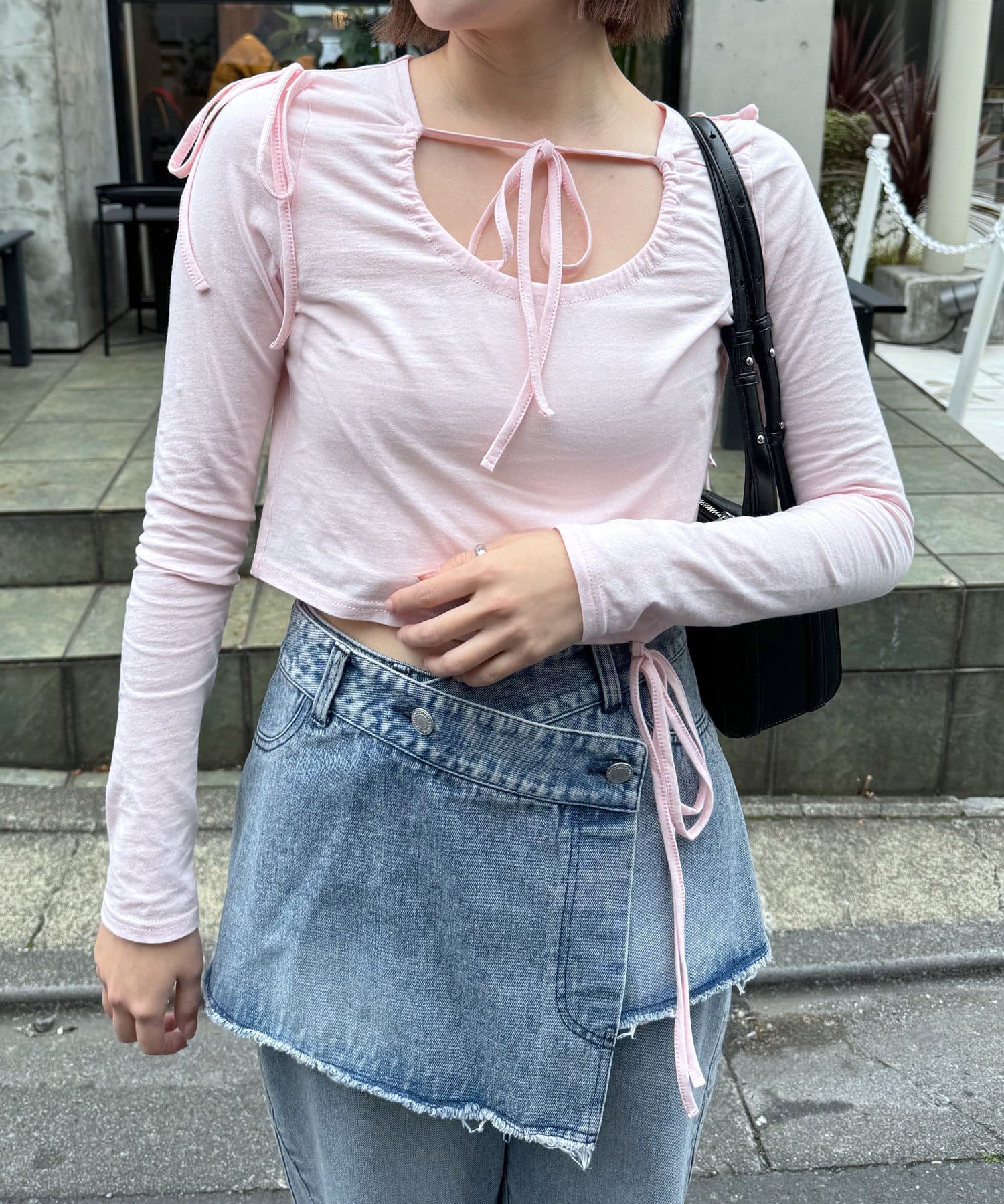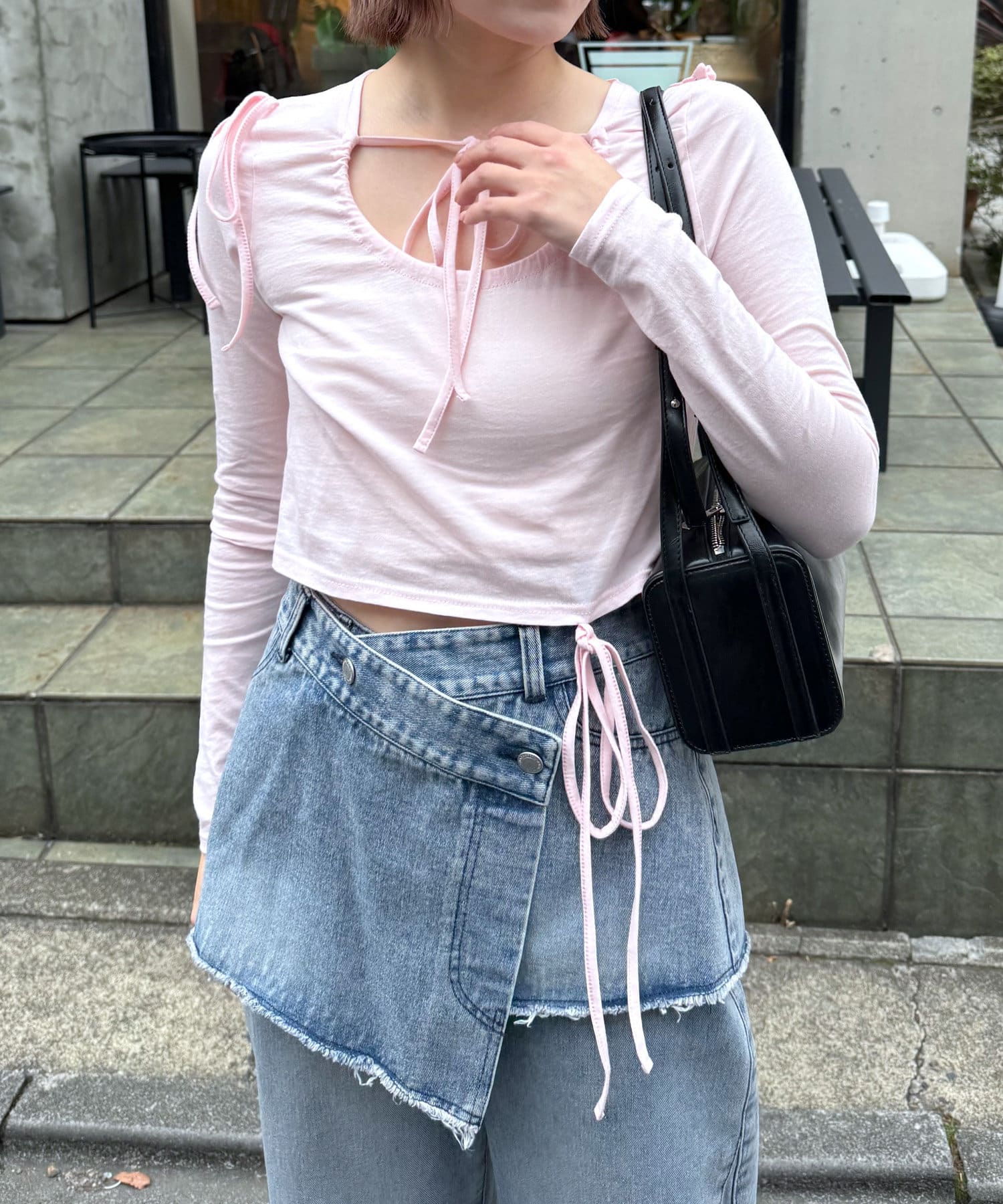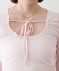 首元のギャザーで女子っぽい肌見せをしてくれるTシャツ。