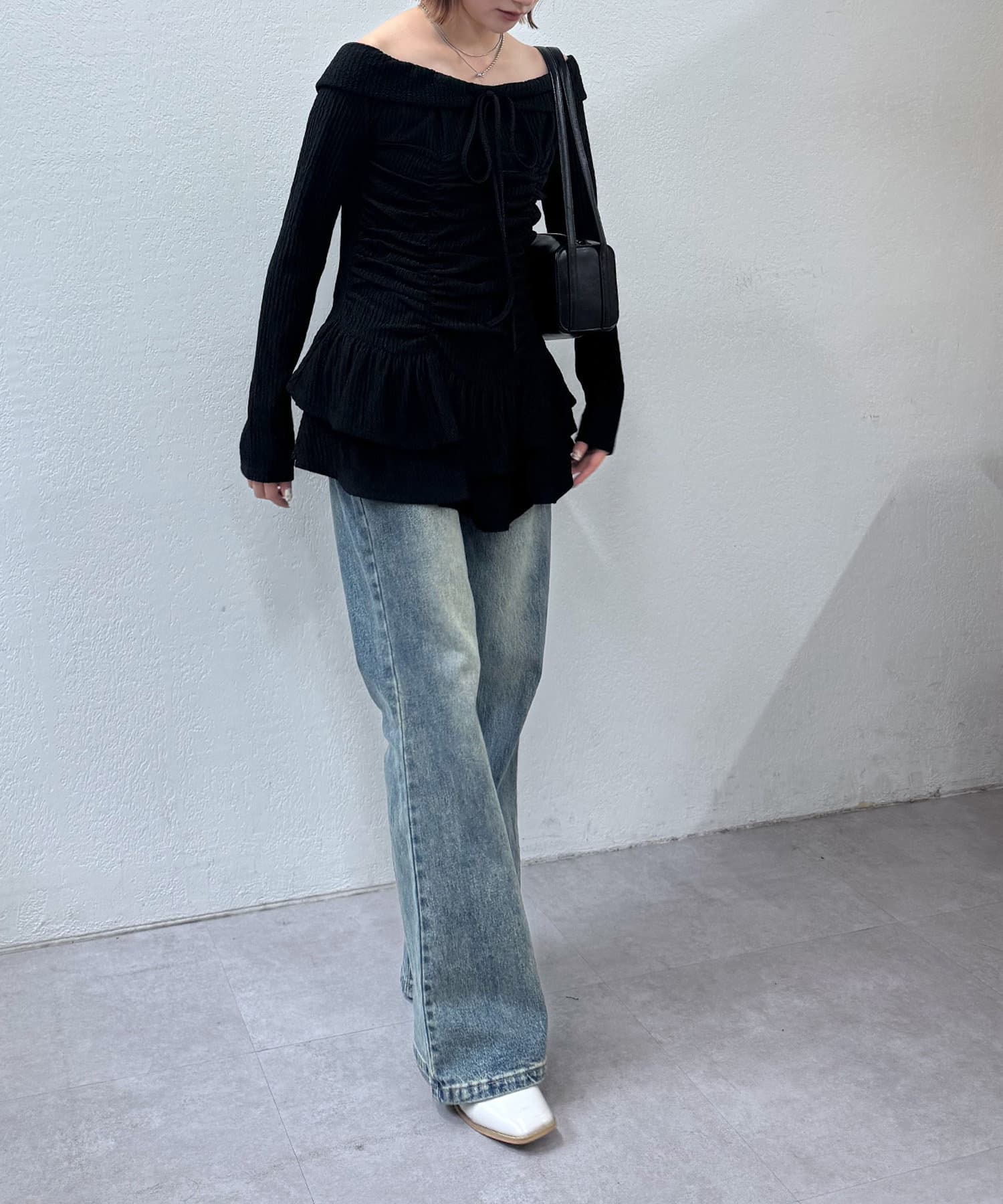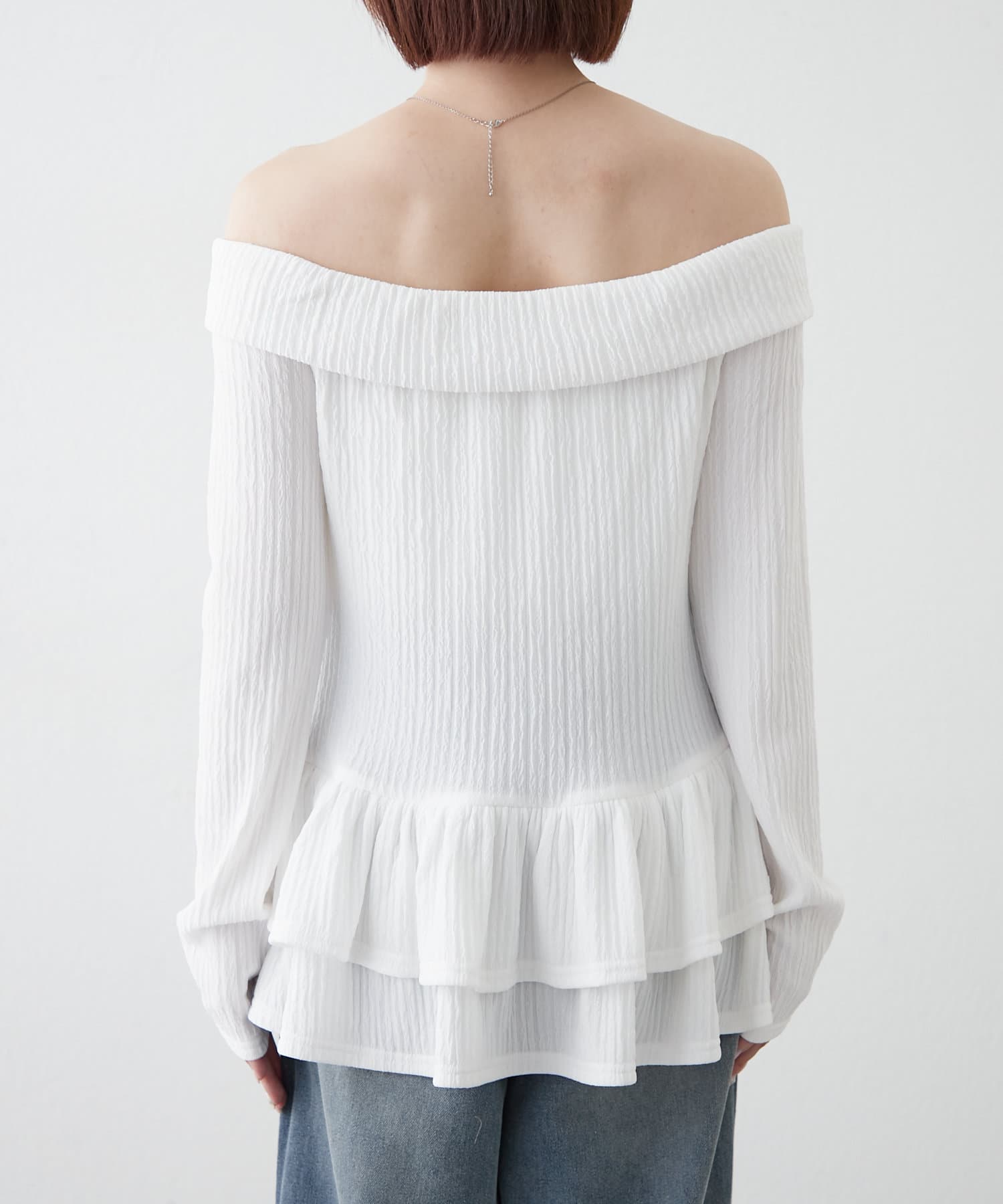 ・さりげない肩見せがポイント◎デコルテや肩のラインが見えるため、首回りがスッキリとして見えます。