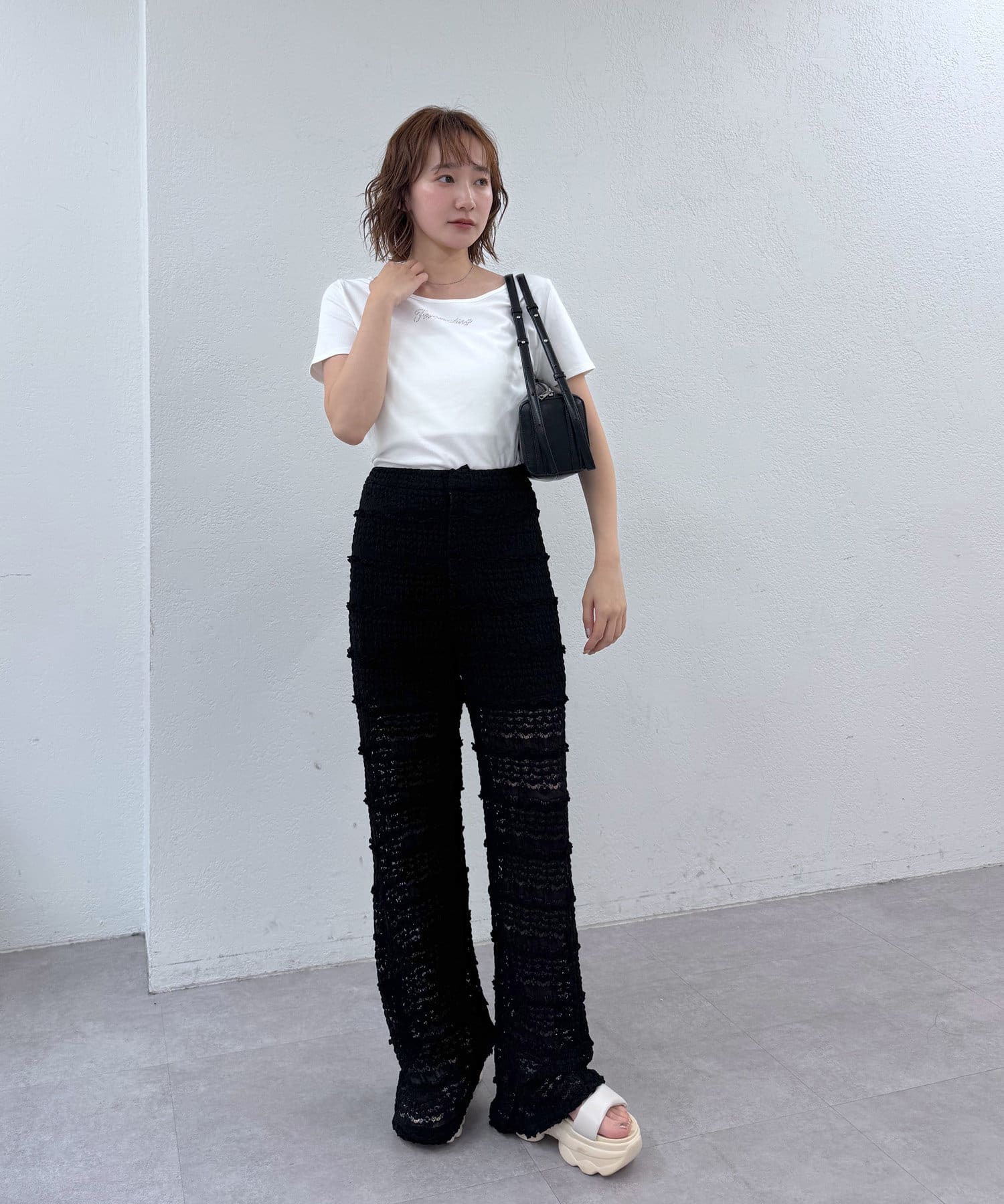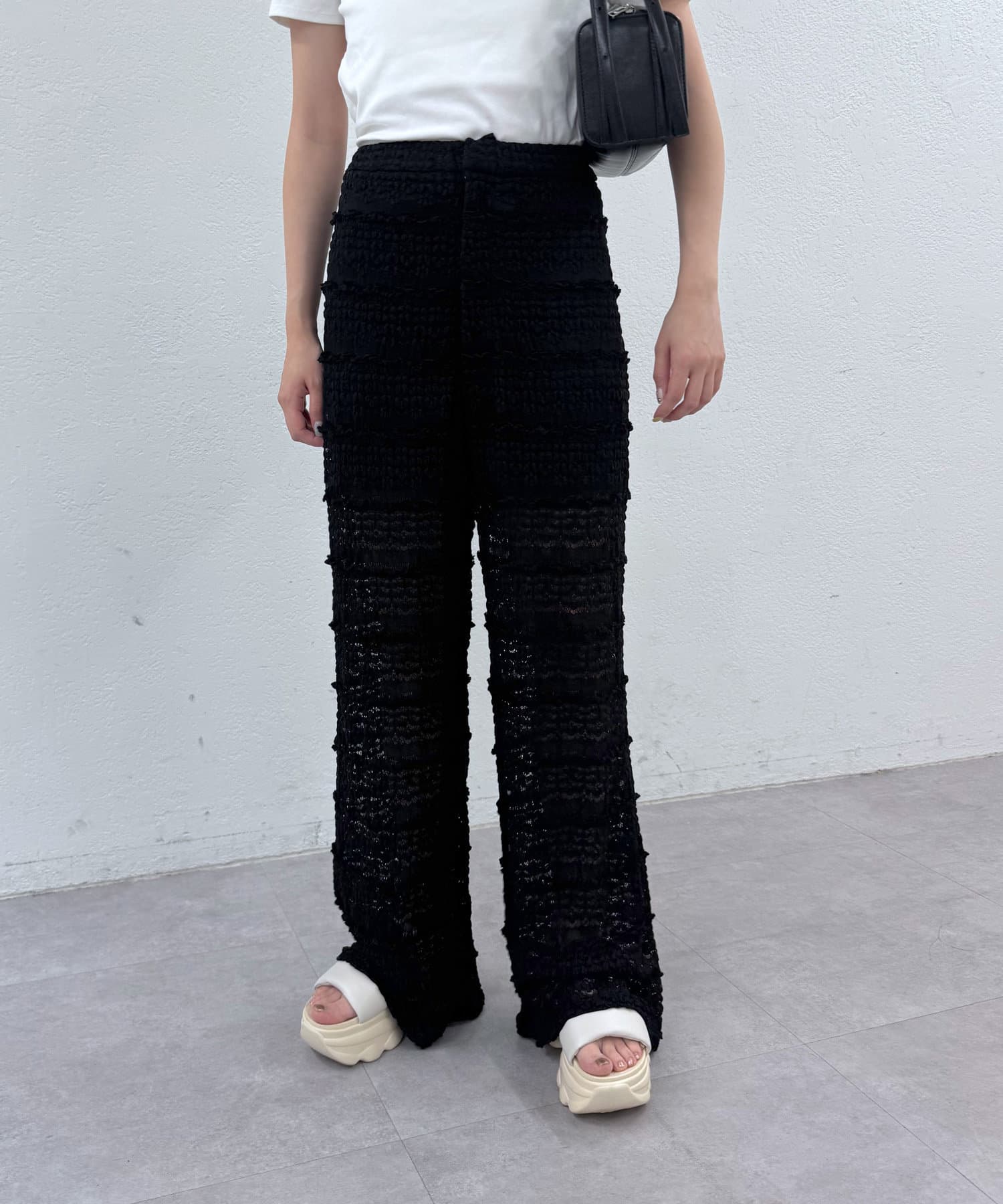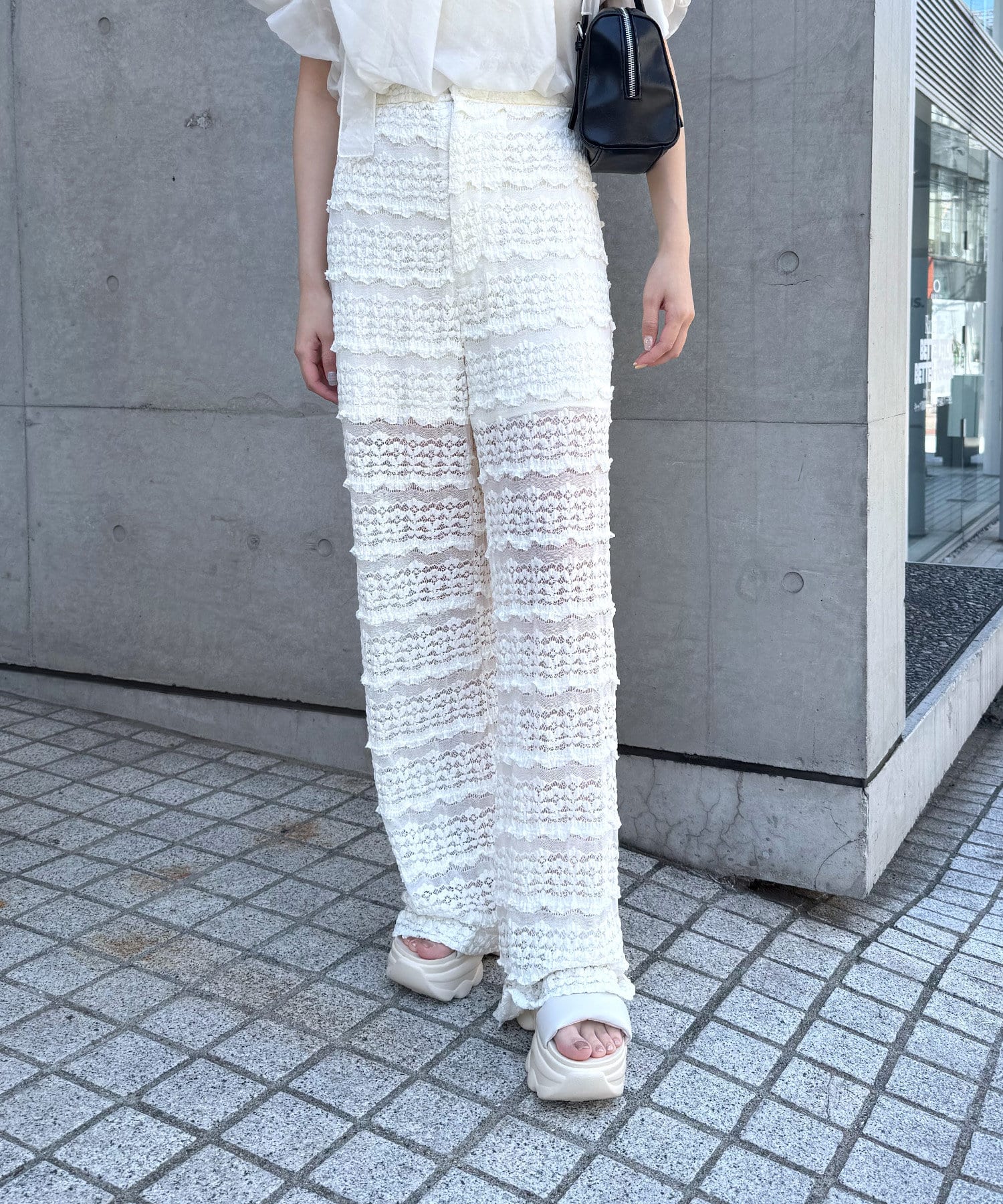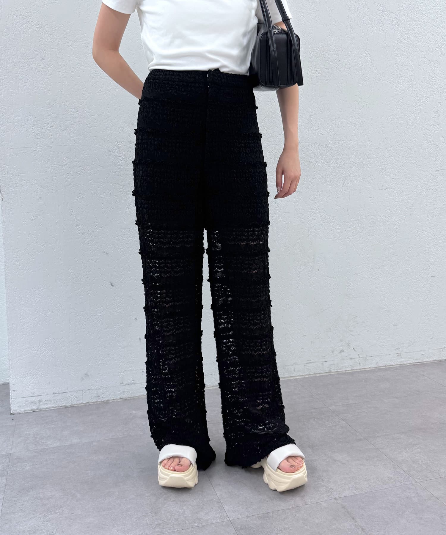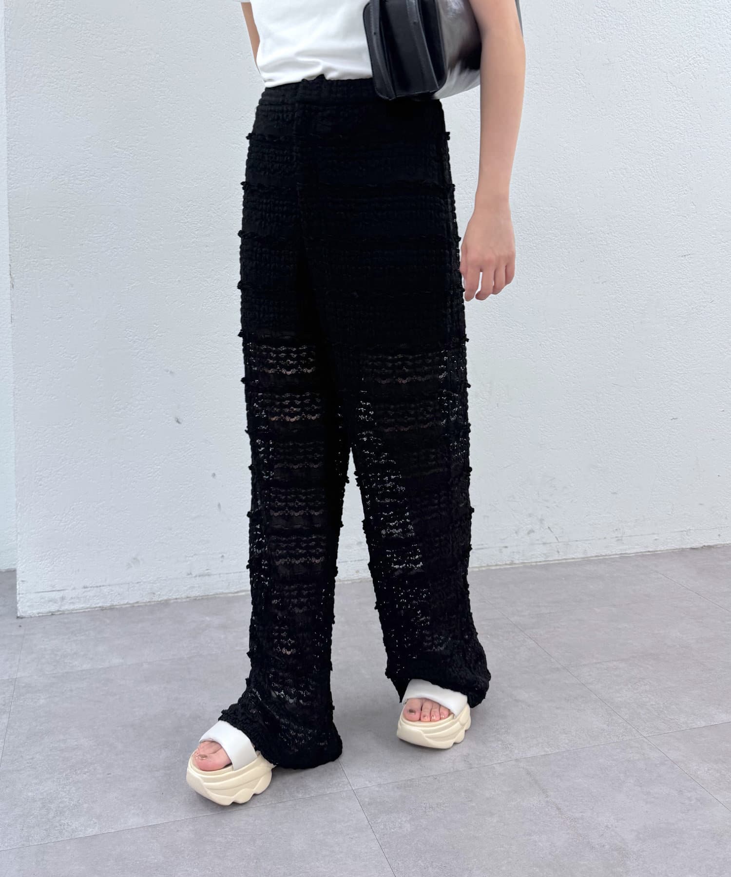 ・ストレートシルエットで足のラインを美しく見せつつ、透け感のある素材が軽やかな印象をプラス。