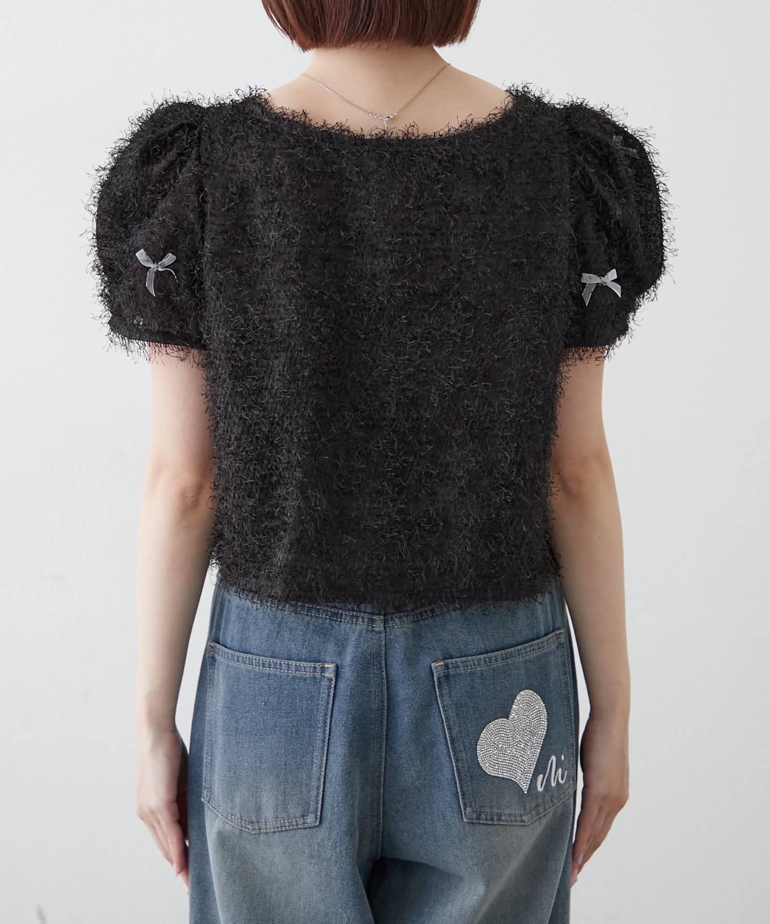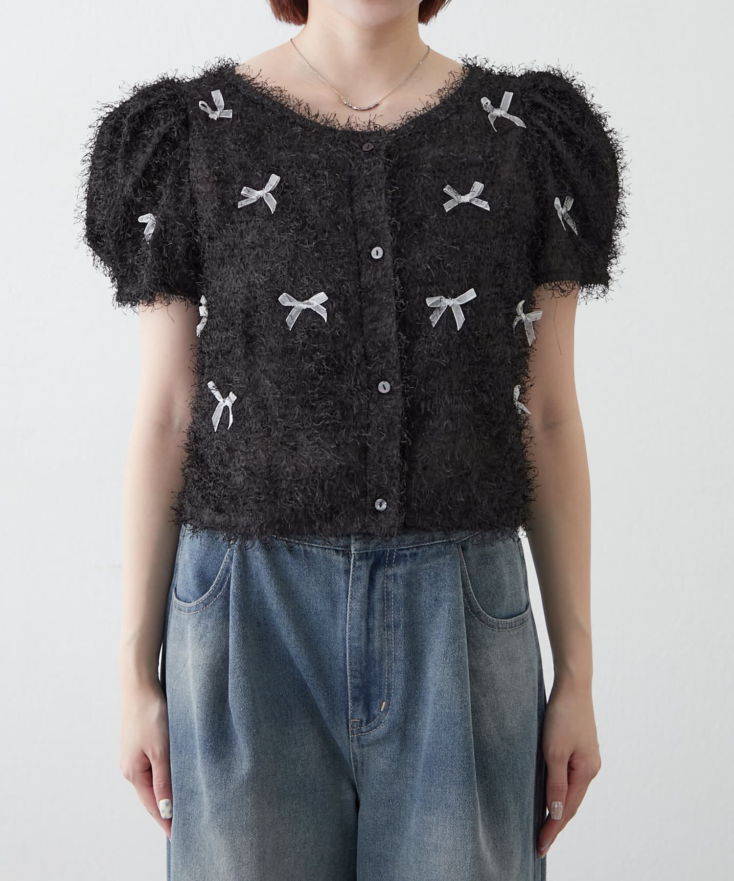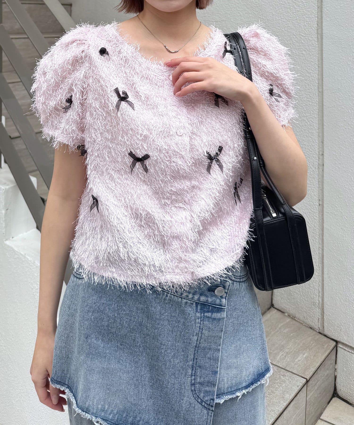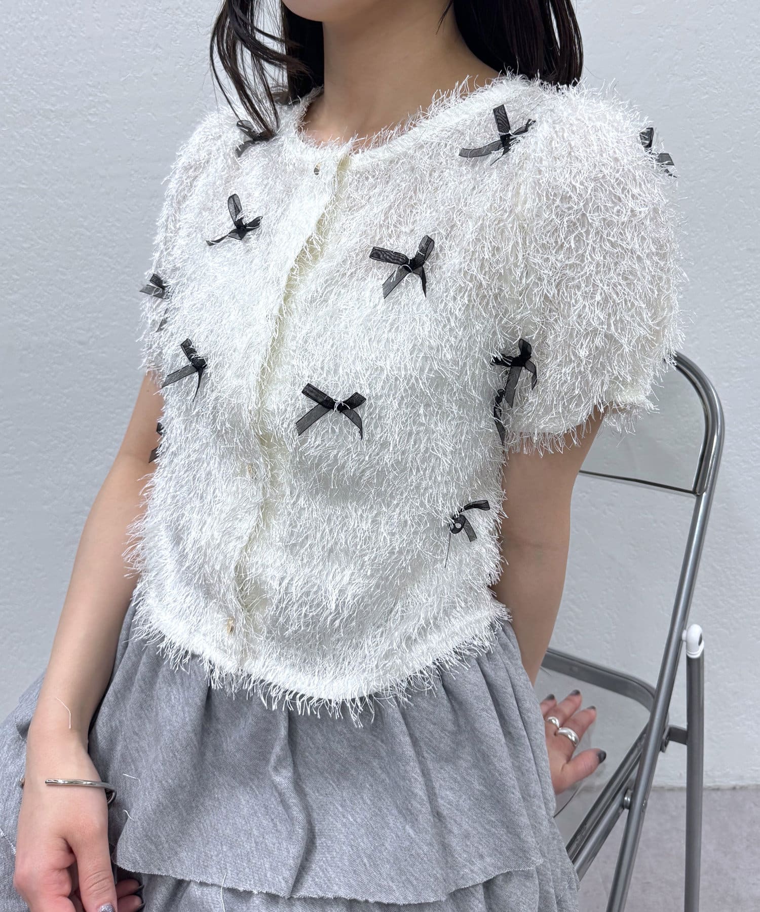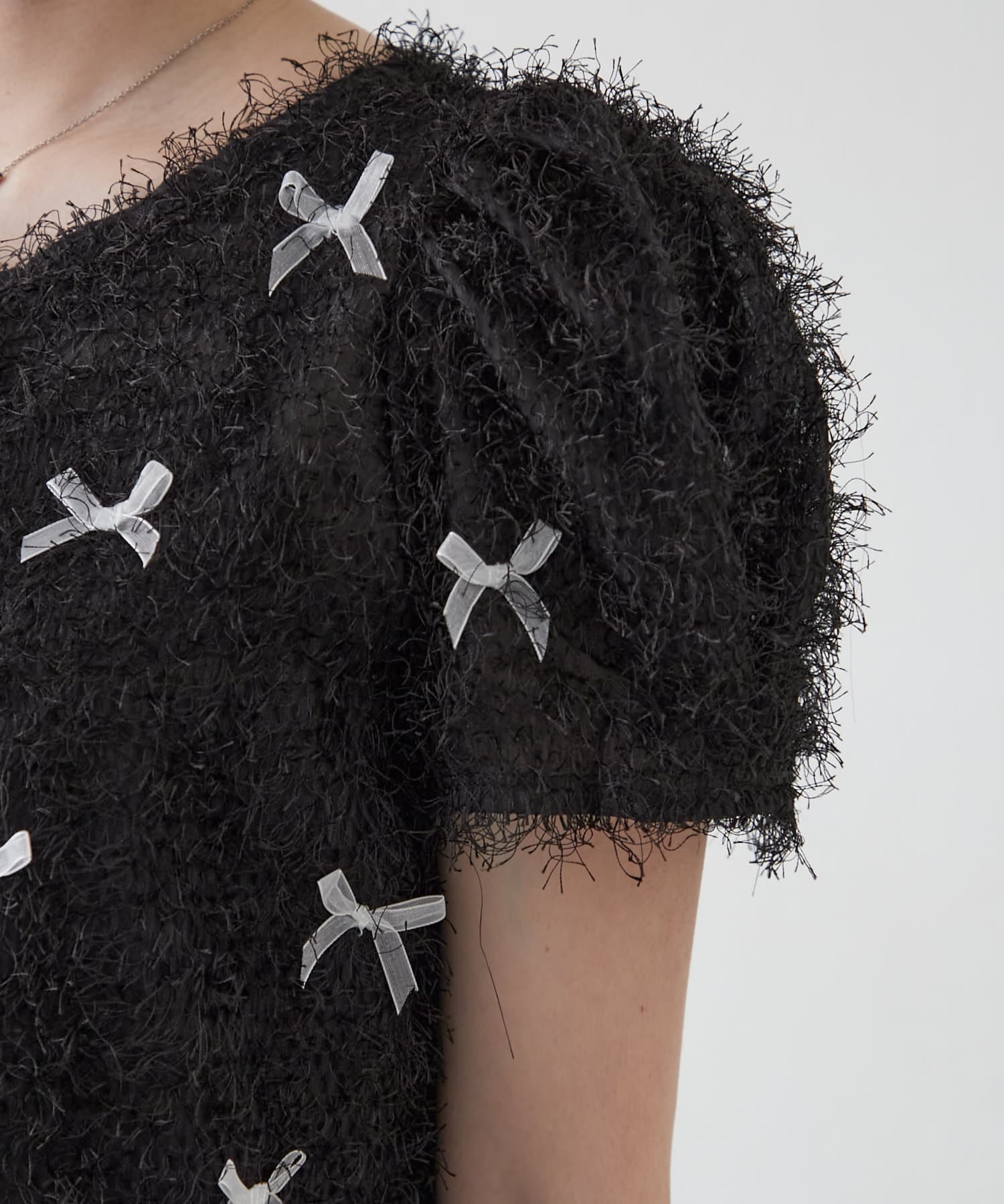 シャギー素材にミニリボンがちりばめられたブラウス。