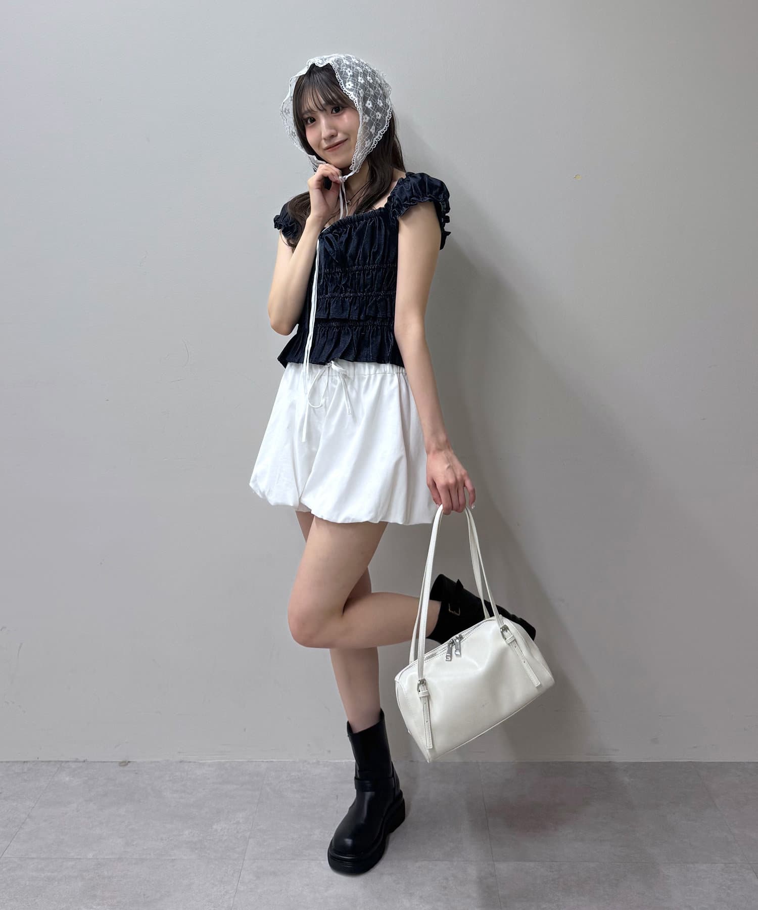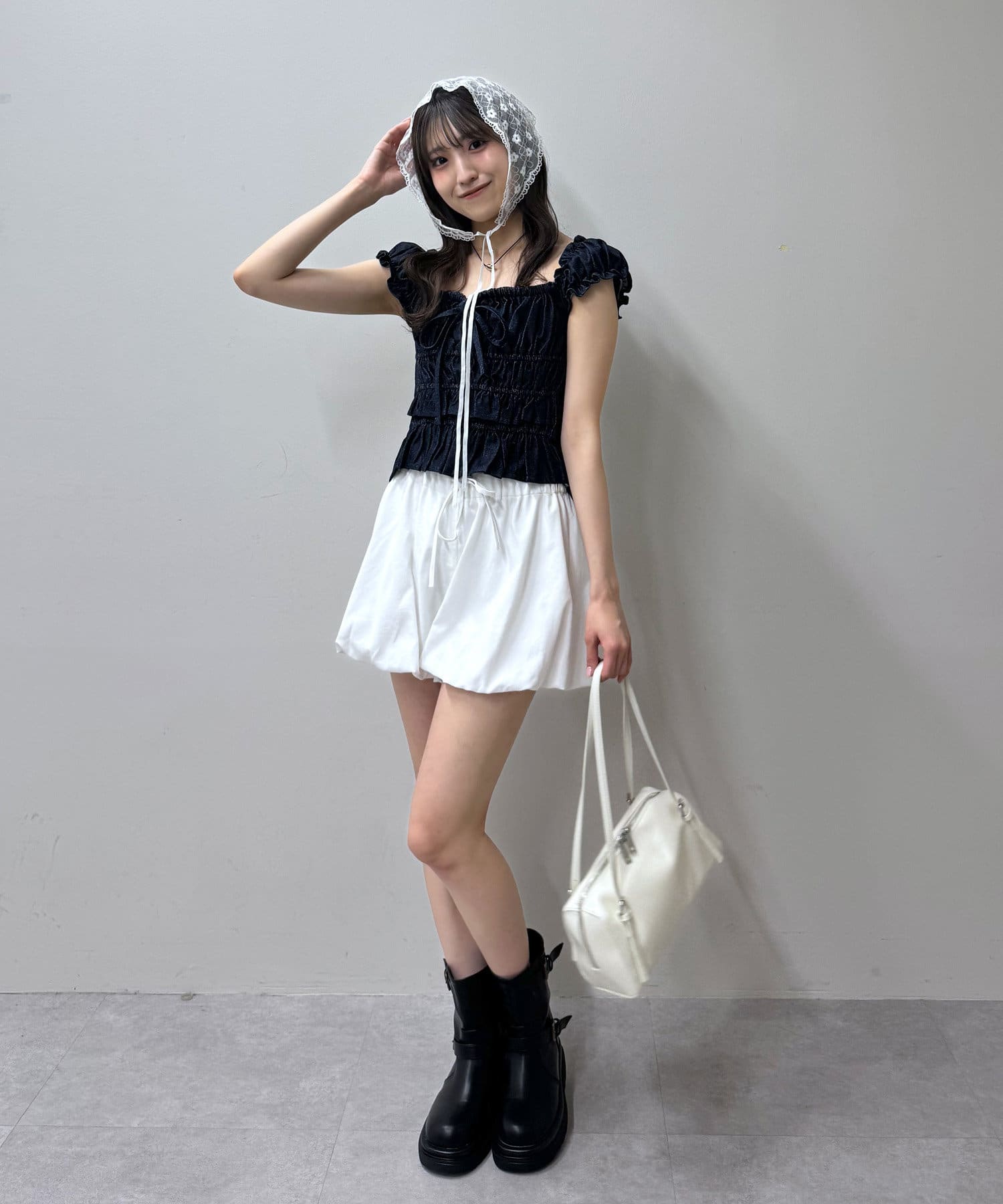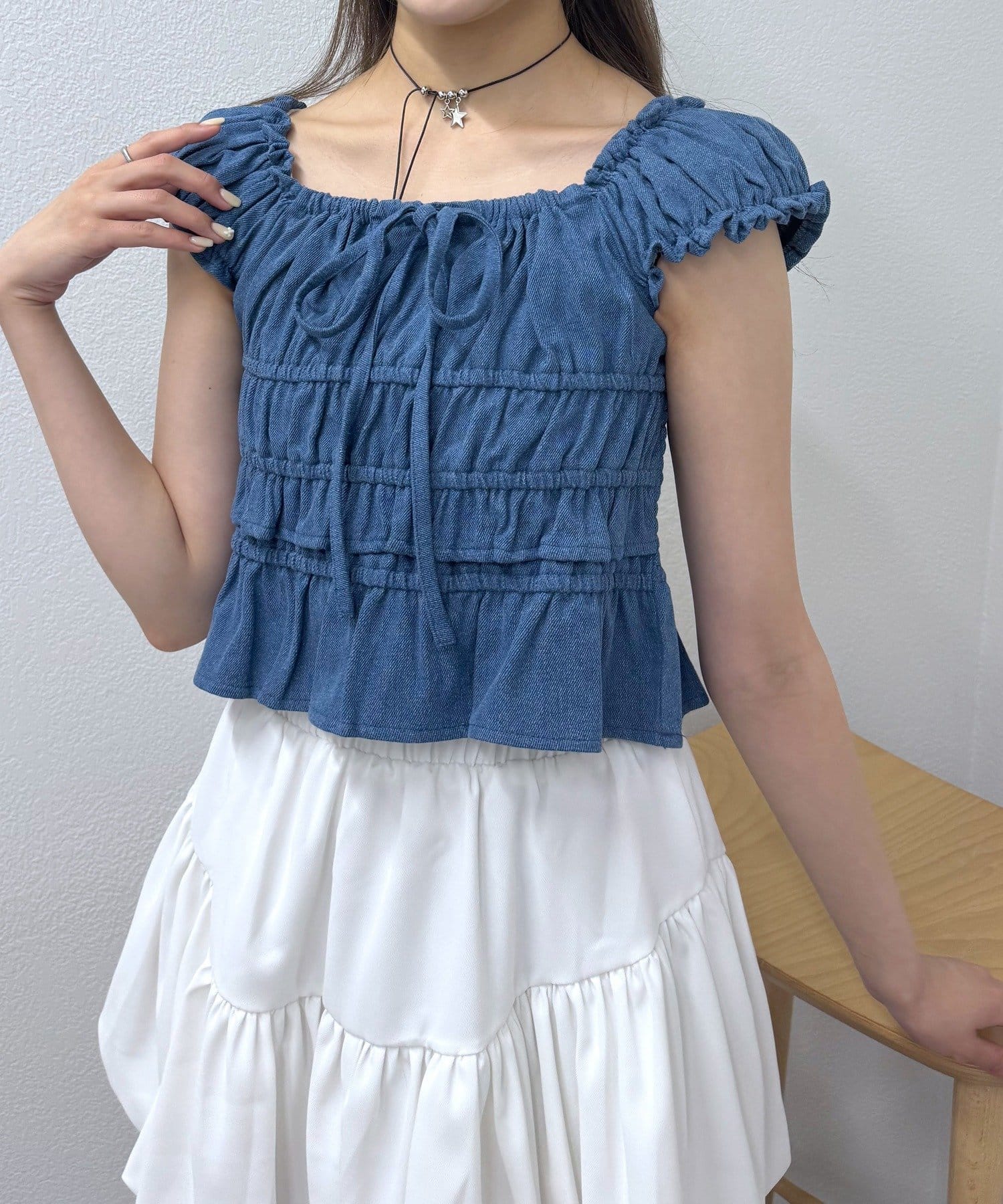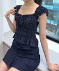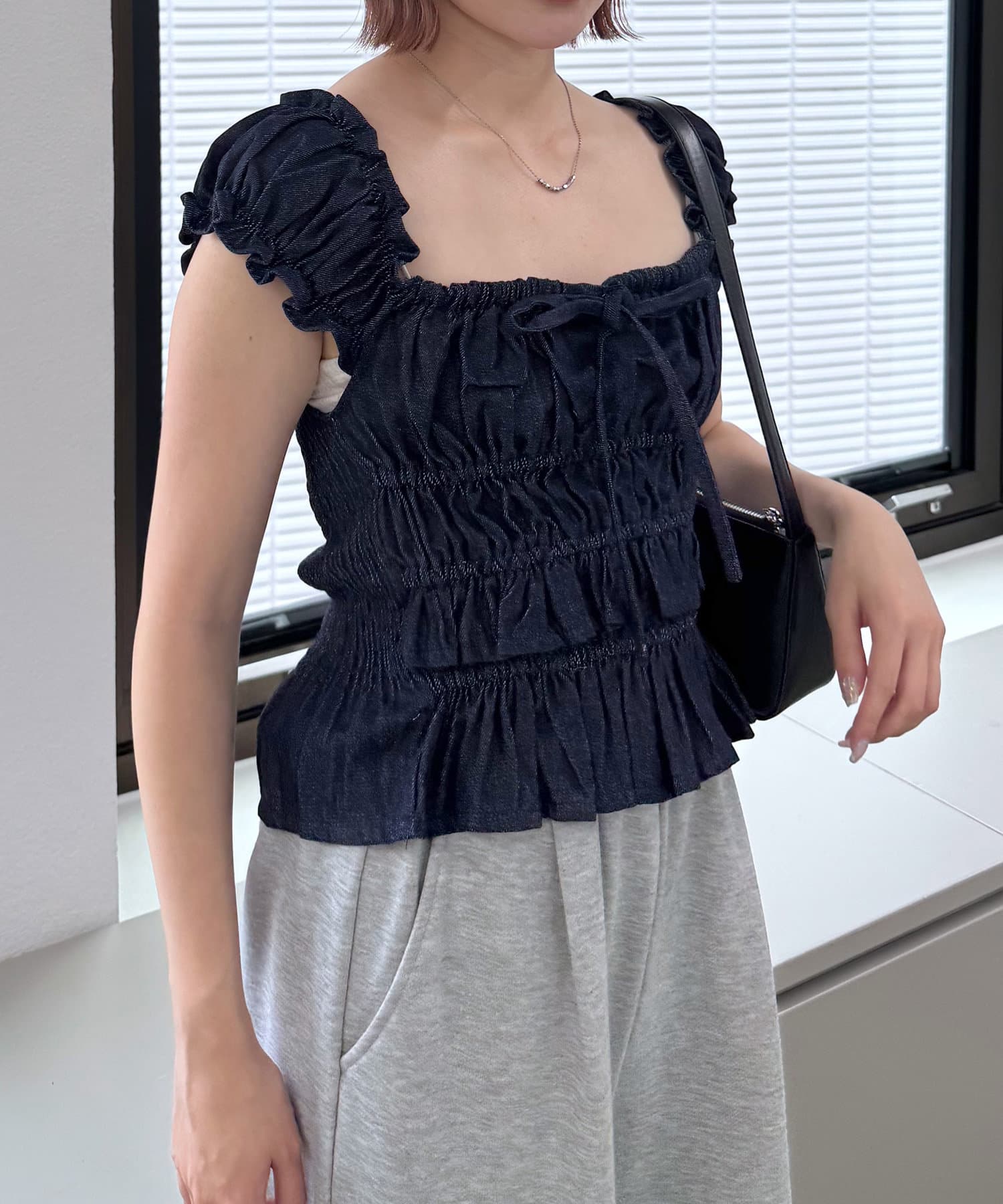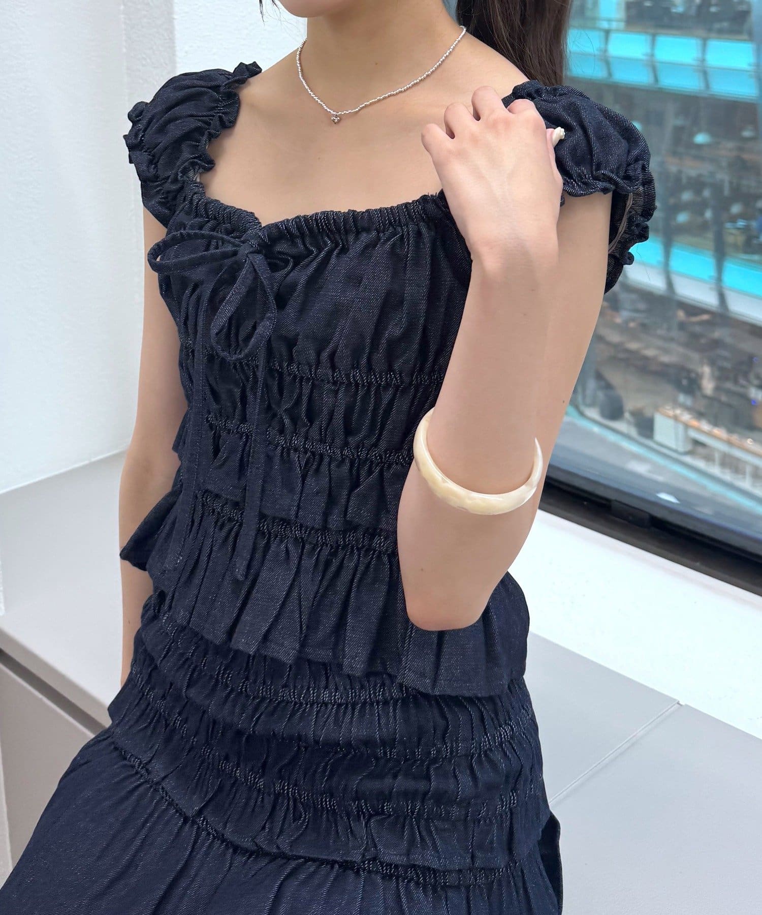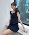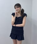 ・全面シャーリングなので伸縮性抜群で、程よく体にフィットするので華奢見えが叶います。