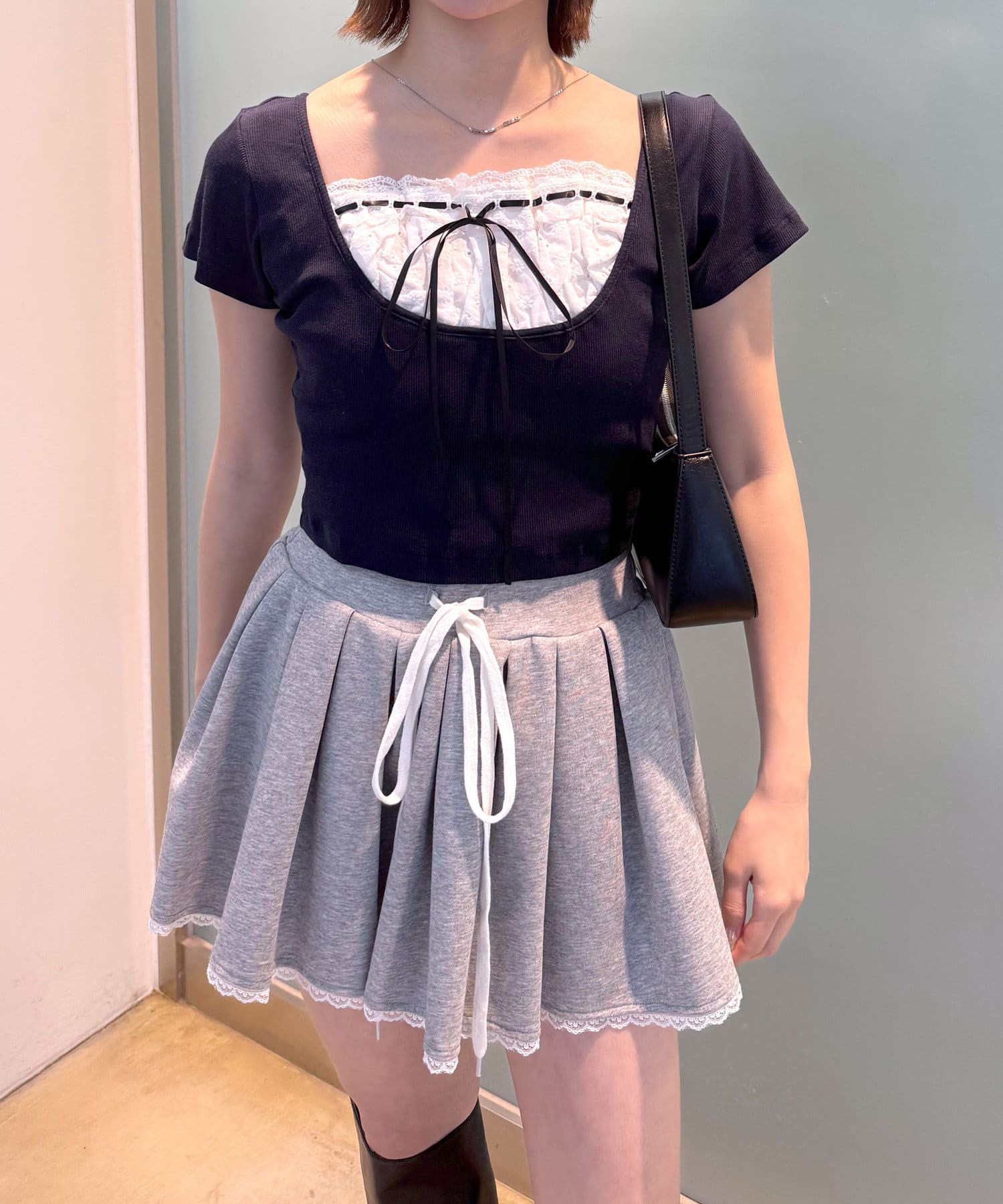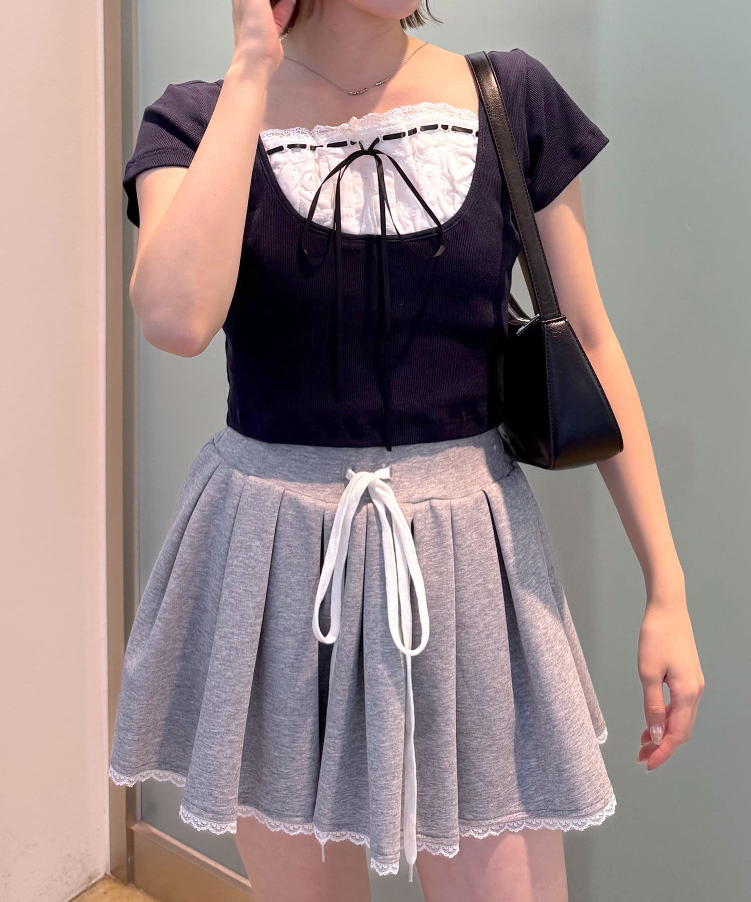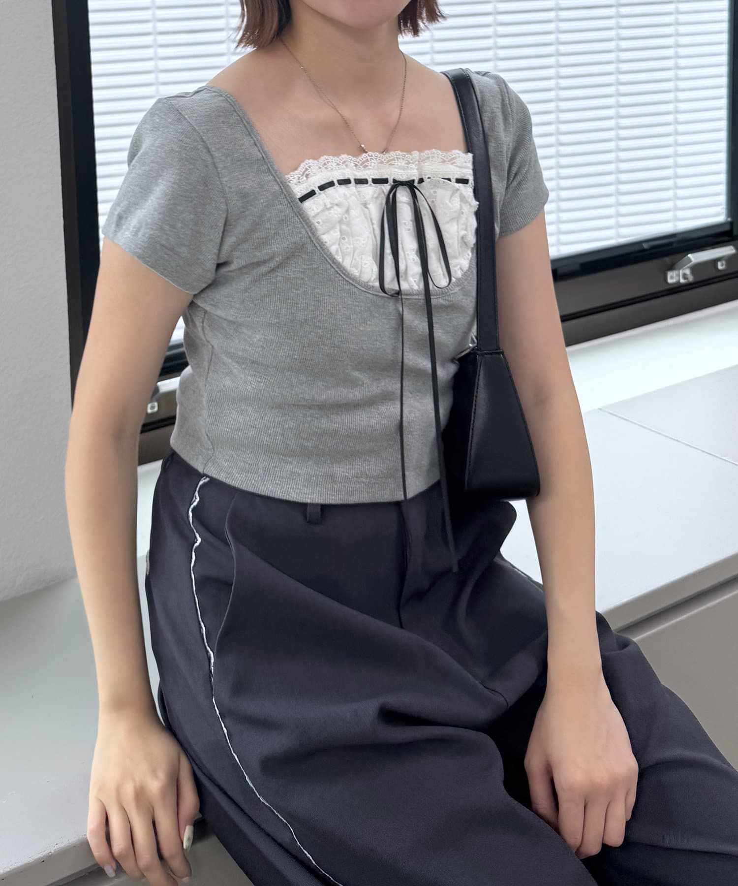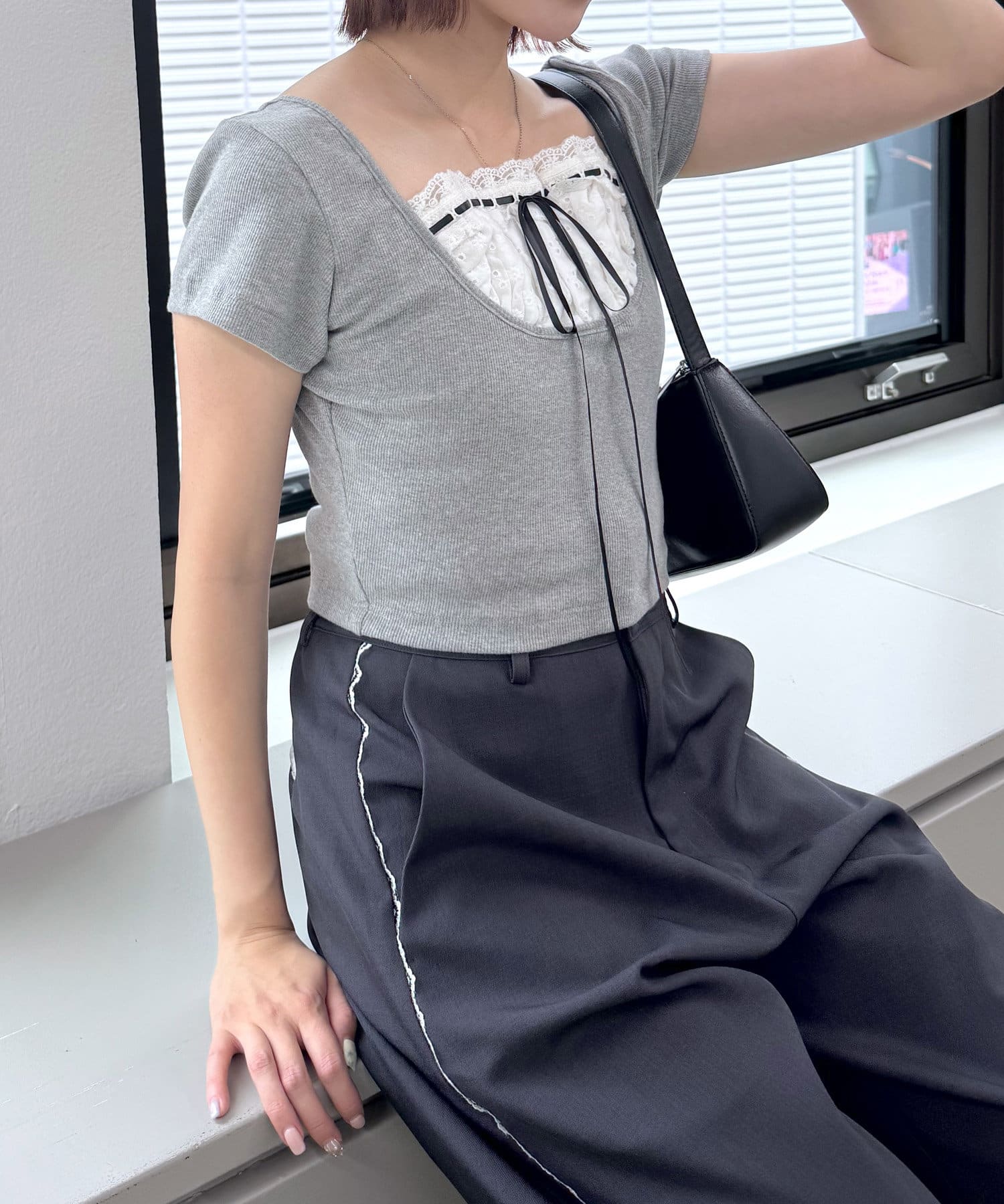 ・シンプルなフレンチTシャツと可愛らしいレース素材が相性◎