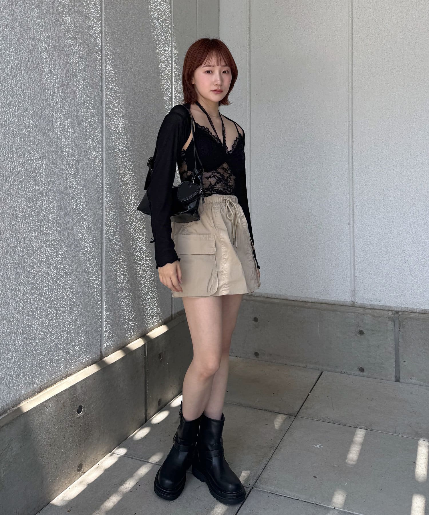 ・レース素材のものや、可愛らしさのあるトップスと合わせて甘さをプラスするのも相性◎
