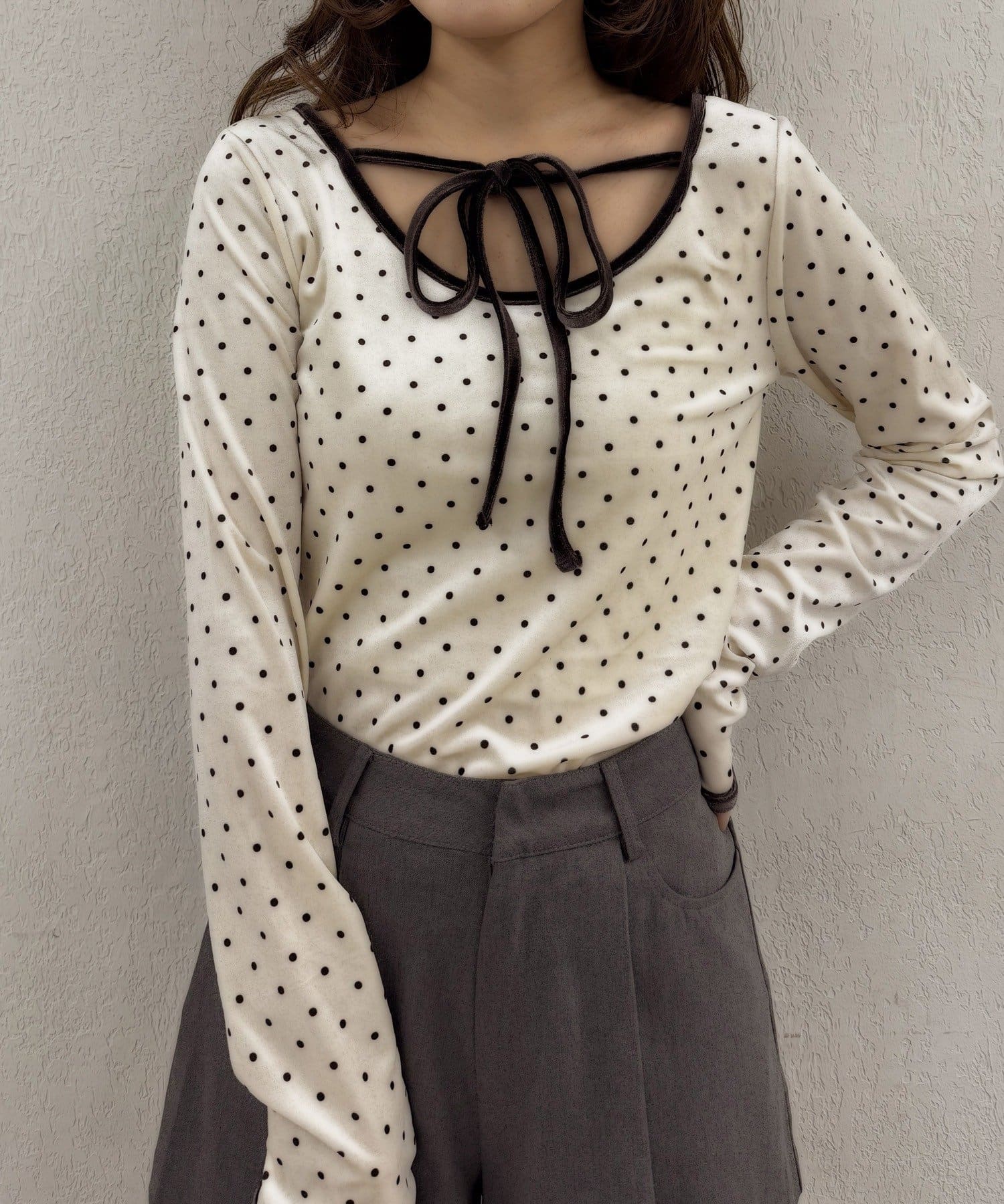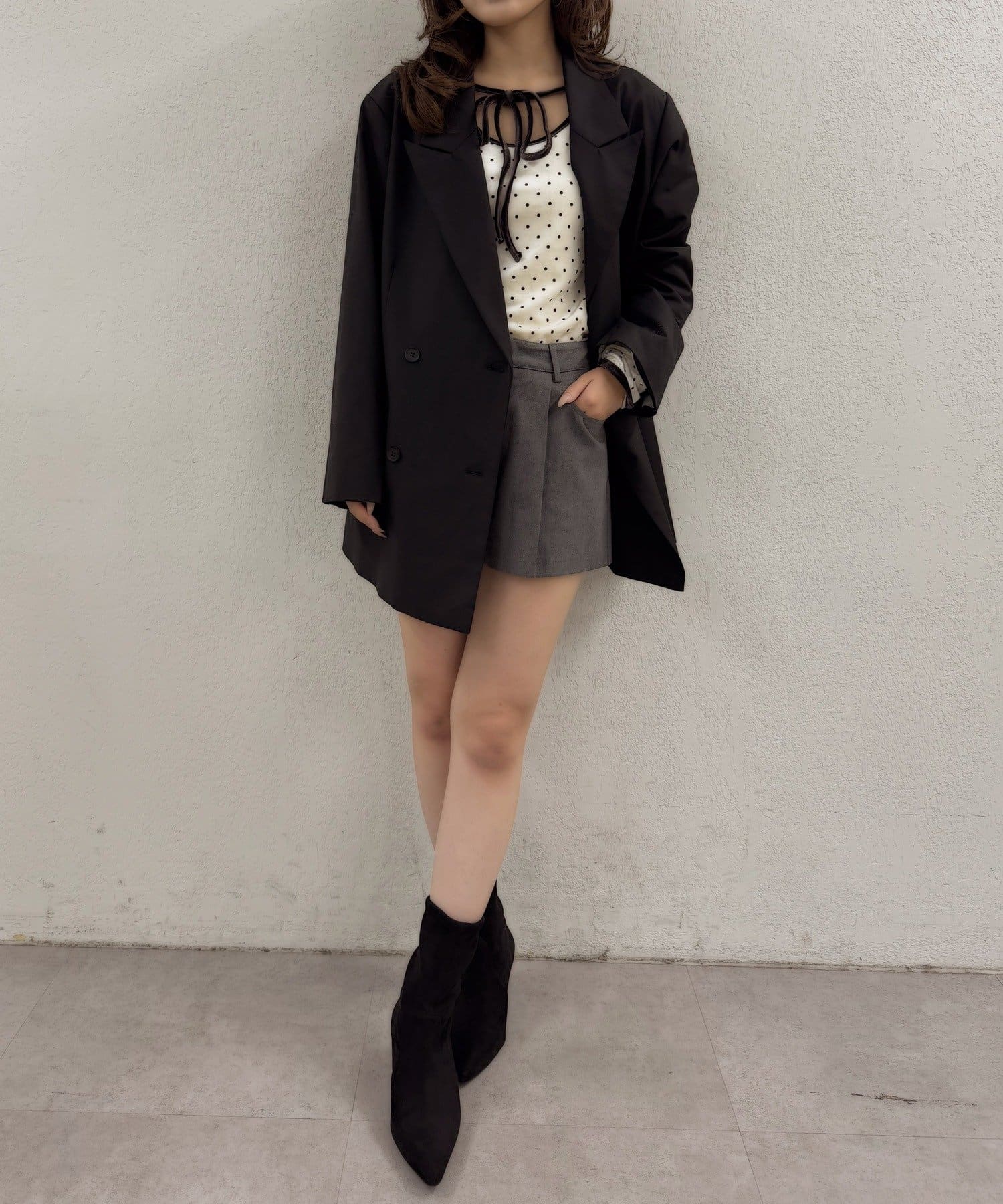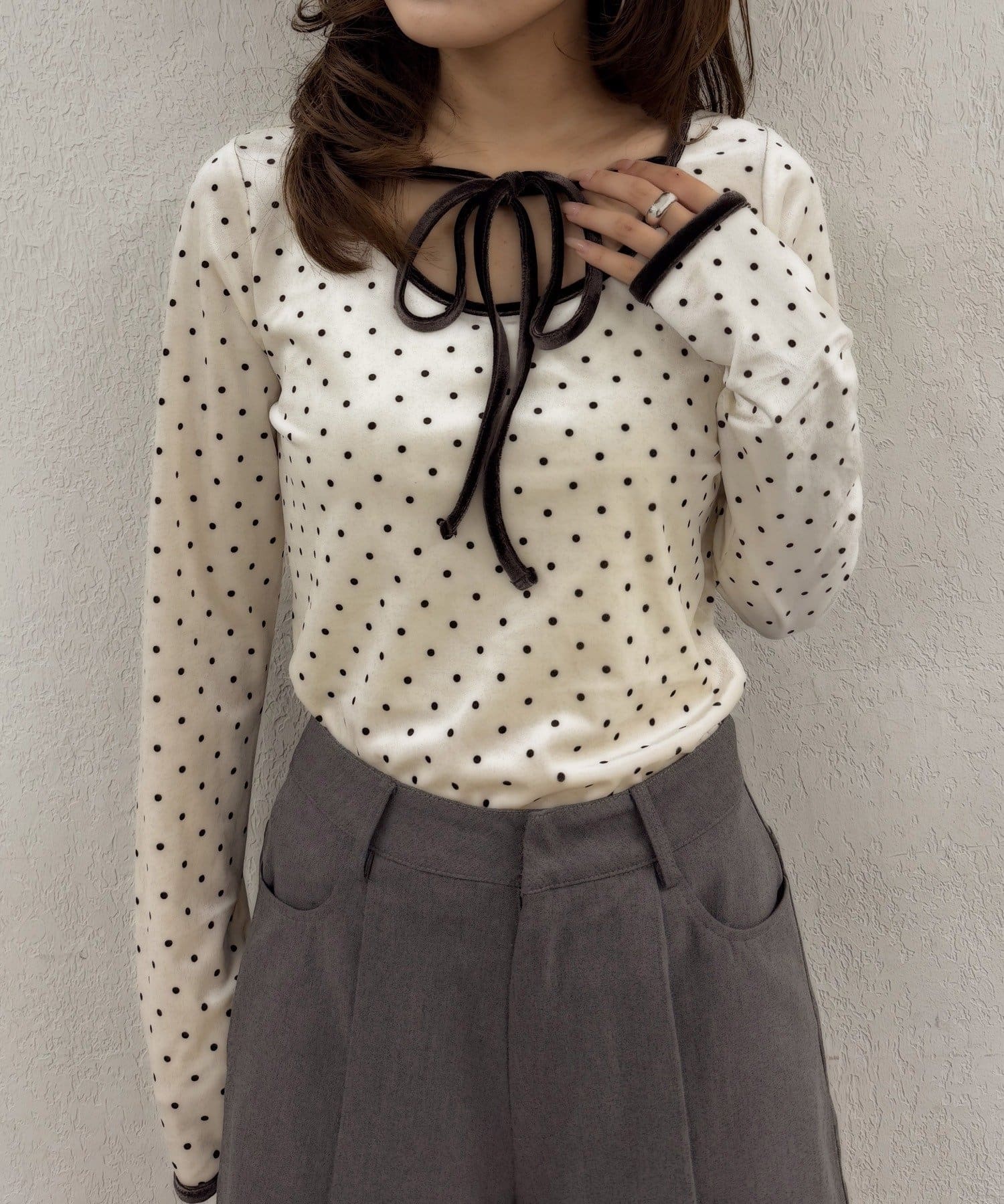 ・胸元のリボンタイが、フェミニンな魅力を引き立てます♡