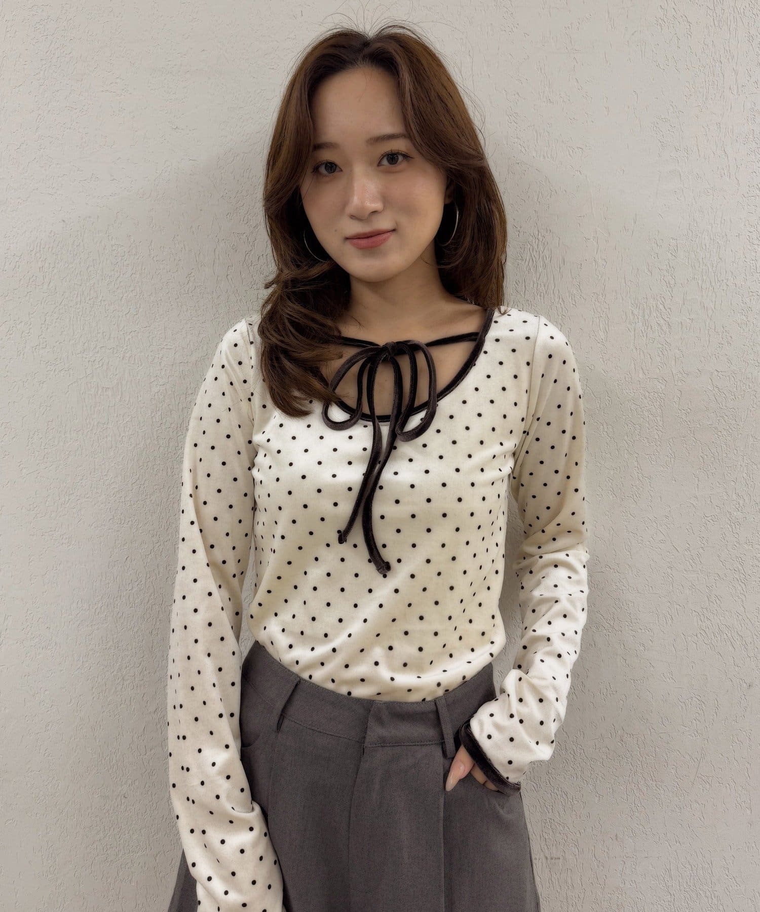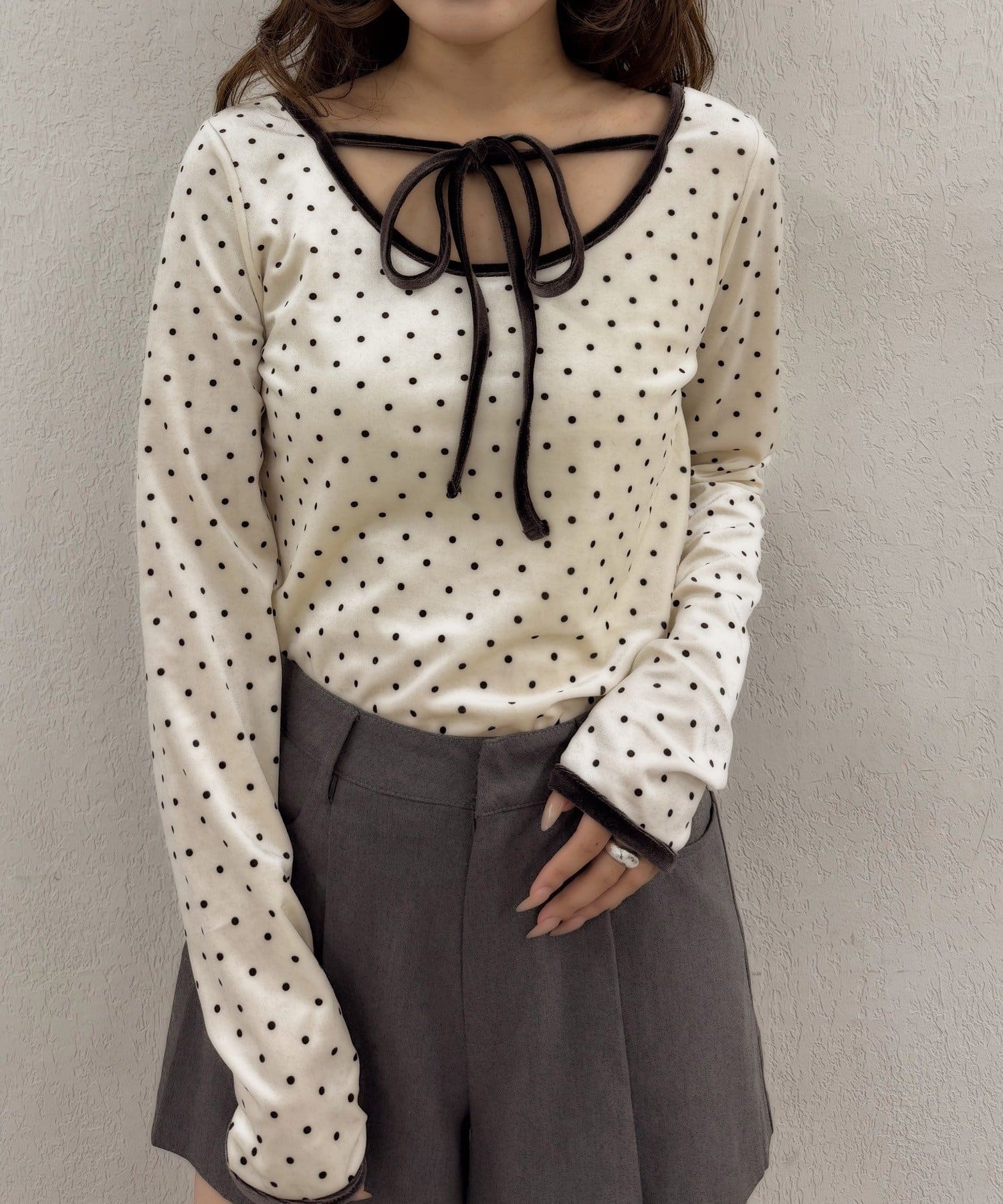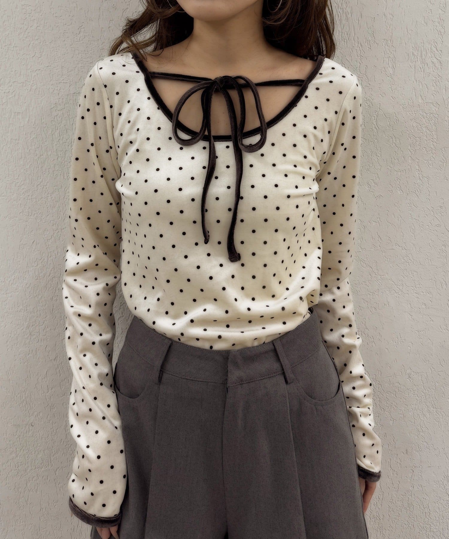 ・胸元のリボンタイが、フェミニンな魅力を引き立てます♡