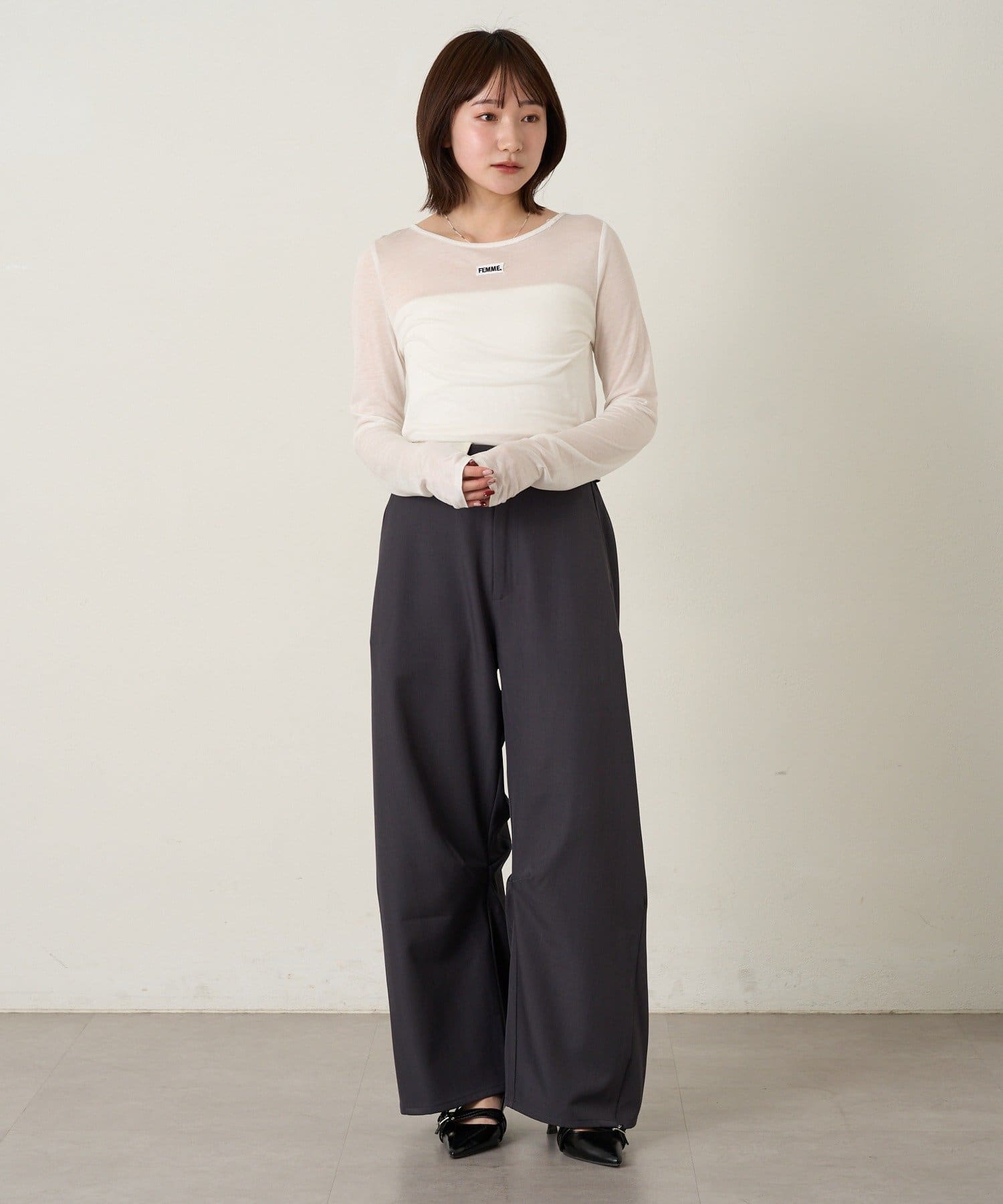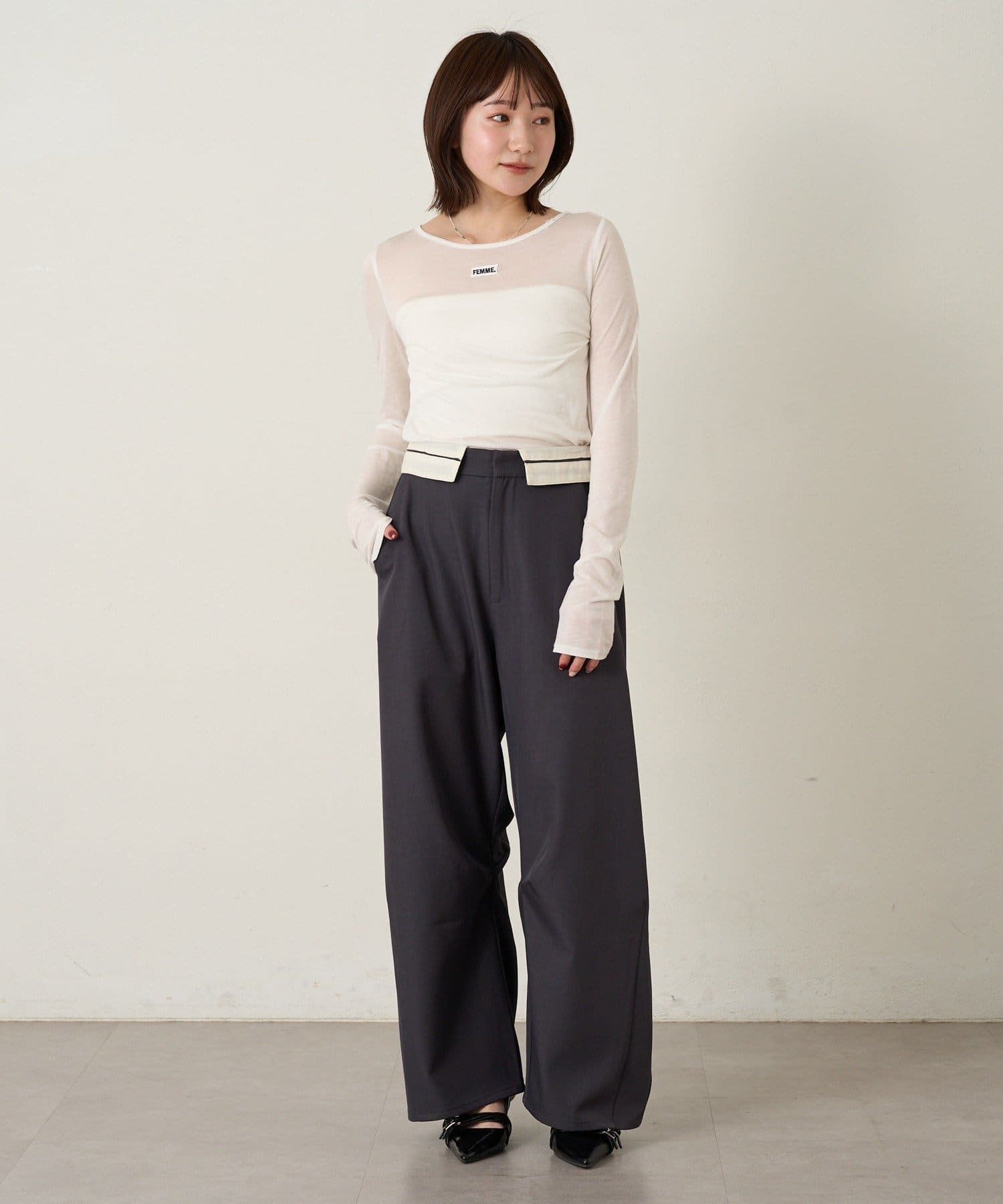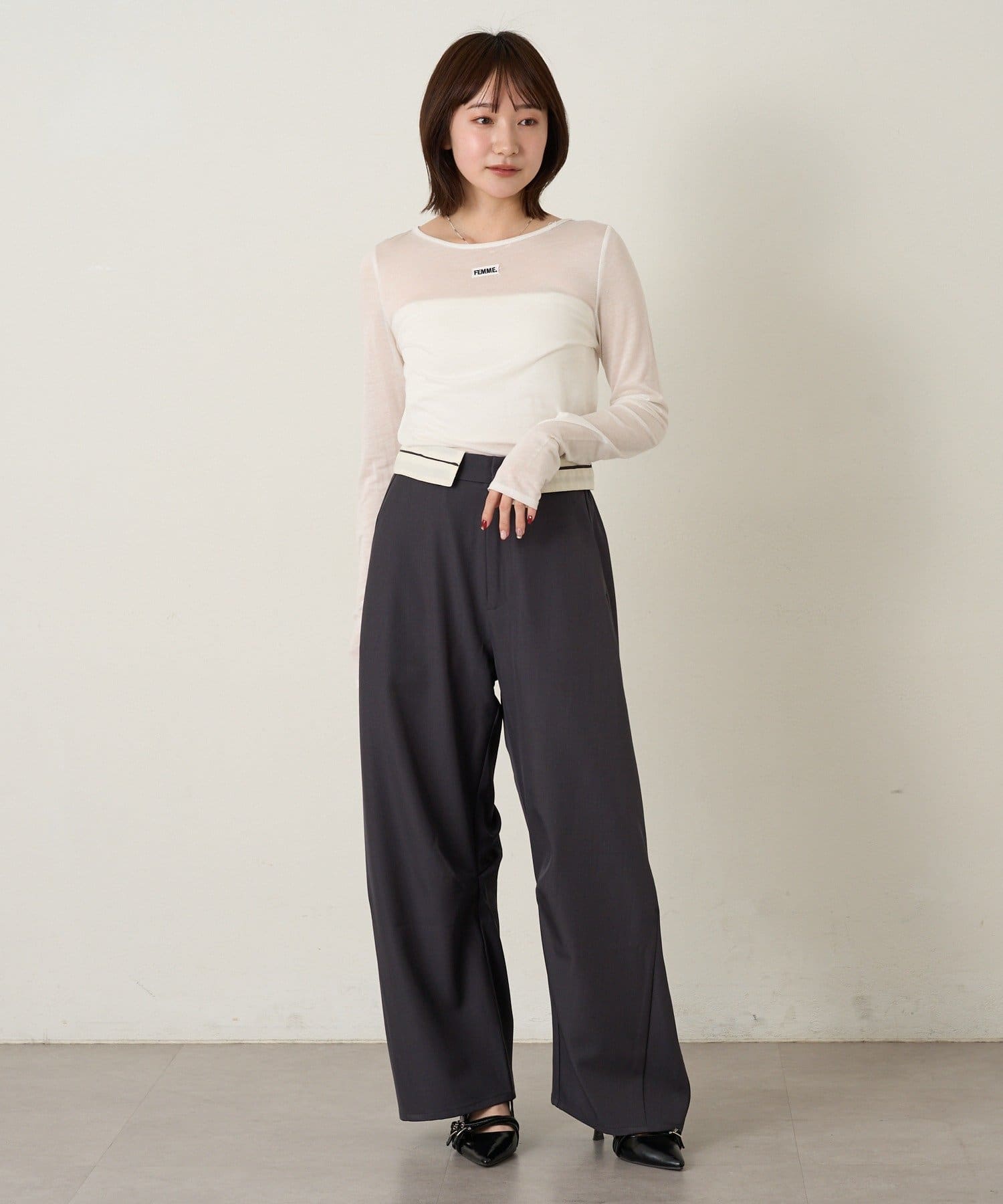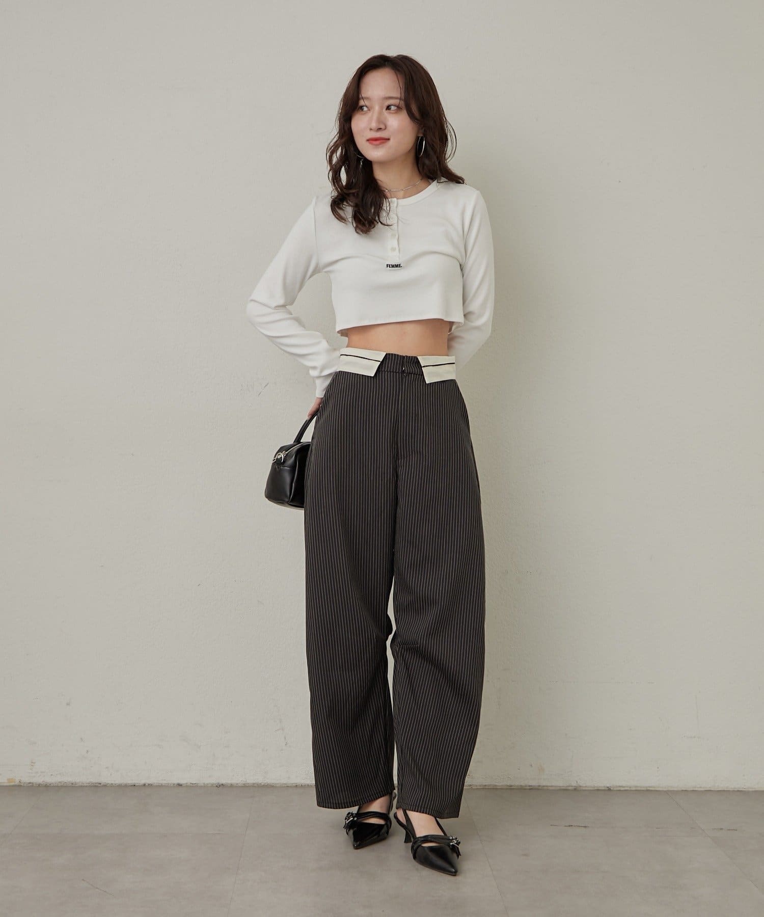 ・ハイウエストのため、トップスはコンパクトなトップスでメリハリのあるスタイルがおすすめ。