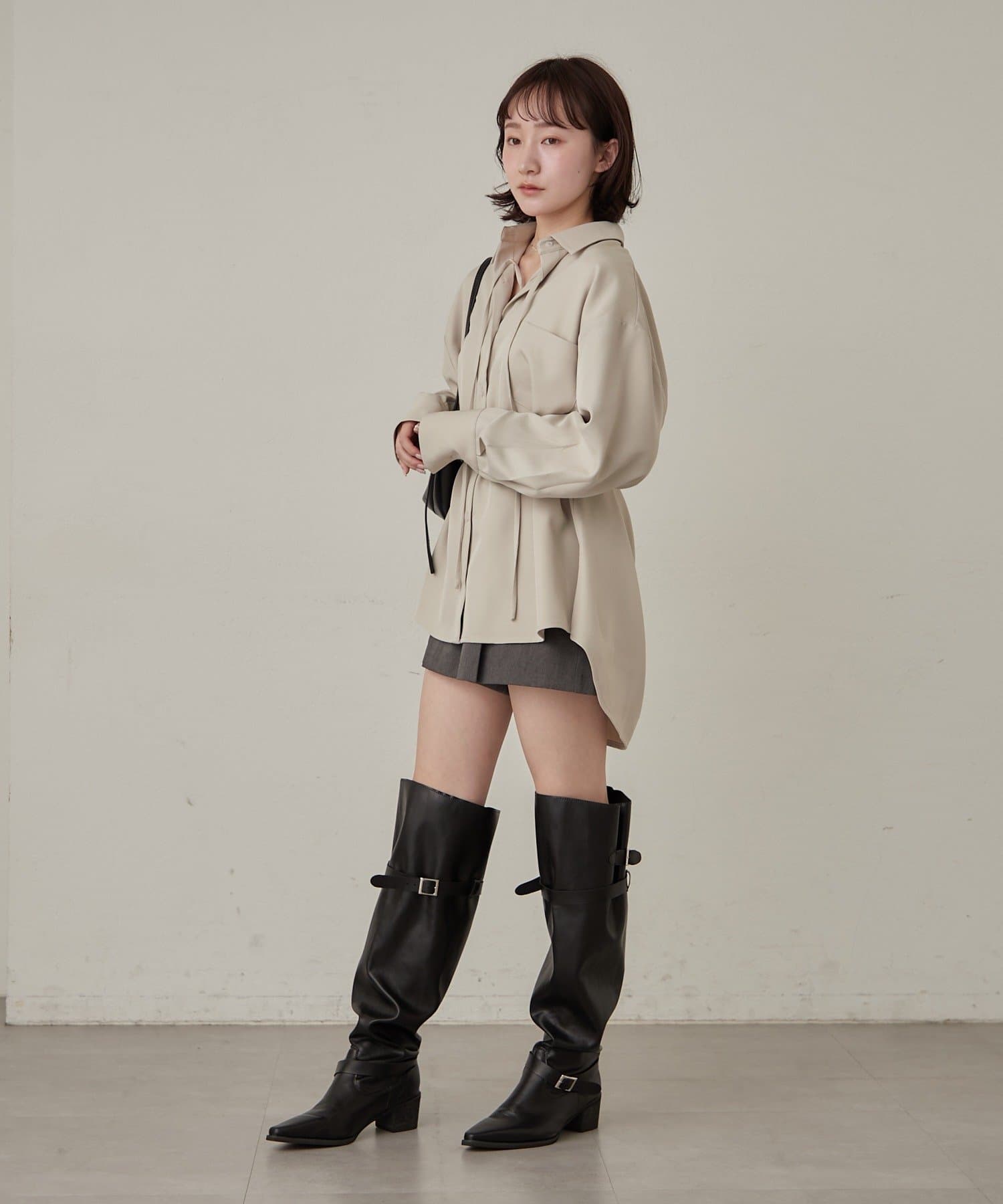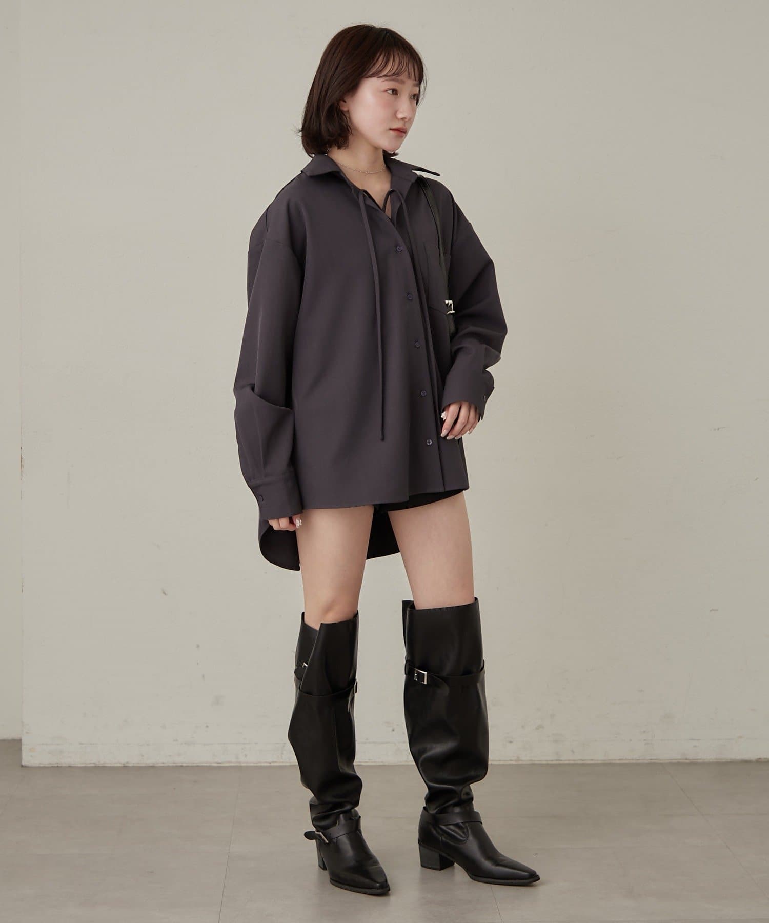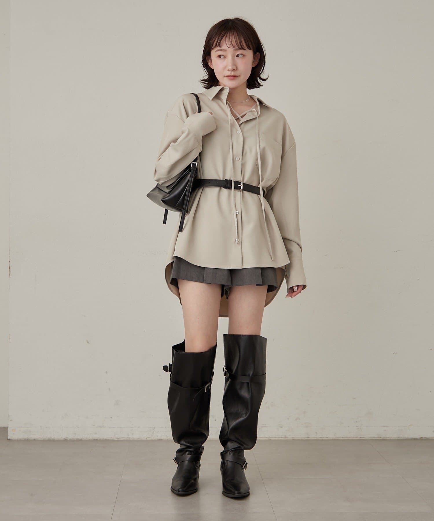 ・ショートパンツ合わせでワンピース風に。足元はロングブーツでクールな印象に◎