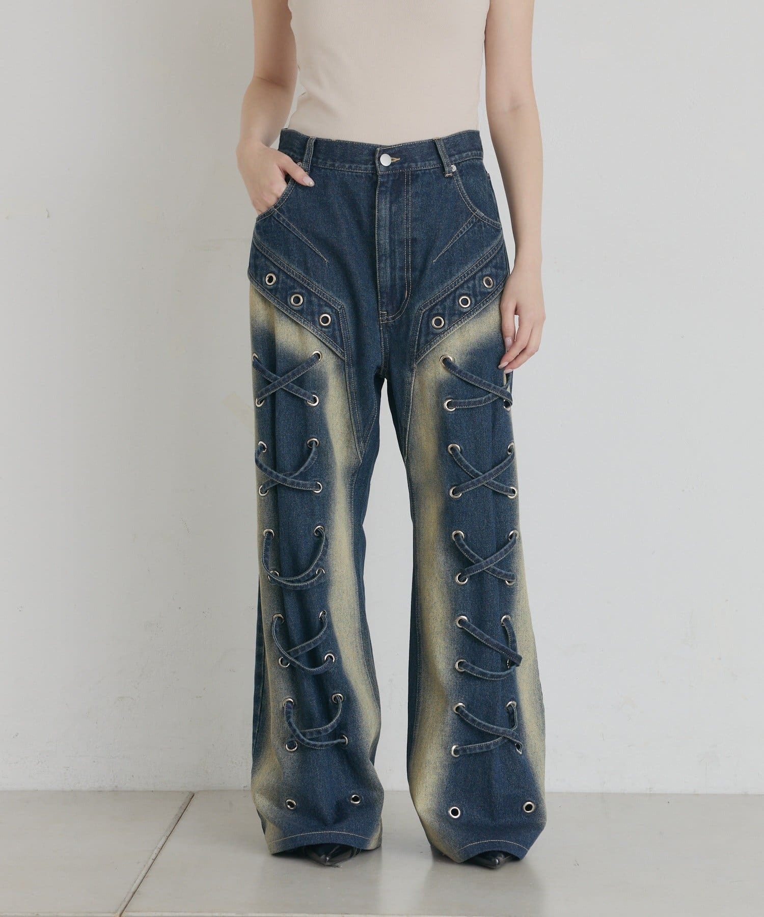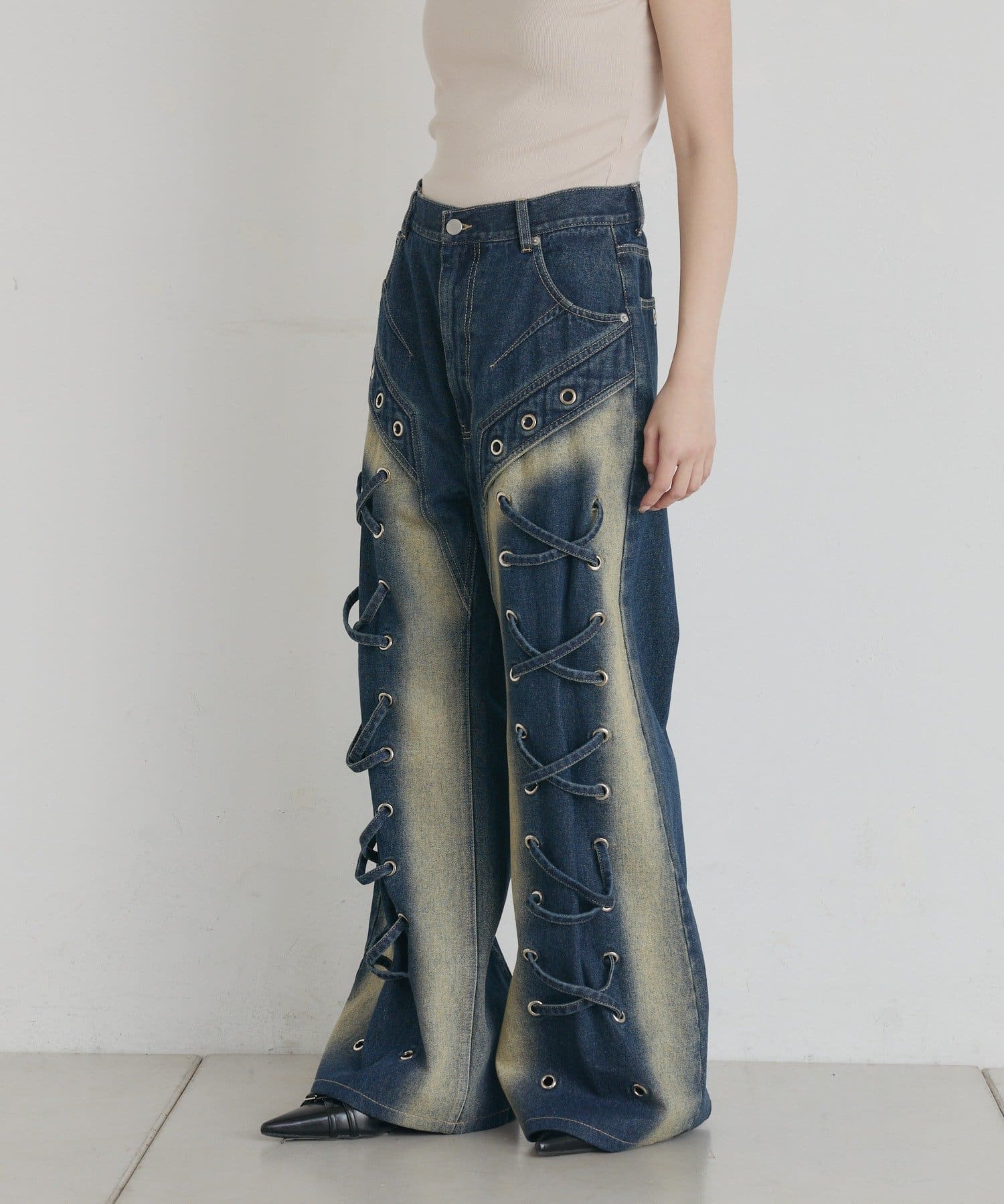 スタイルアップも叶う、ヴィンテージ加工がレースアップデニム!