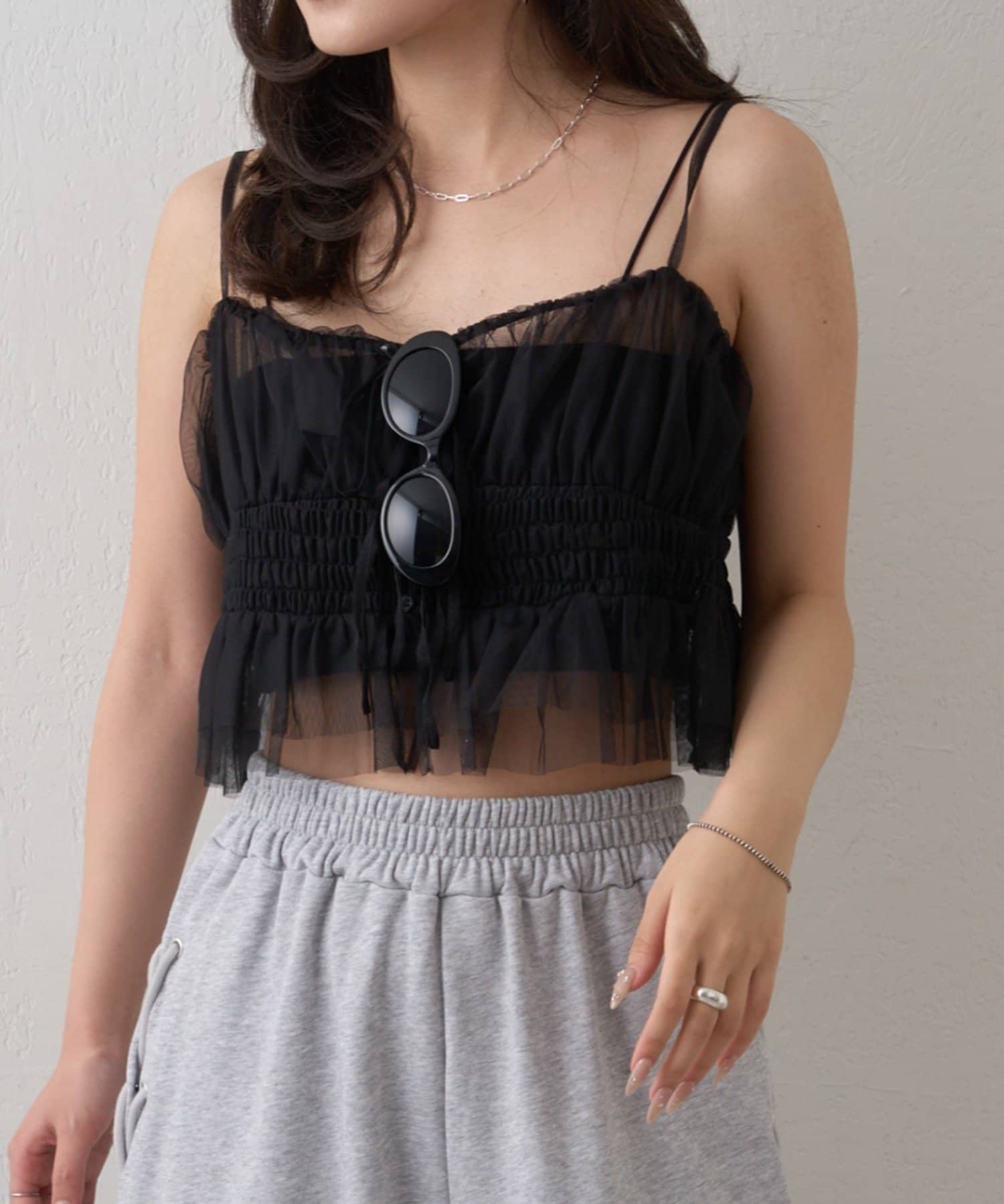・チュール素材と程よいシアー感が女性らしく、着映えするキャミビスチェ。
