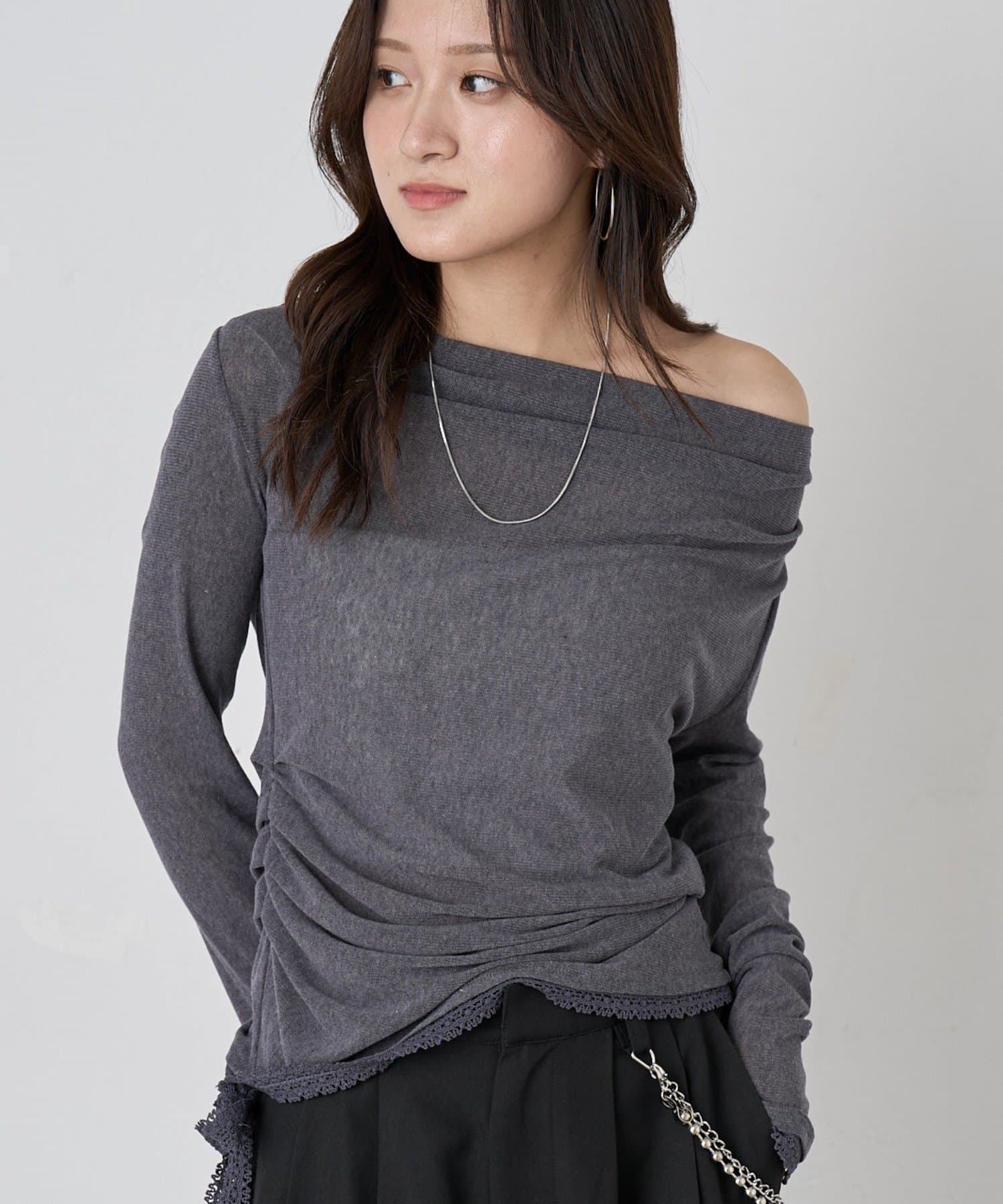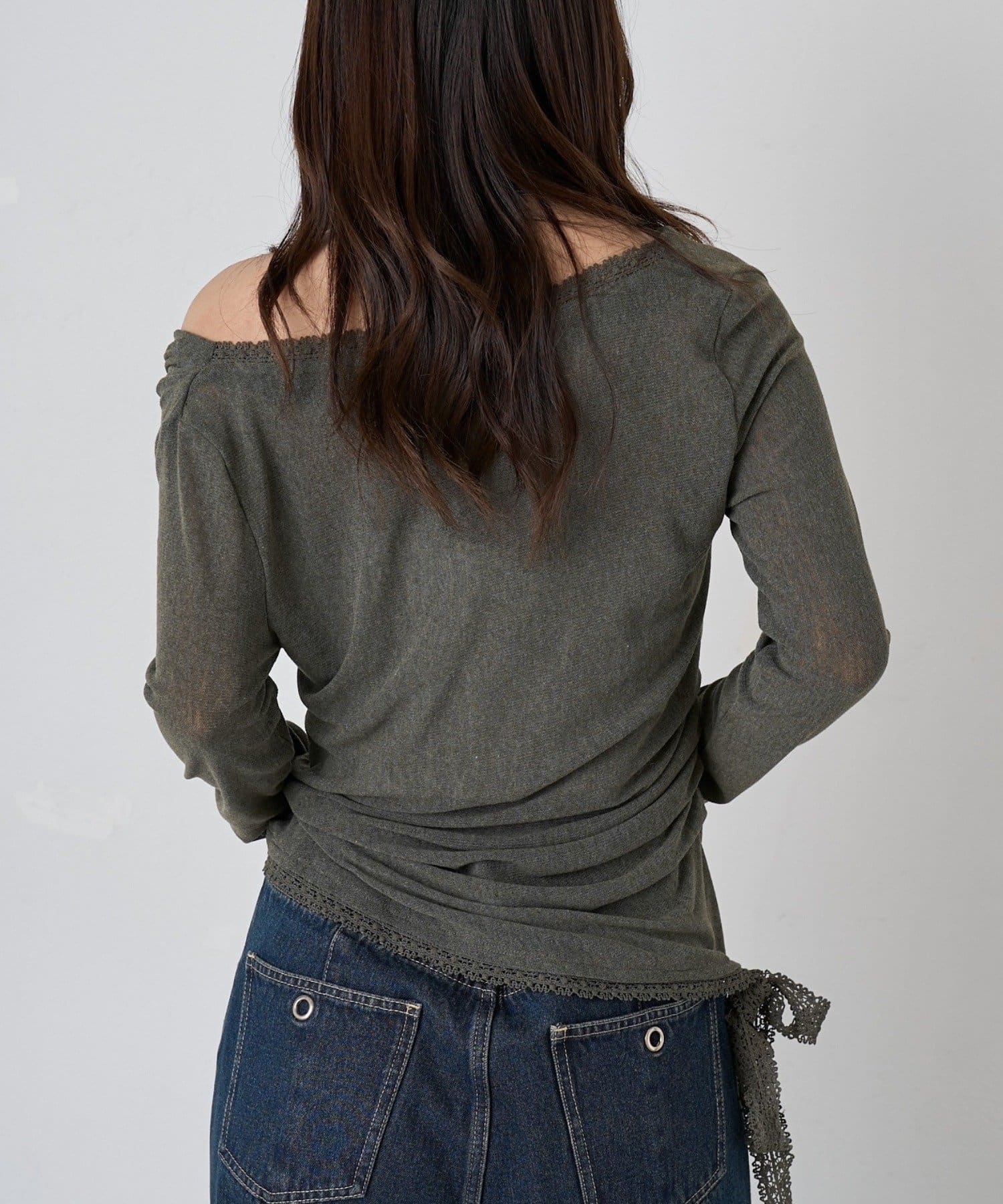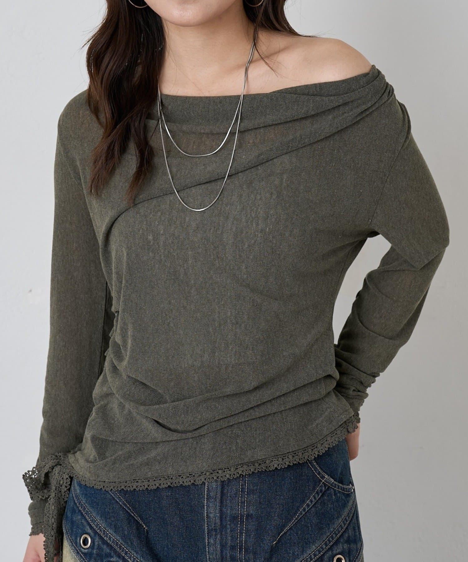 裾のレースリボンがポイントの大人見えオフショルトップスが登場!