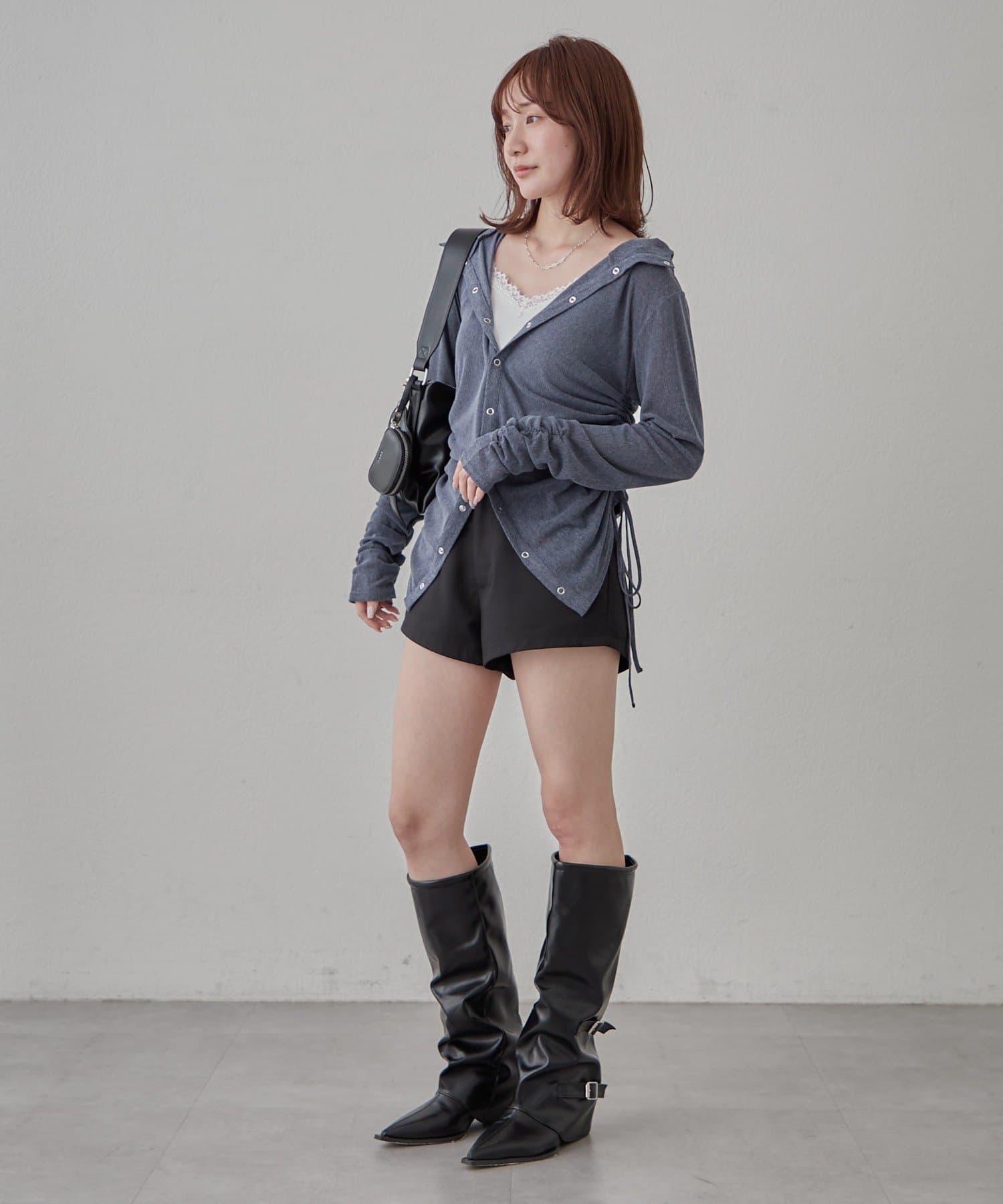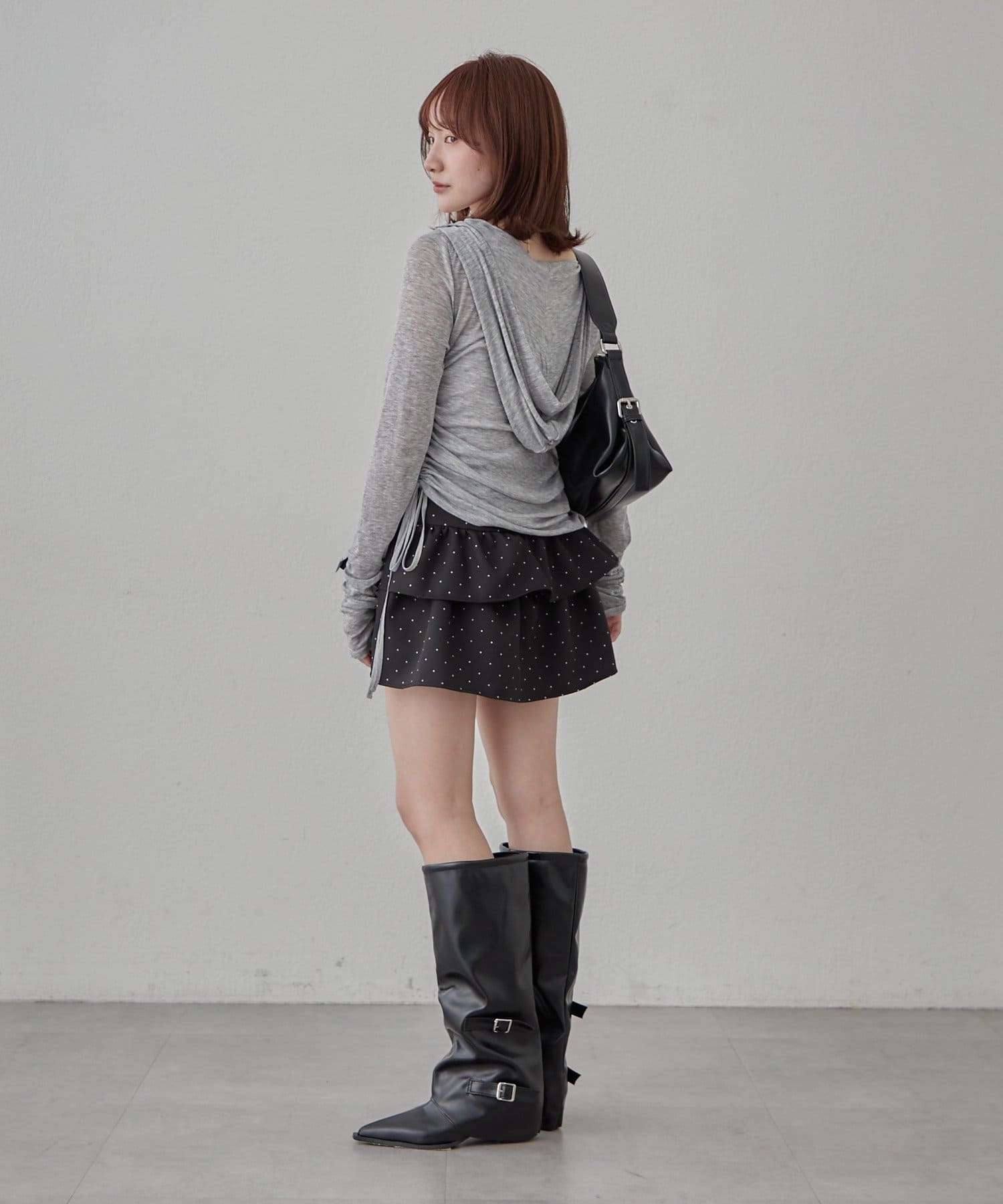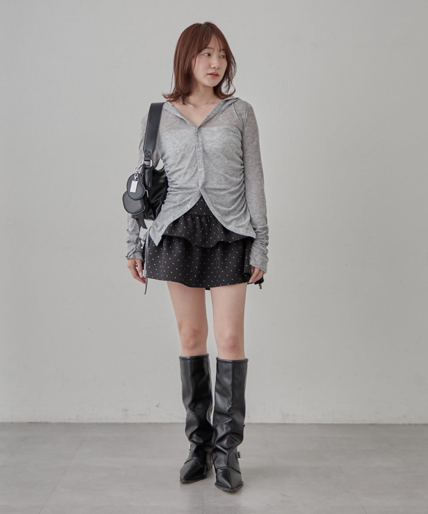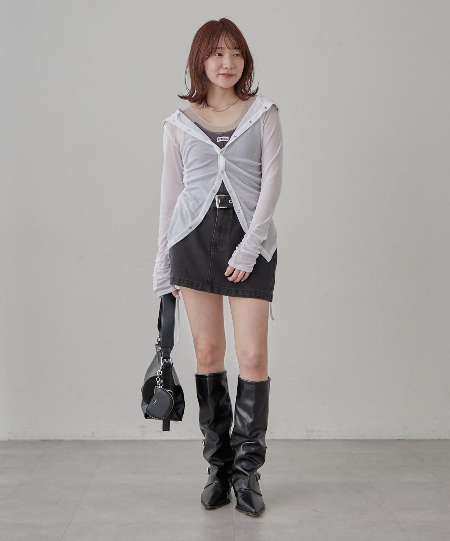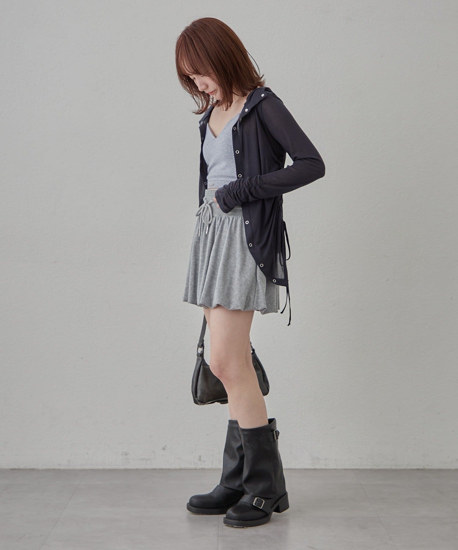 ・ミニスカートやショートボトムでトレンド感のあるバランスに。