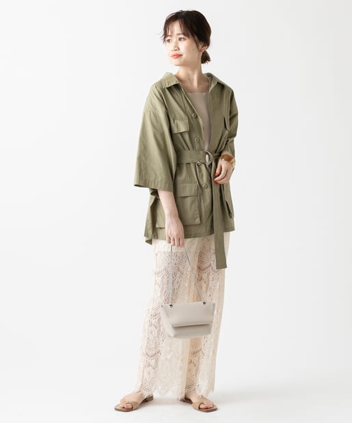 ・ワンピースの上から羽織って共地ベルトでウエストマークすることでスタイルアップ見えに。