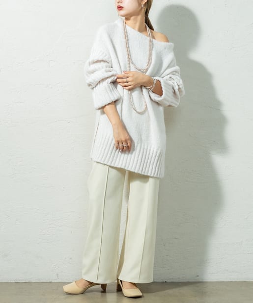 ・少し表面感のある素材なのでさらっとしたシャツやレザー素材の合わせがオススメ。