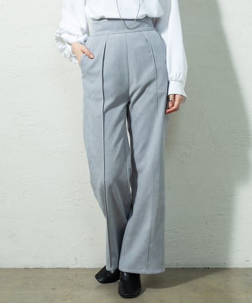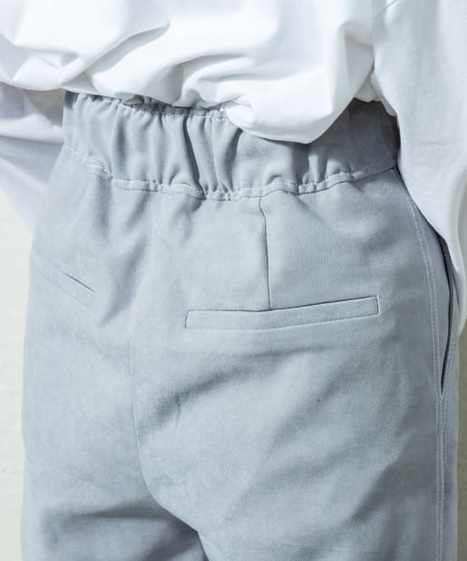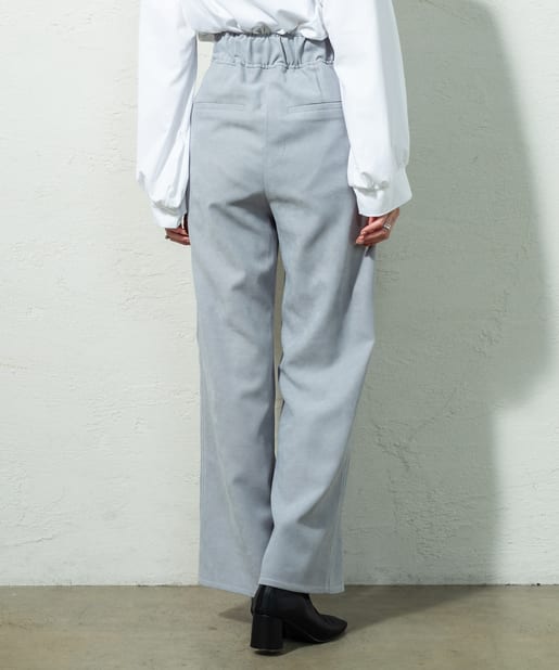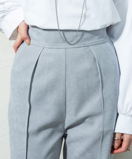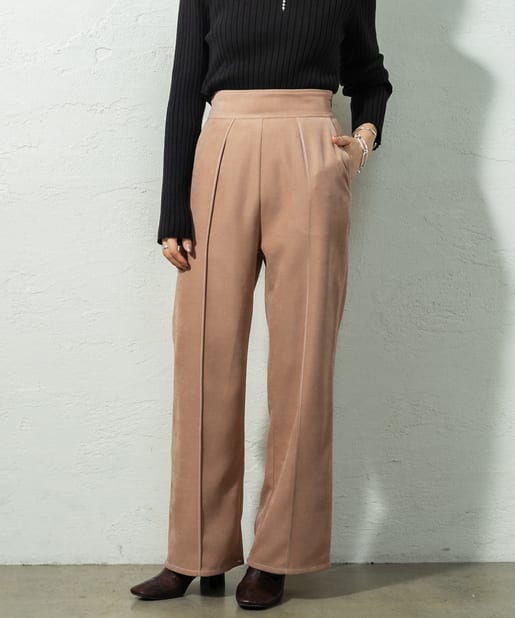 ・表面に立体感のあるカルゼ素材を使ったセンタータックパンツ。