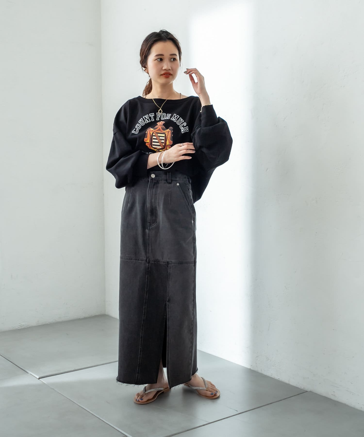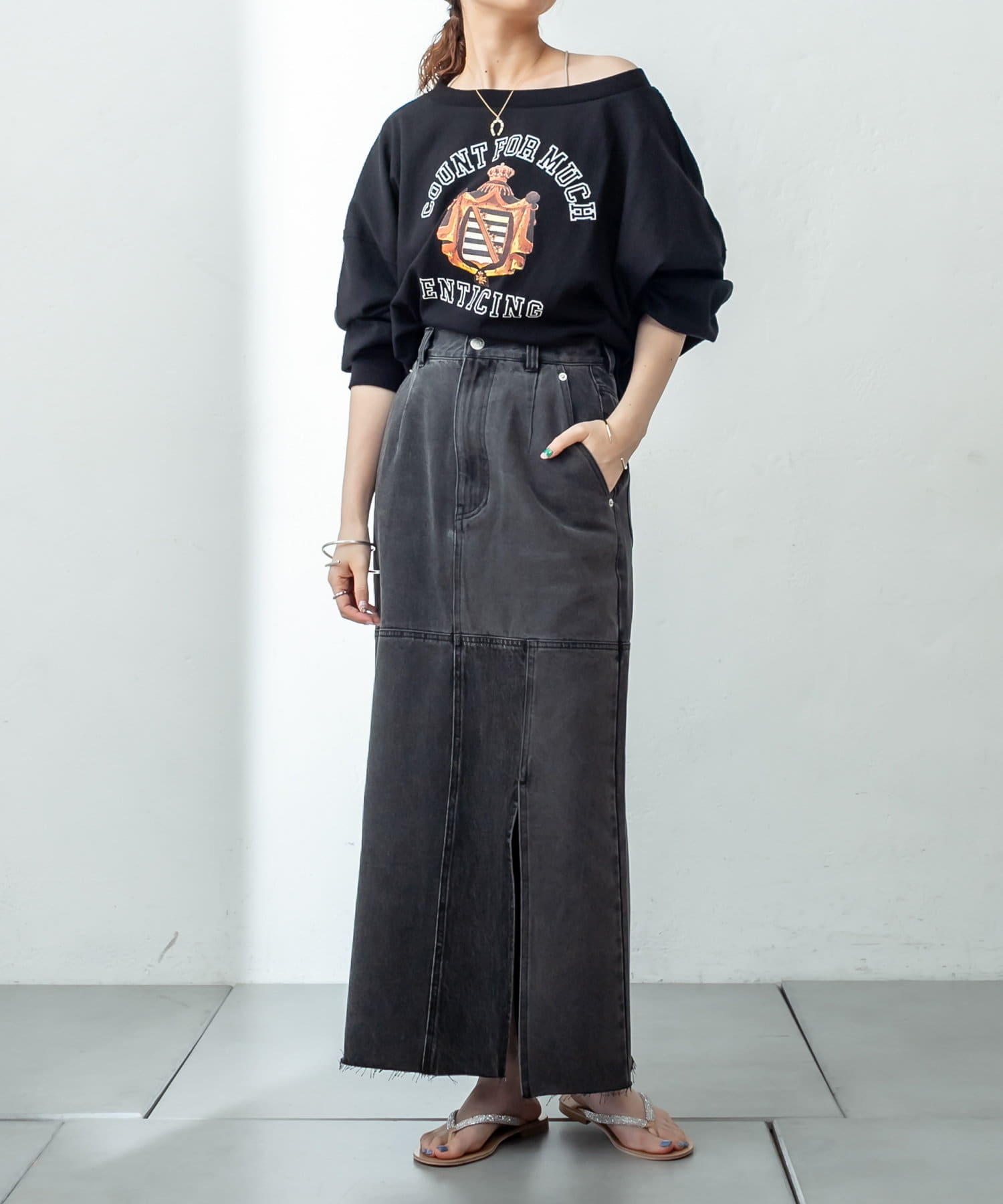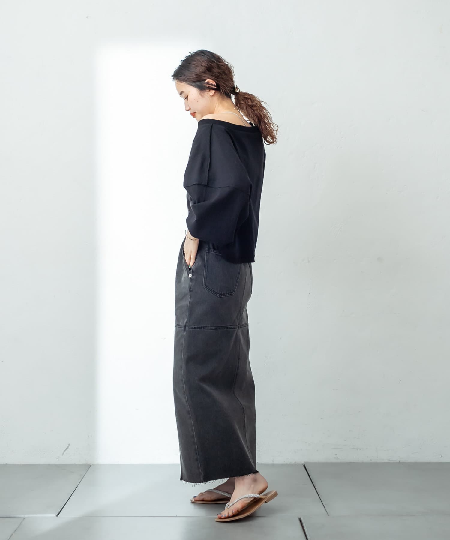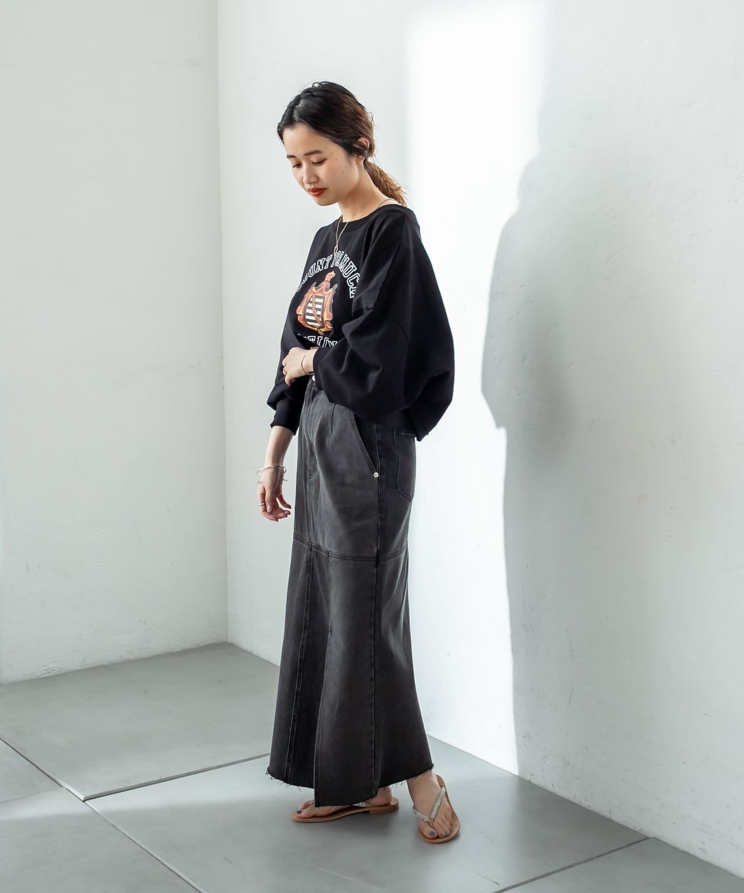 ・少し丈感が長めなシルエットなので足元はサンダルなどで抜け感を出すのが◎