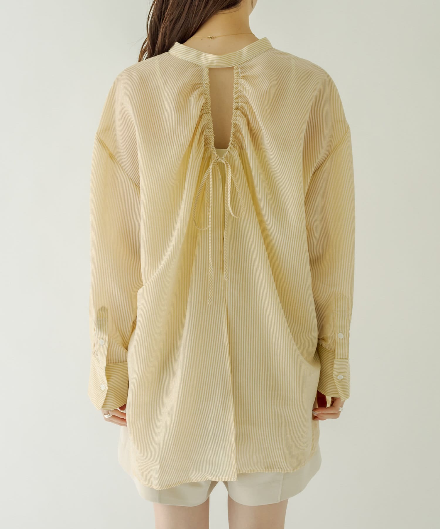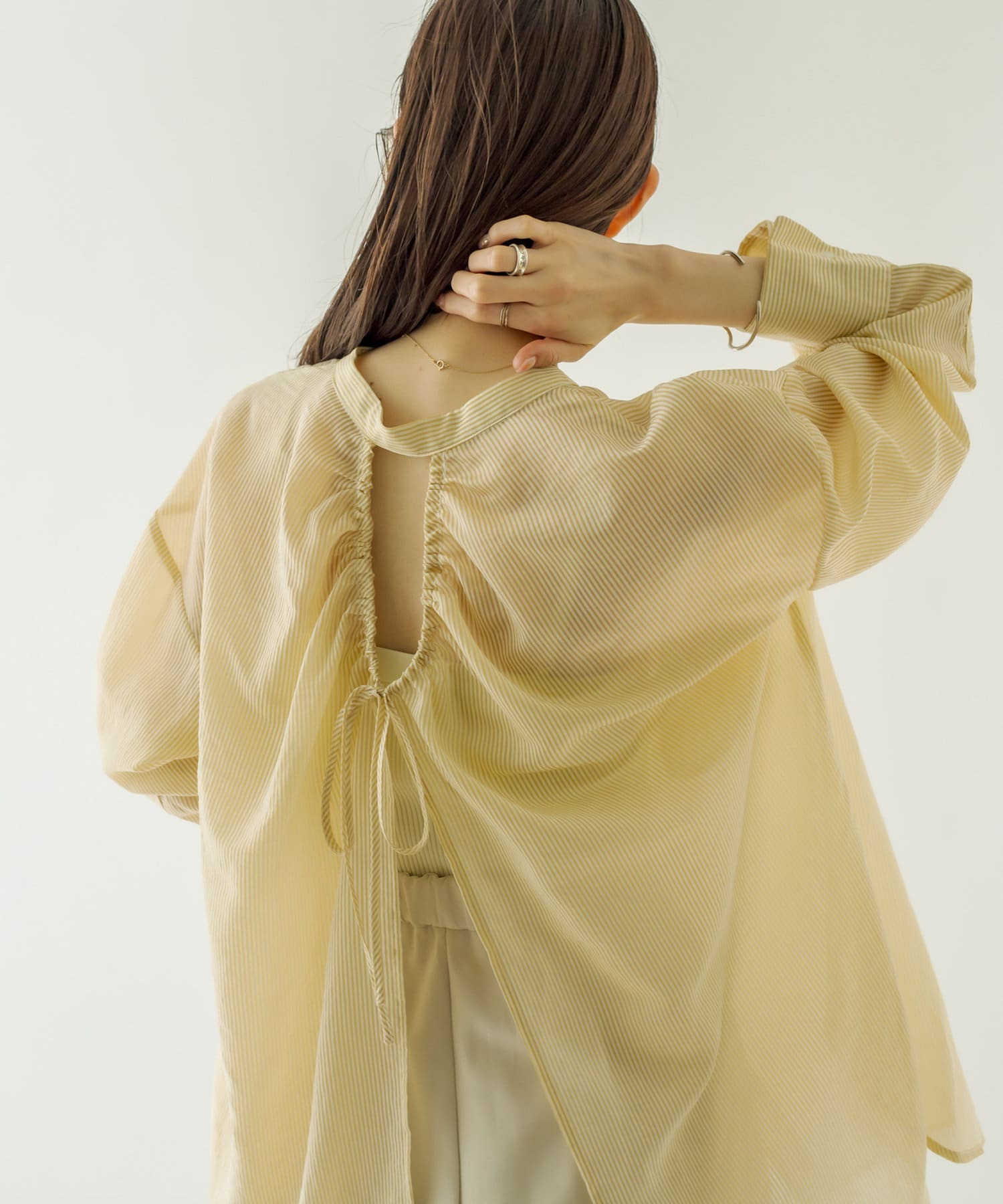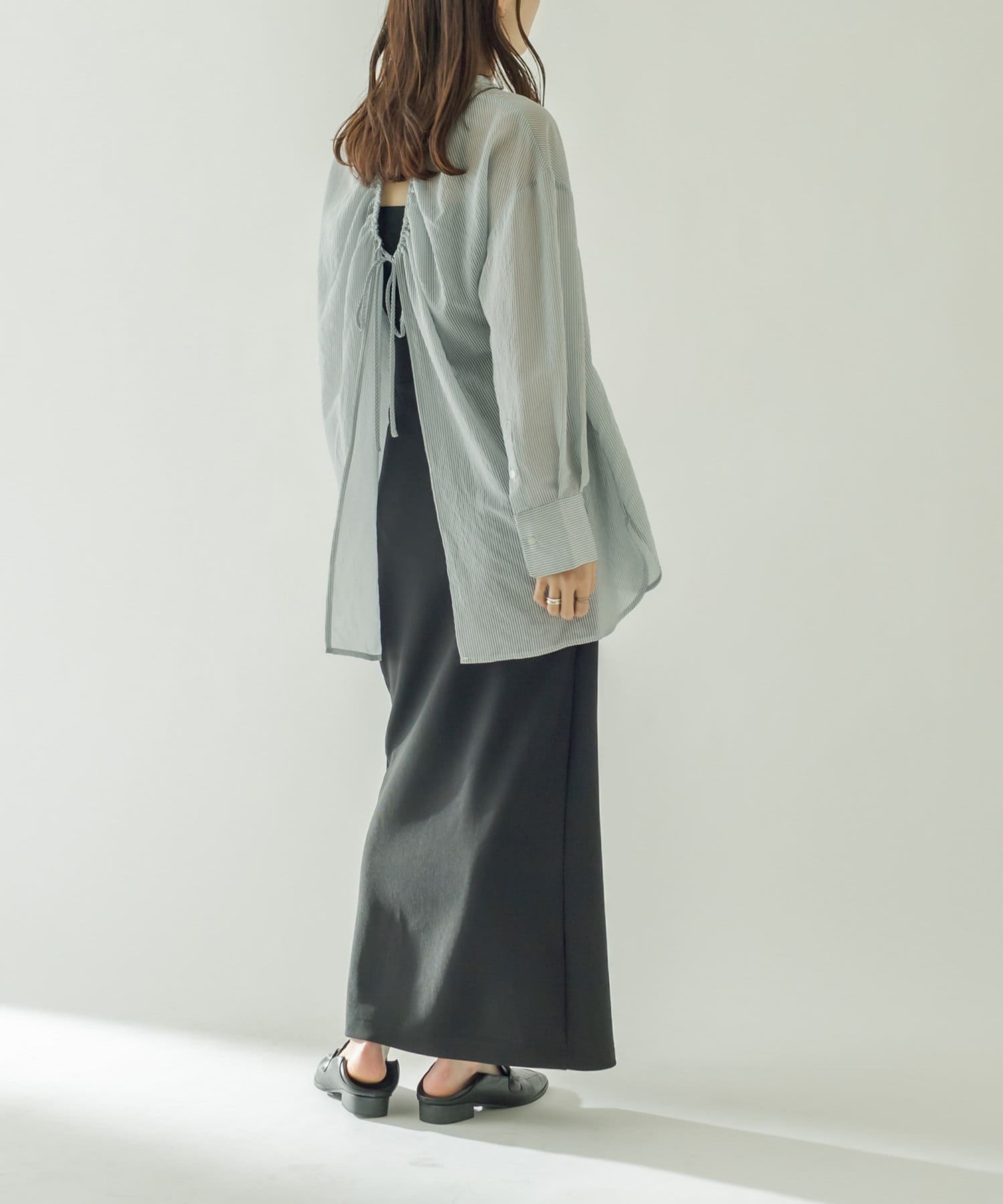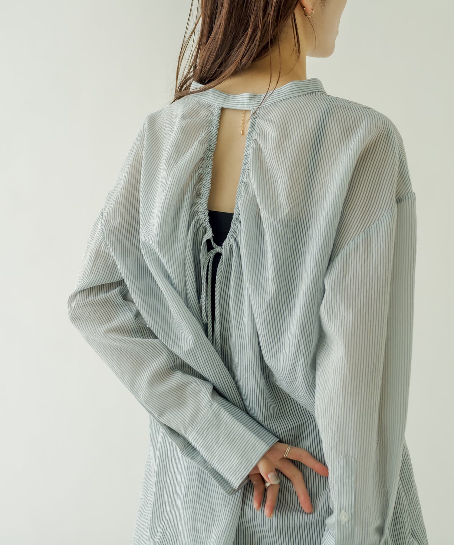 ・程よく開くバックシャンデザインが目を惹くストライプシャツが登場。