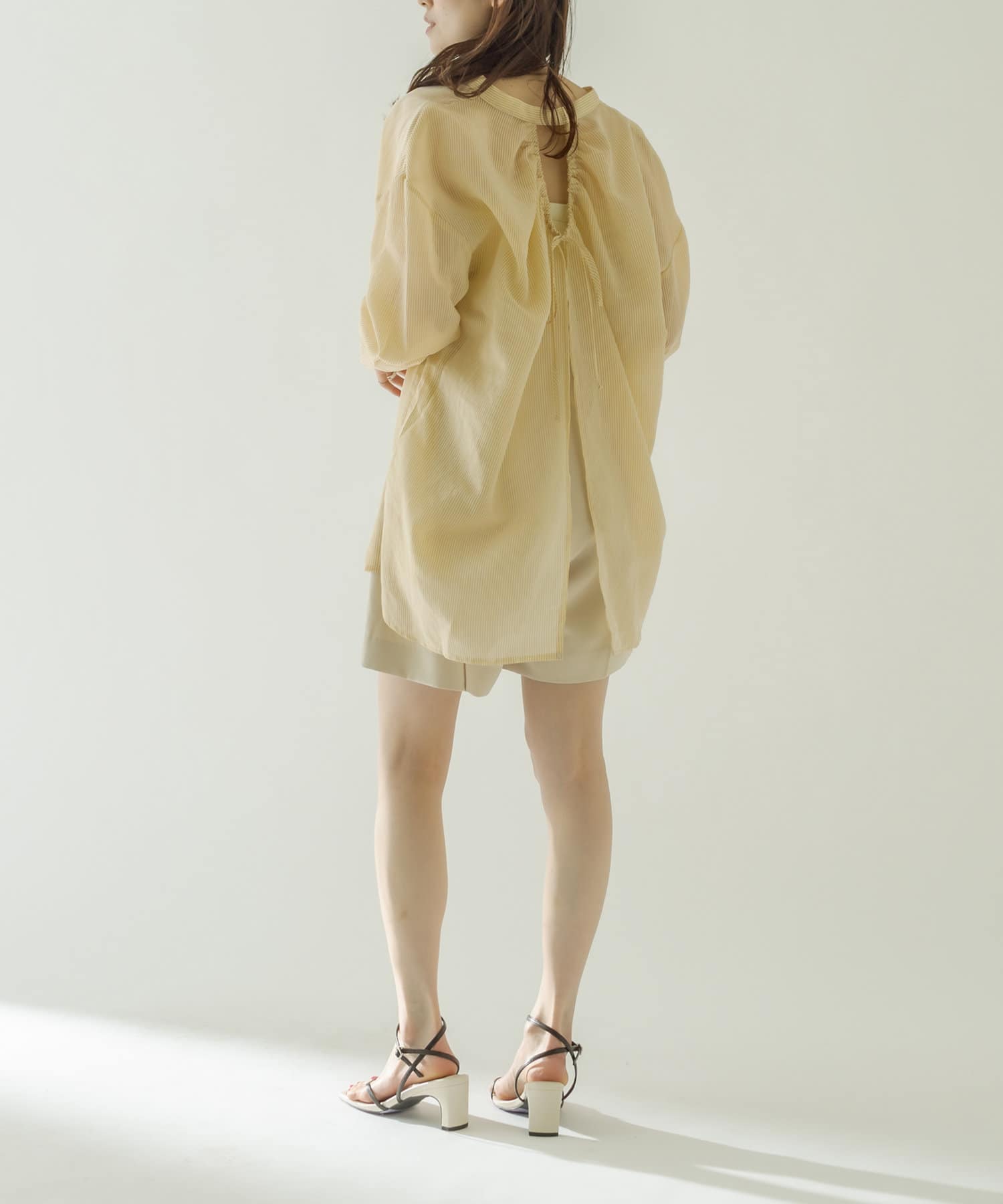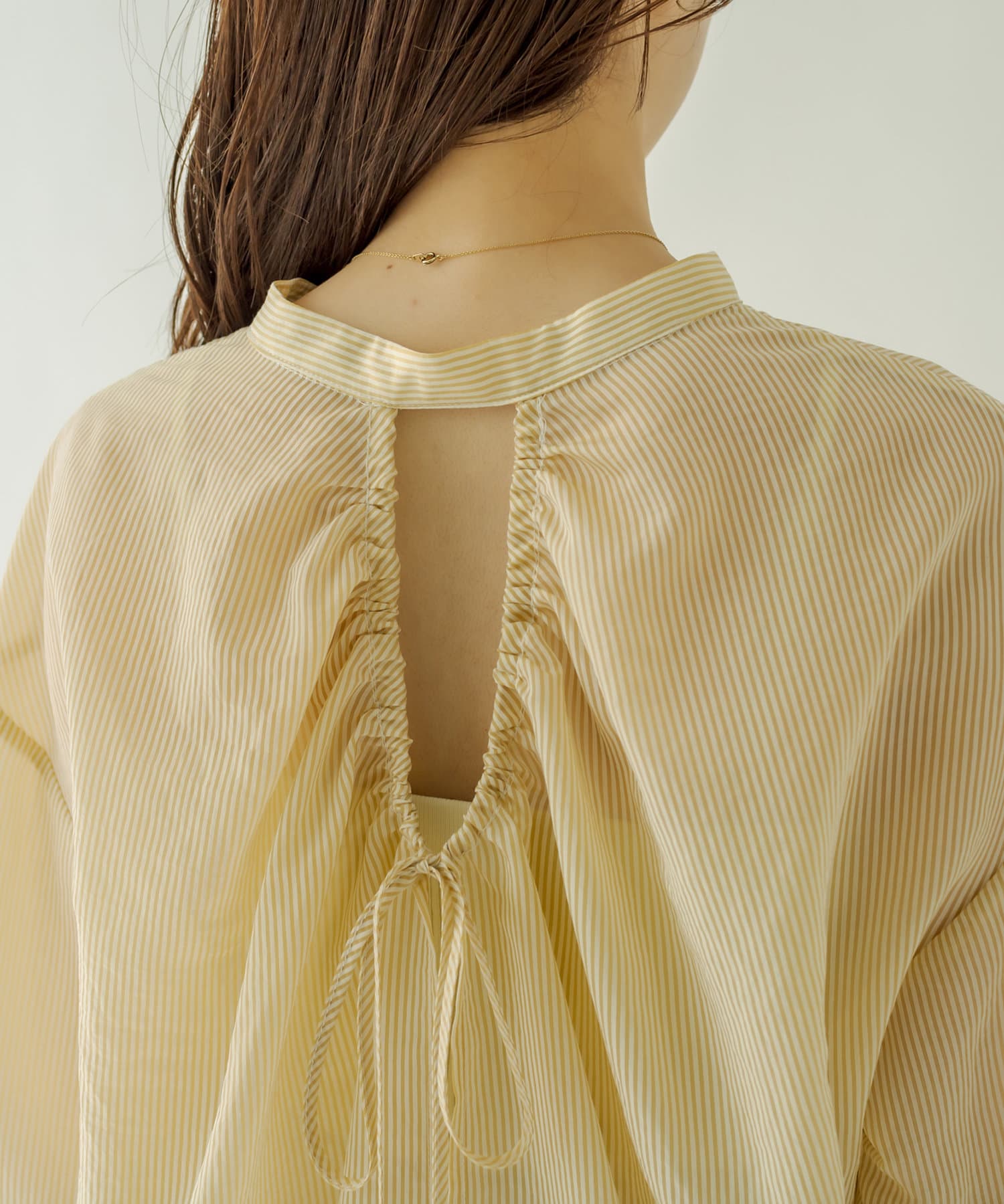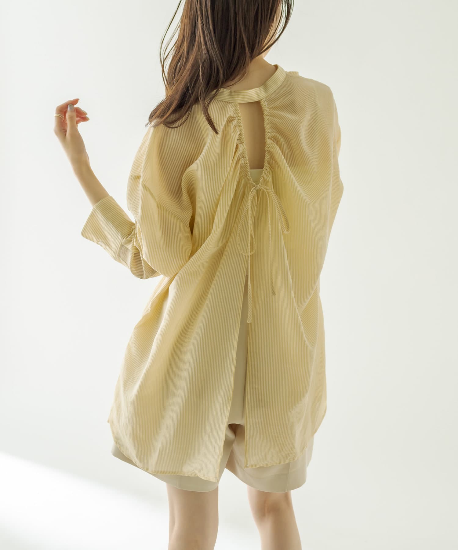 ・程よく開くバックシャンデザインが目を惹くストライプシャツが登場。