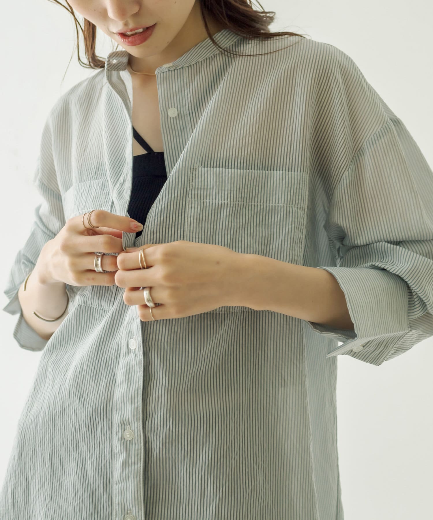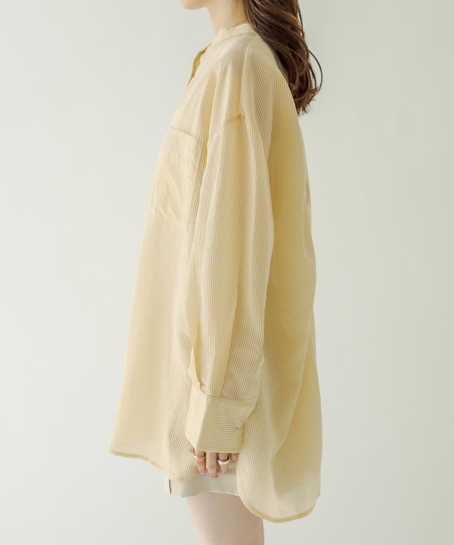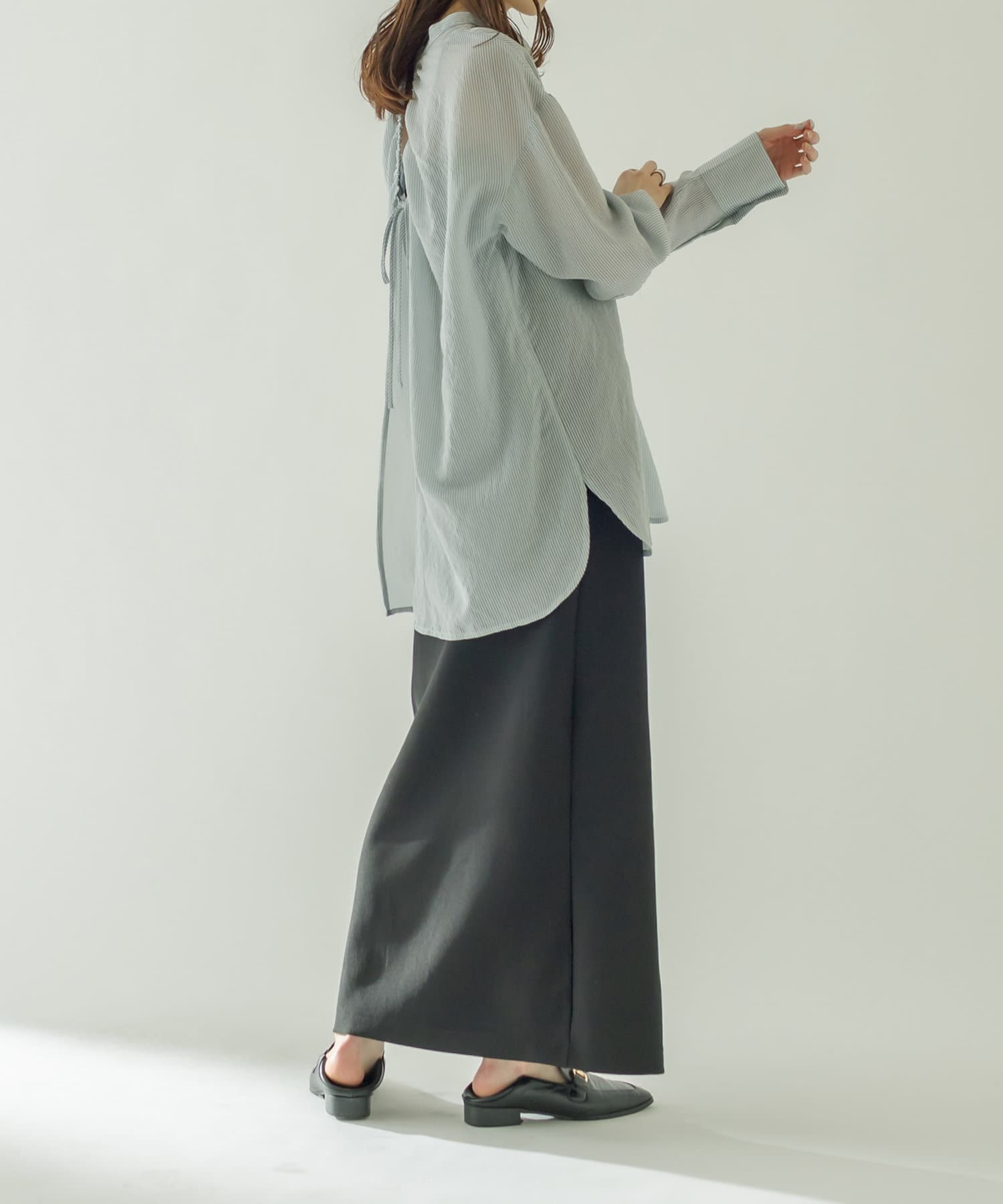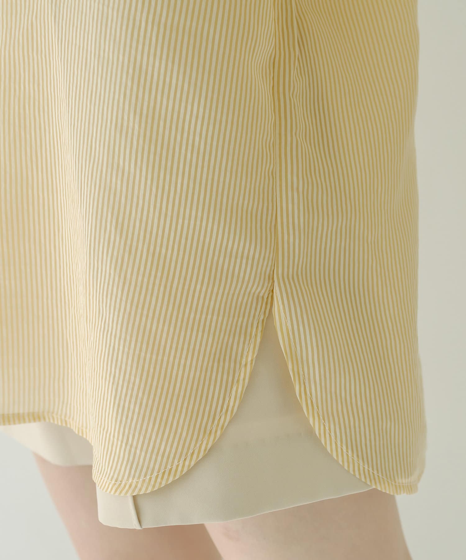 ・程よく開くバックシャンデザインが目を惹くストライプシャツが登場。