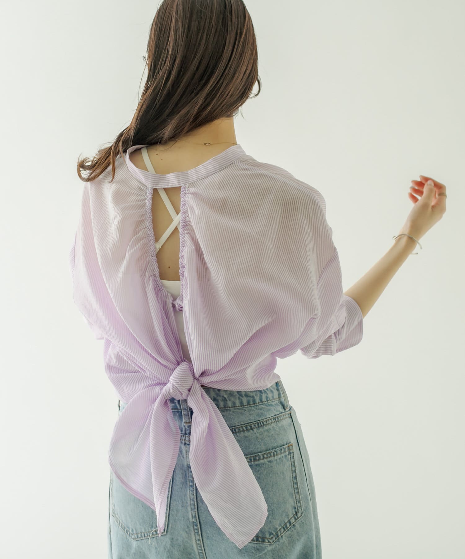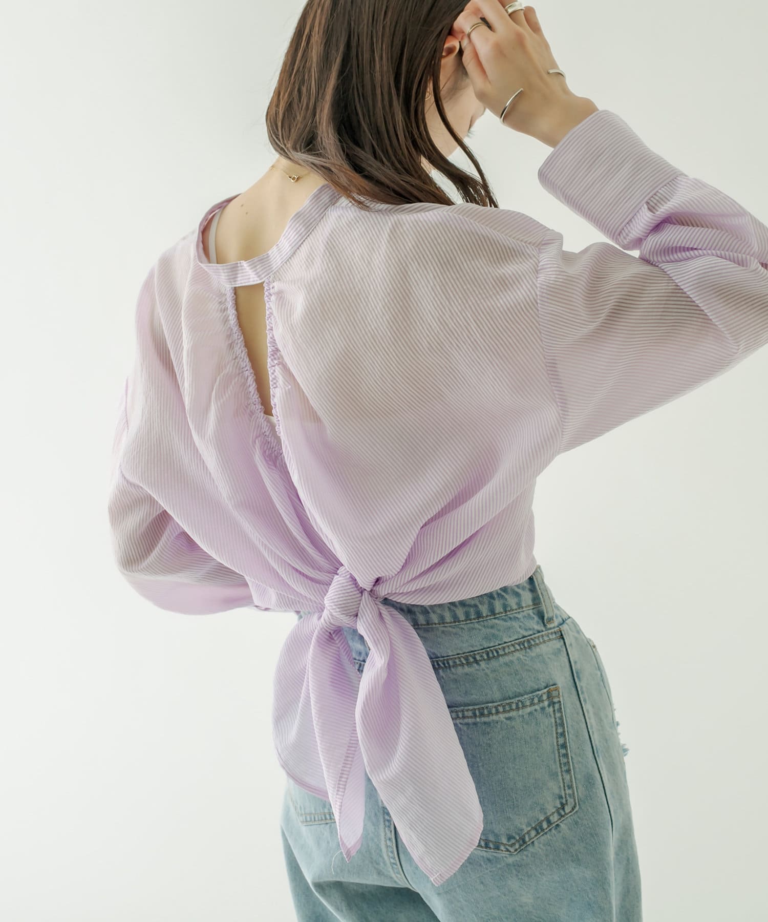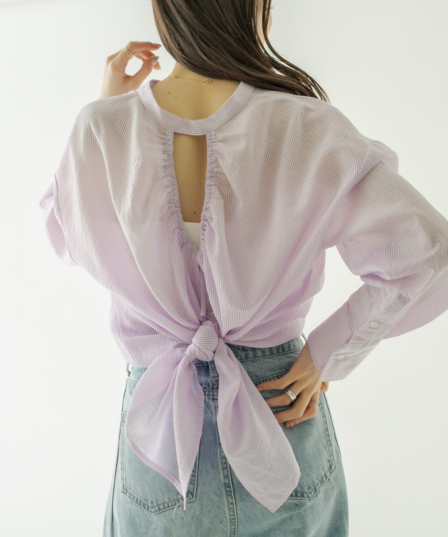 ・程よく開くバックシャンデザインが目を惹くストライプシャツが登場。