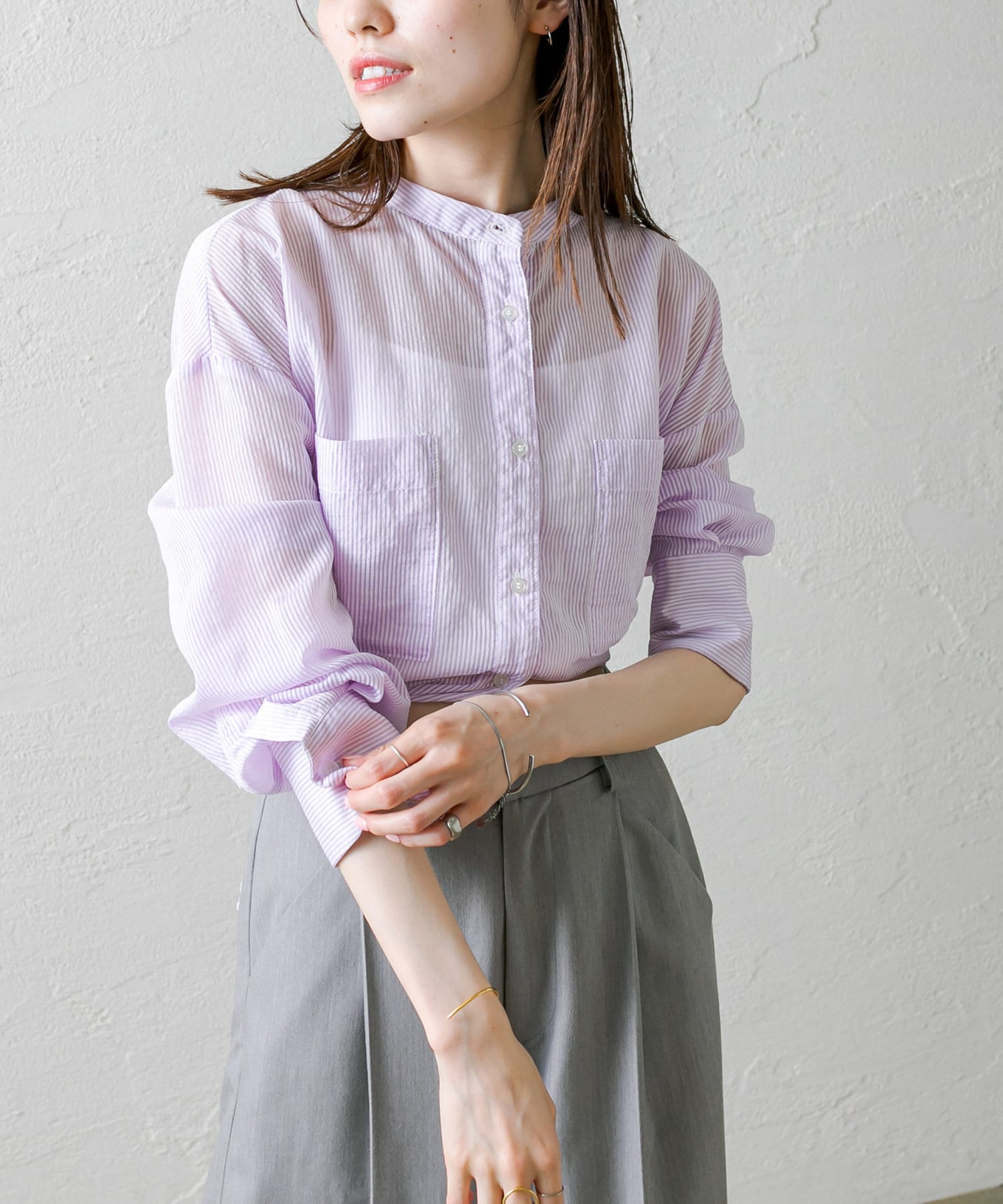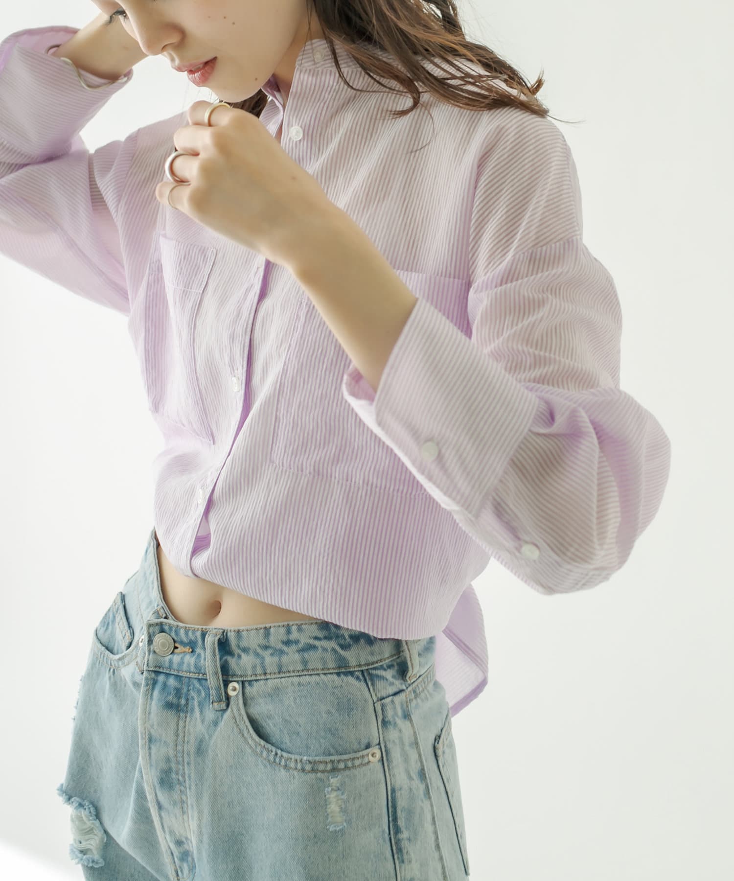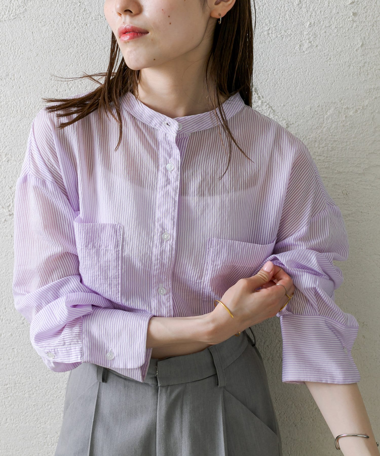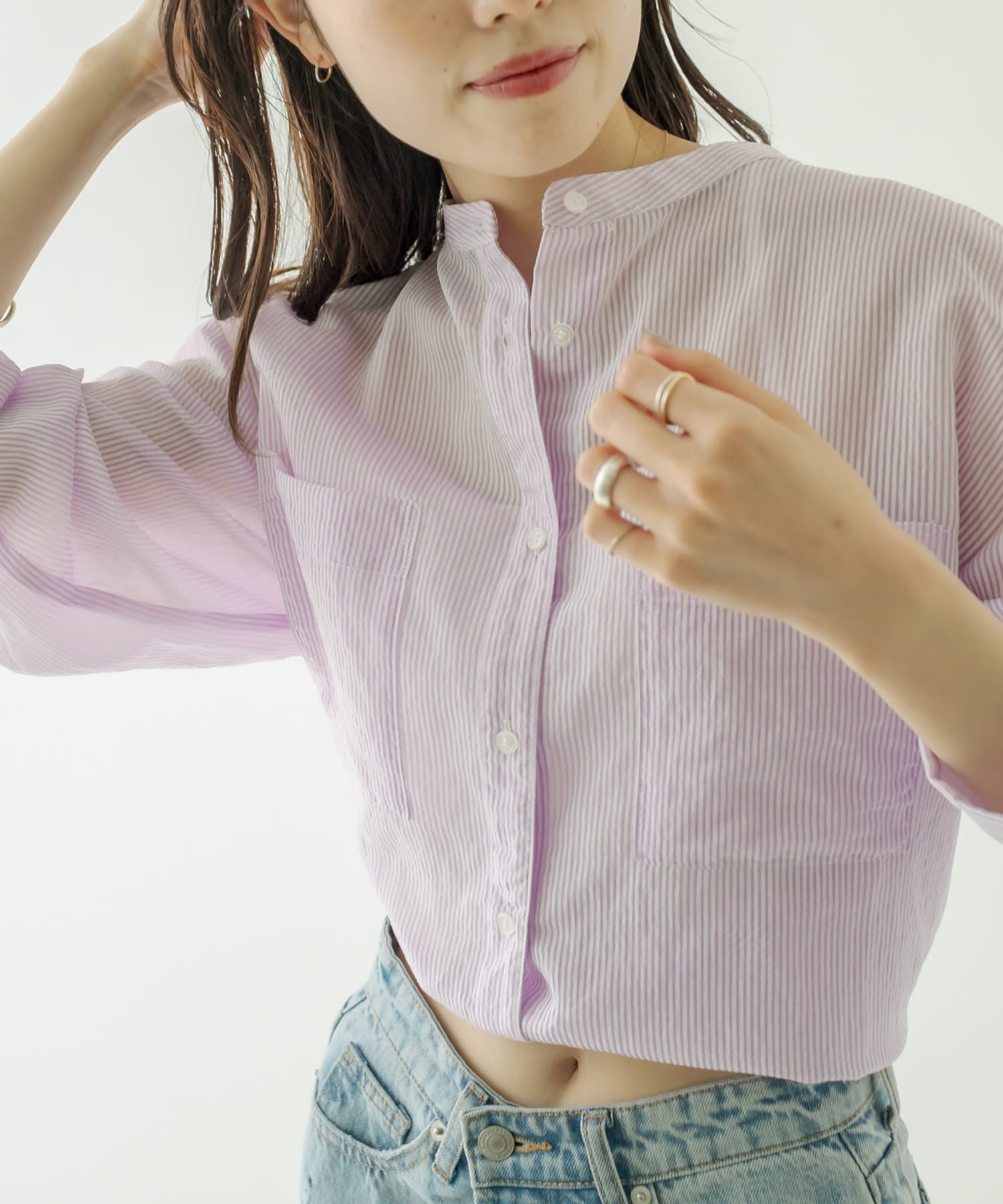 ・程よく開くバックシャンデザインが目を惹くストライプシャツが登場。