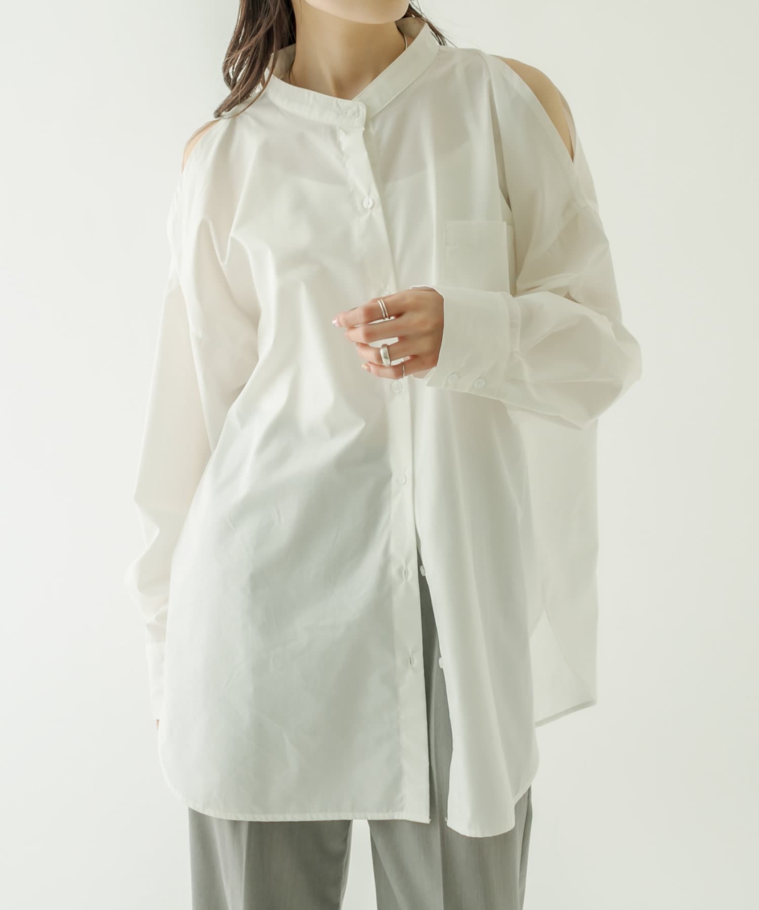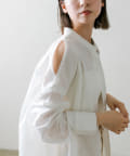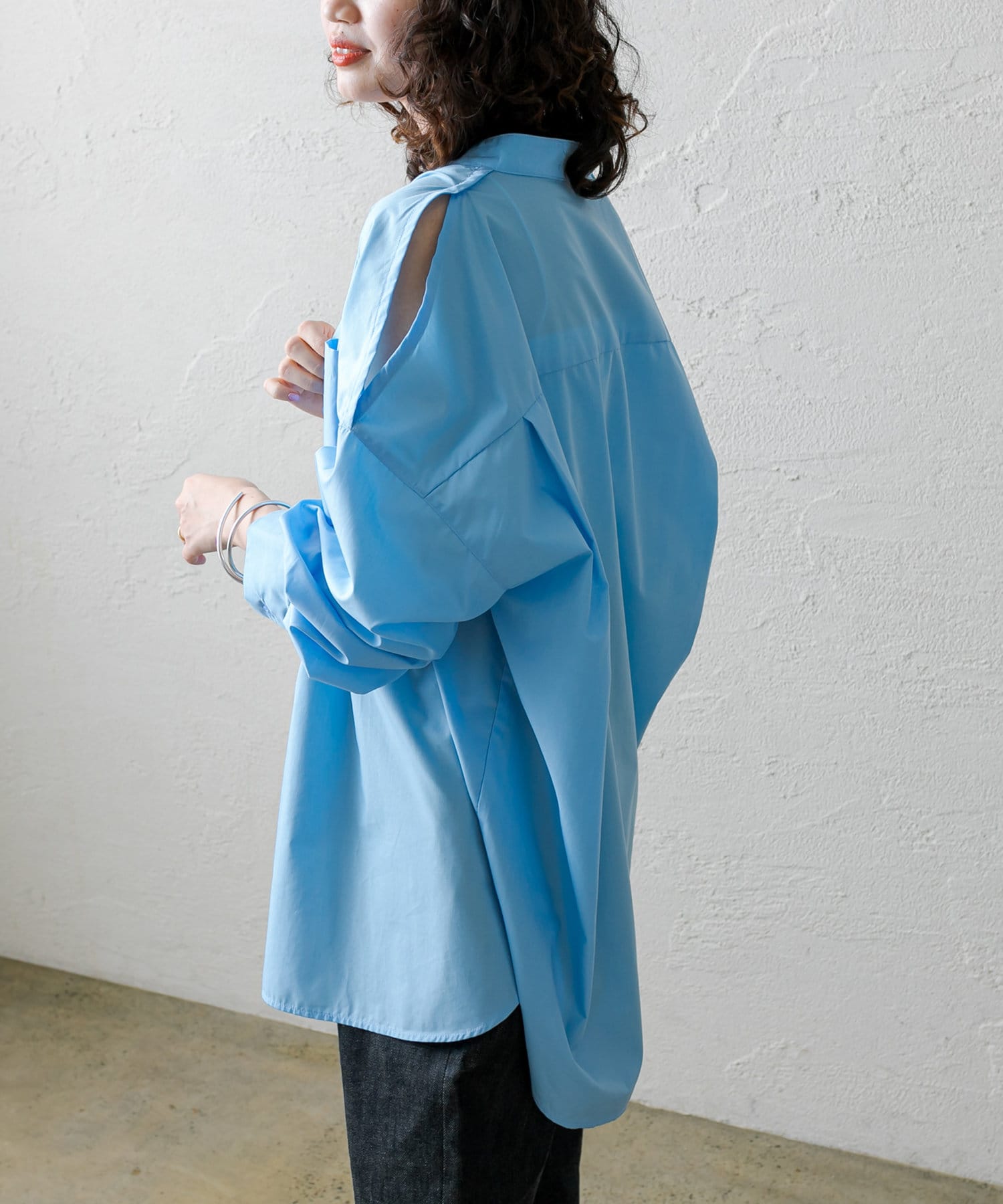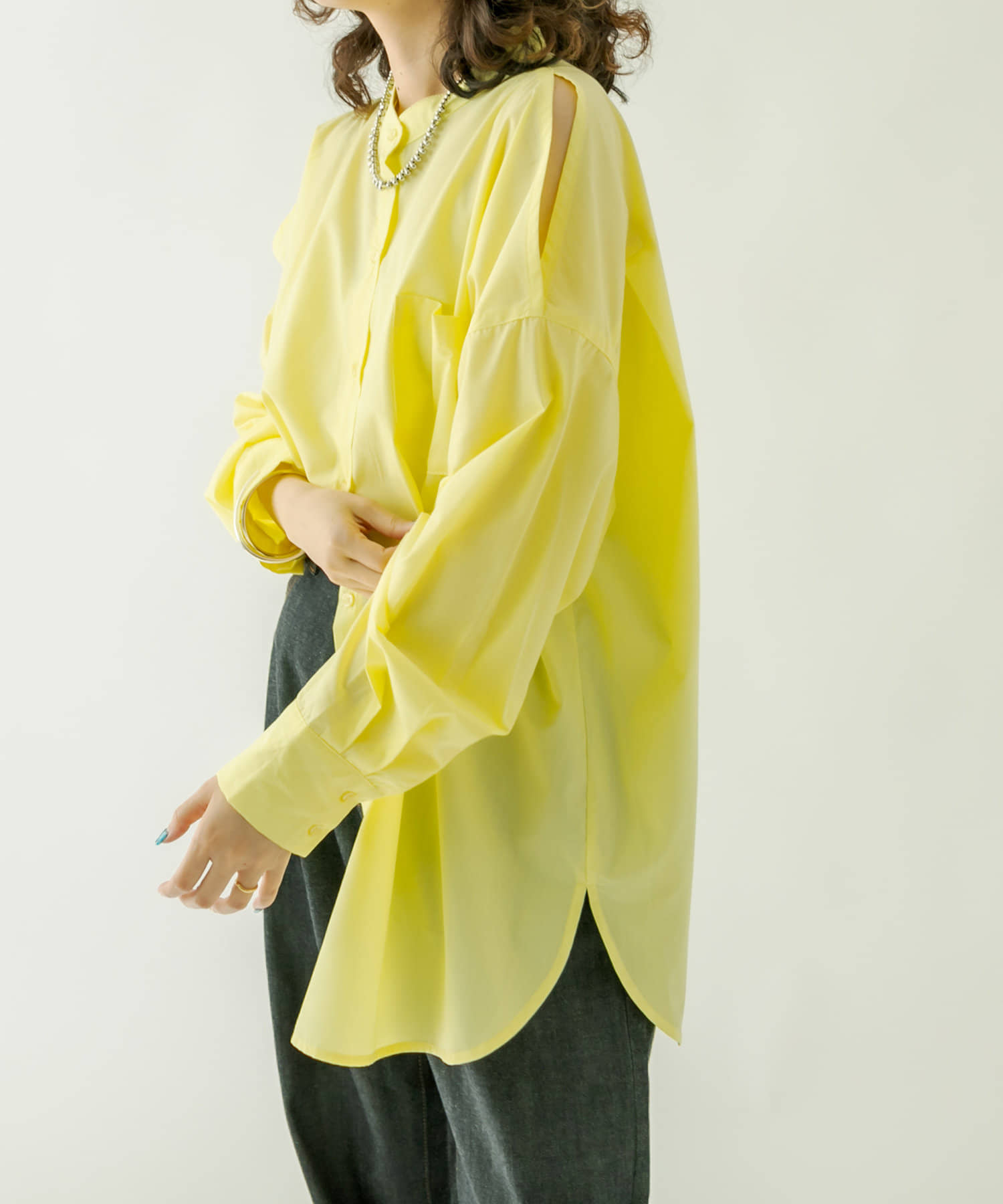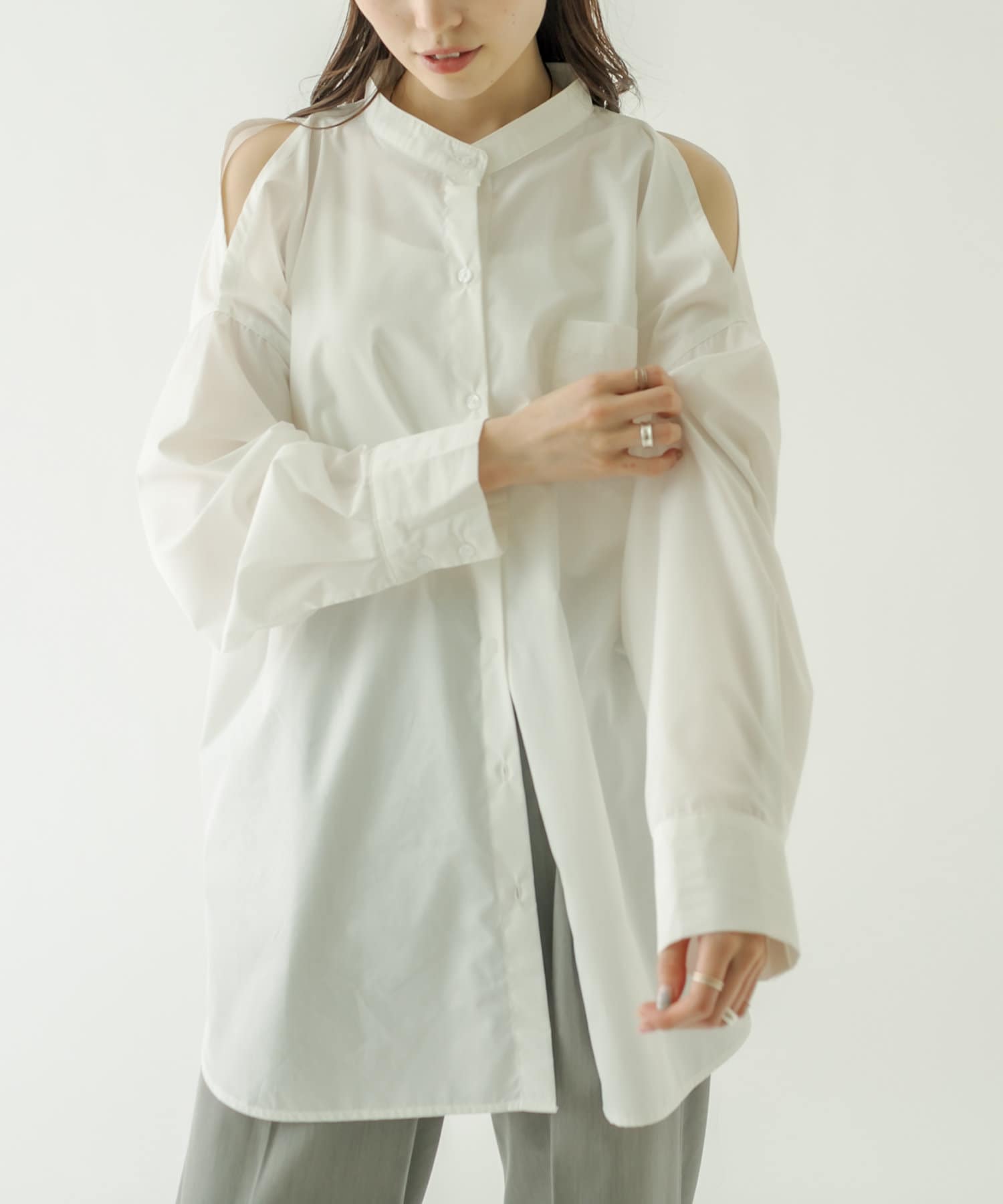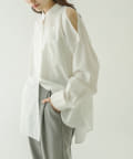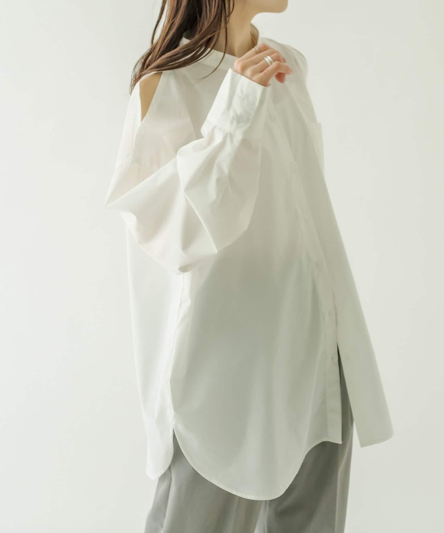 ・肩開きのデザインが1枚でこなれた印象に決まるデザインシャツ。