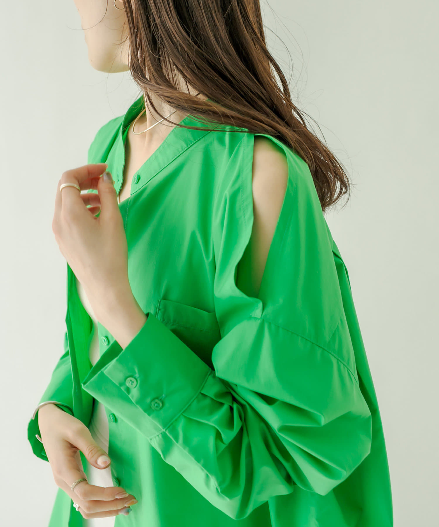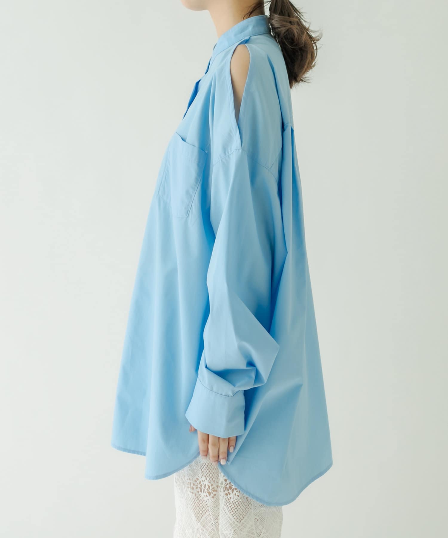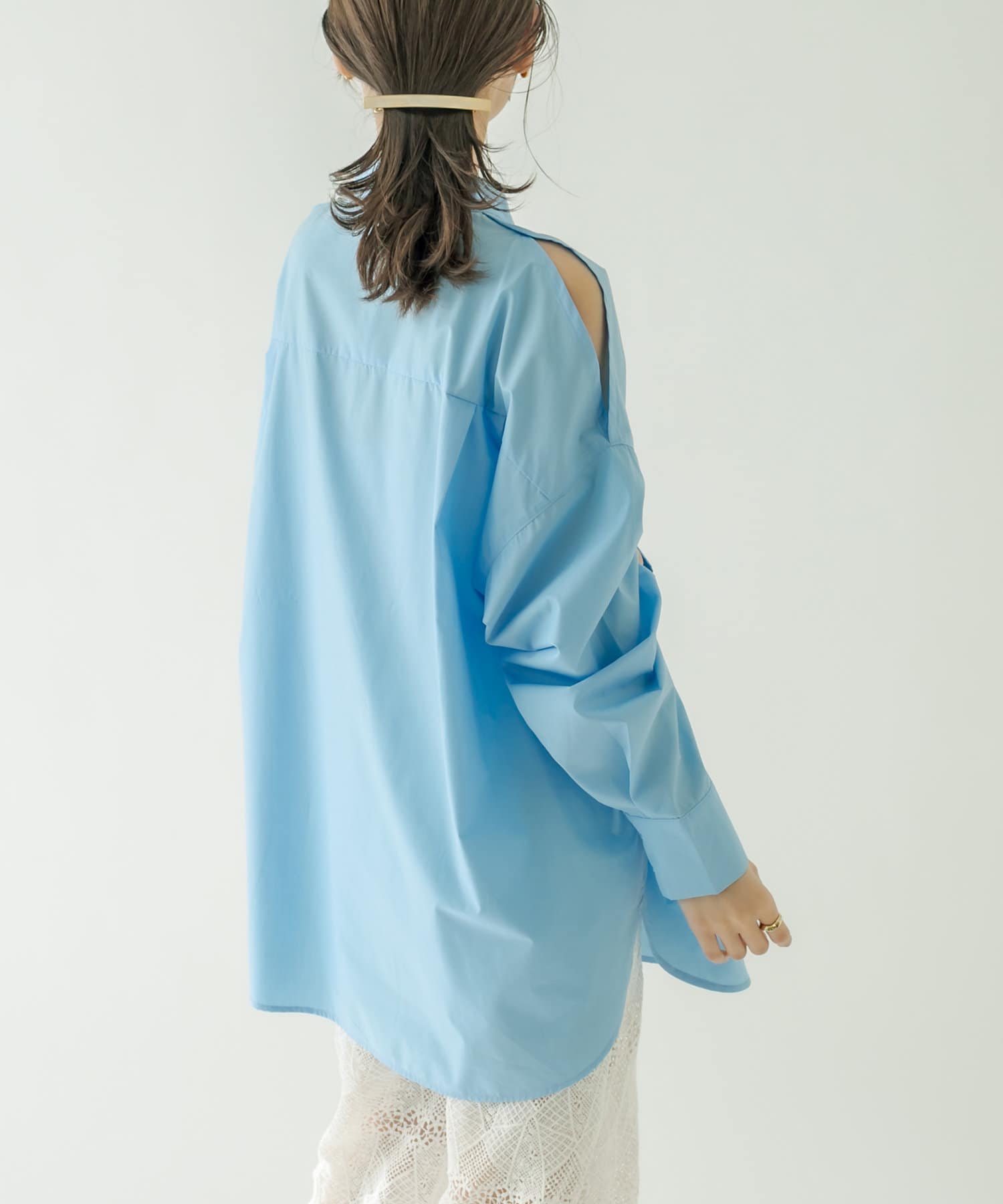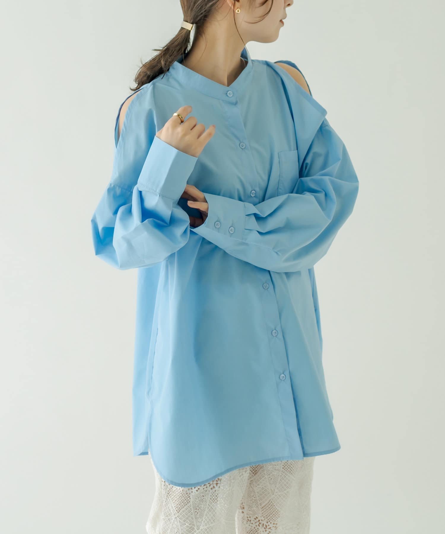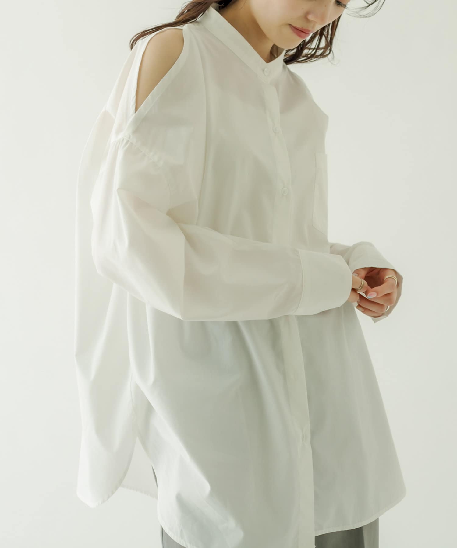 ・肩開きのデザインが1枚でこなれた印象に決まるデザインシャツ。