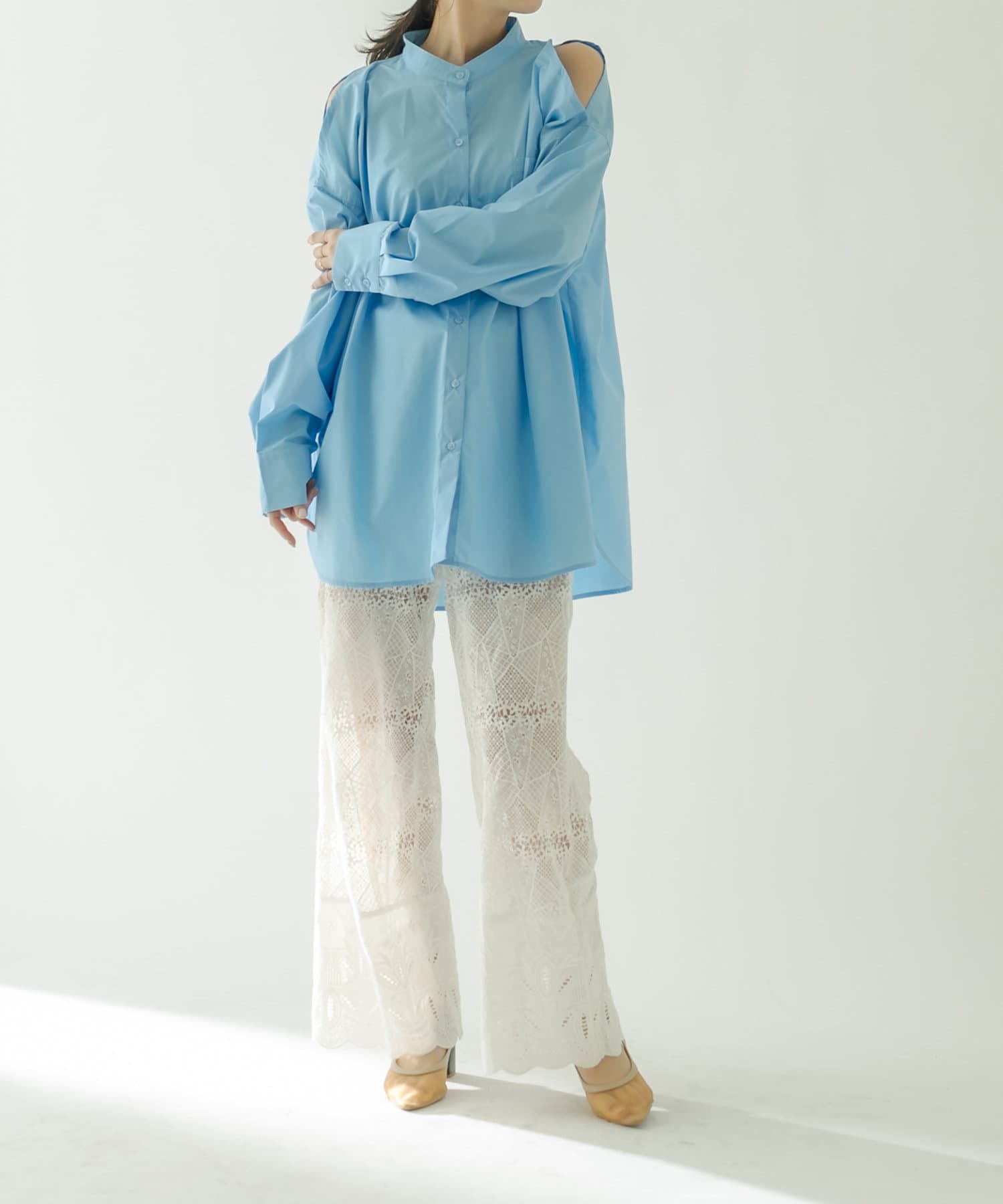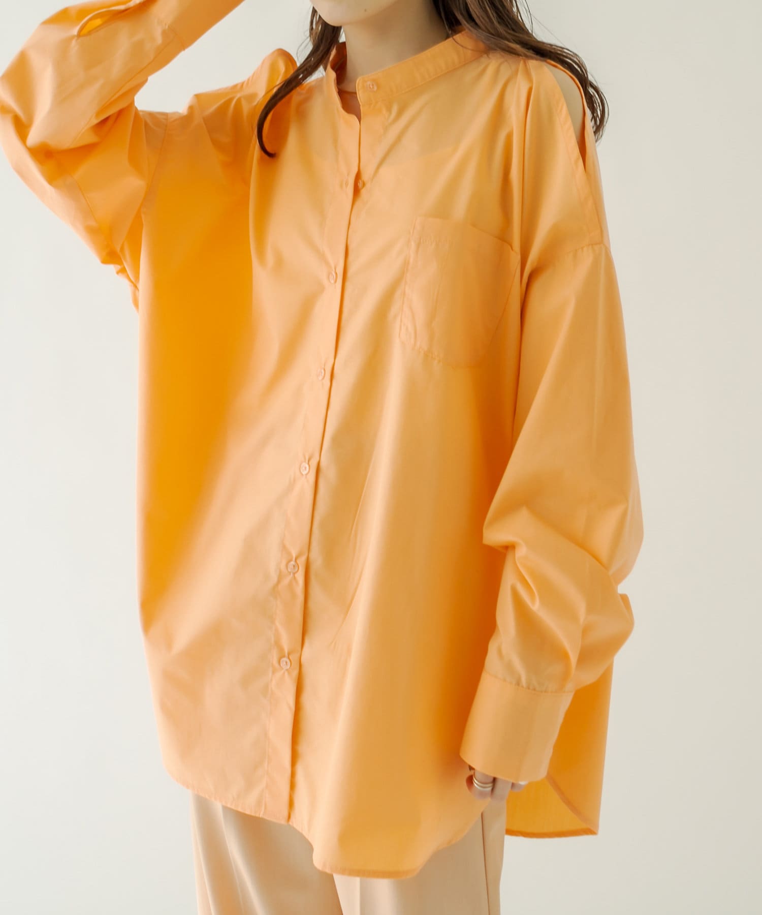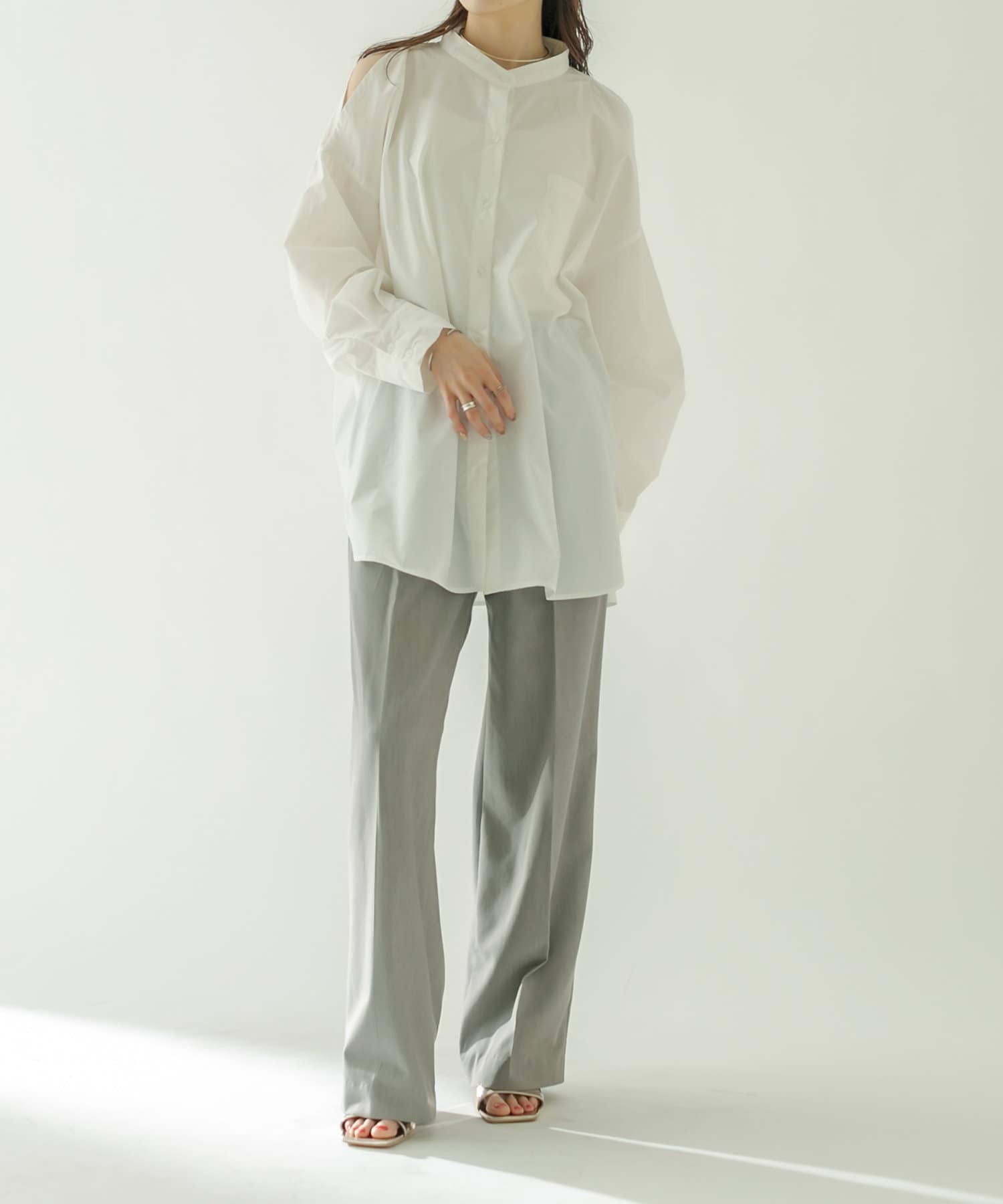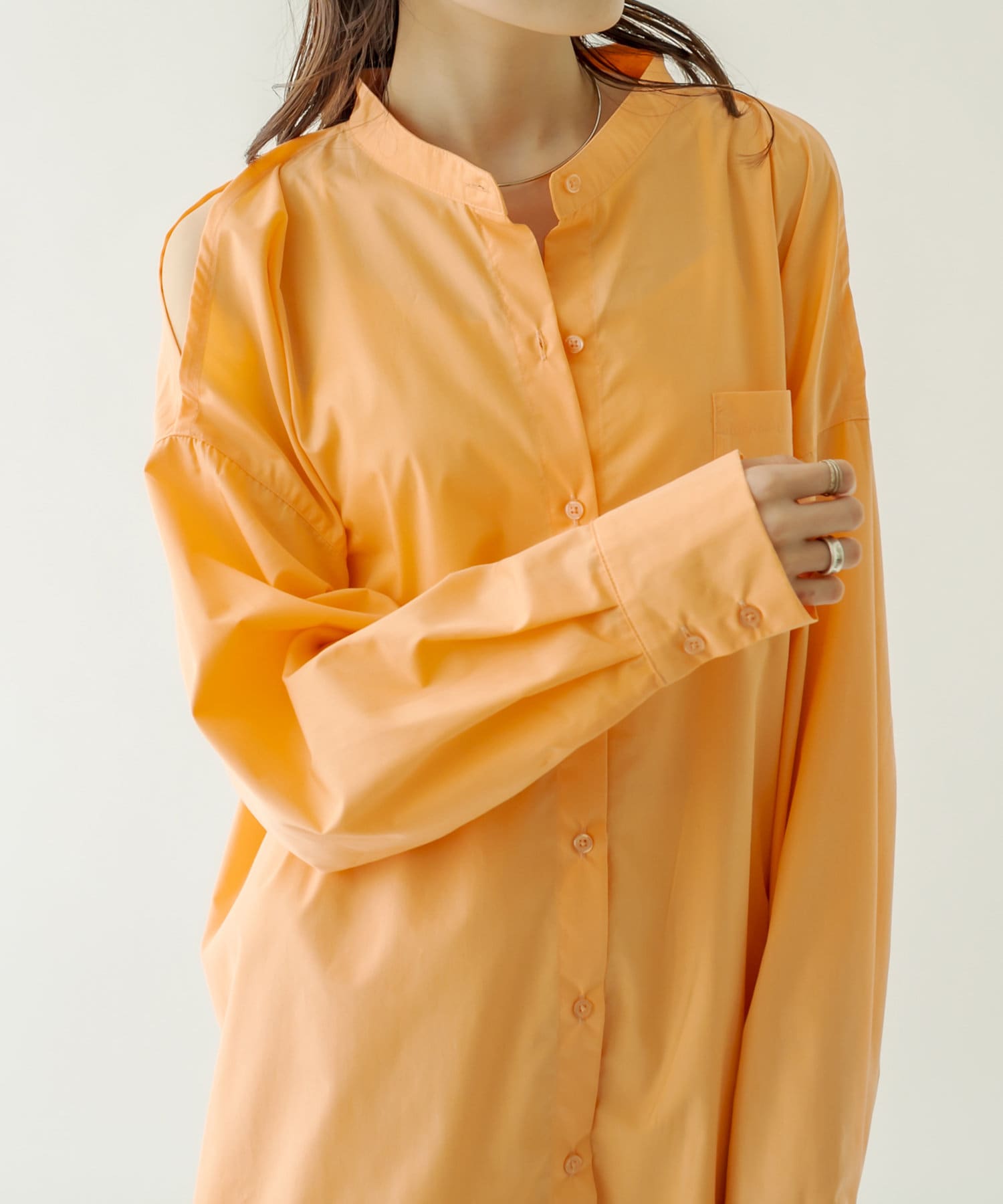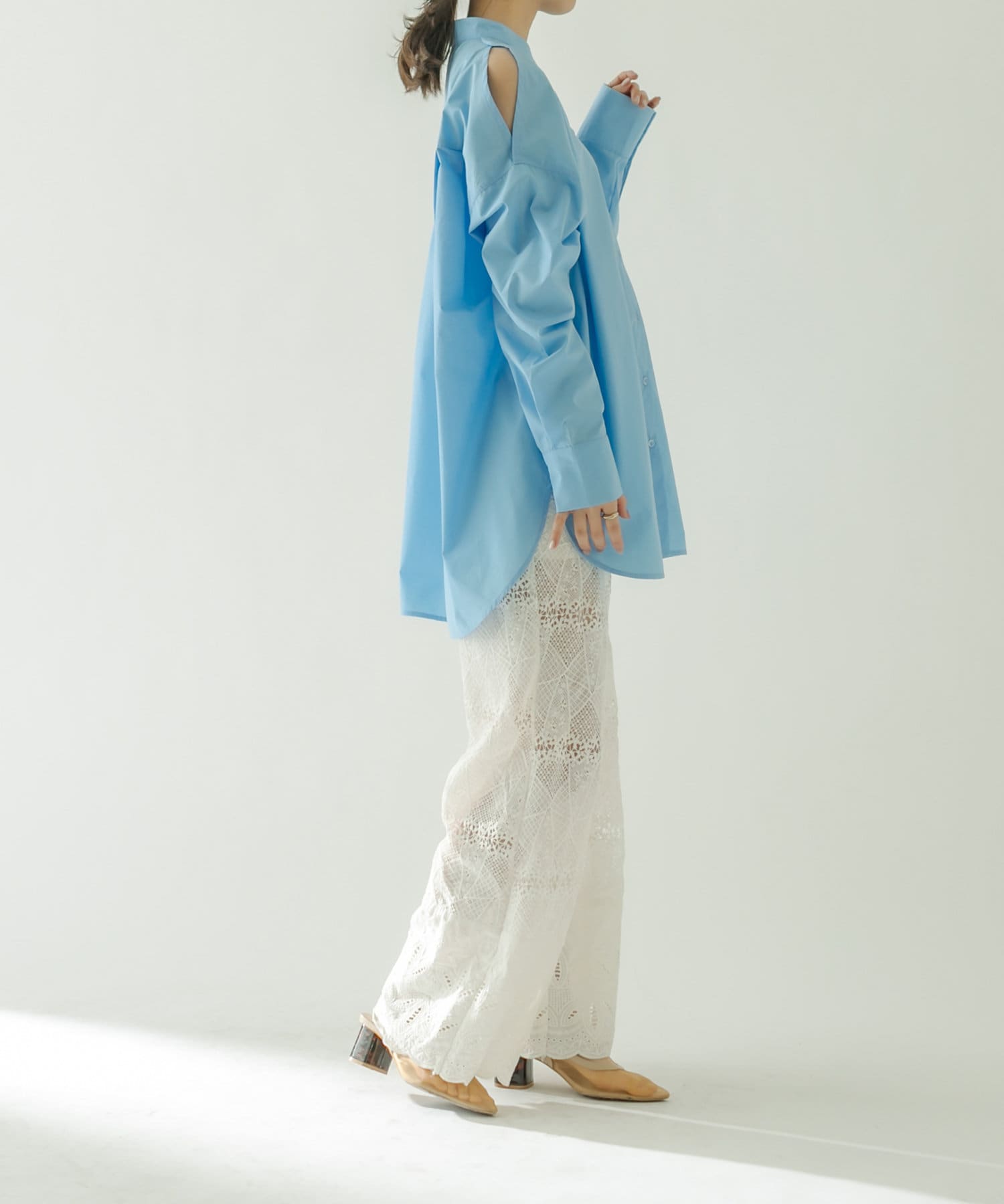 ・肩開きのデザインが1枚でこなれた印象に決まるデザインシャツ。