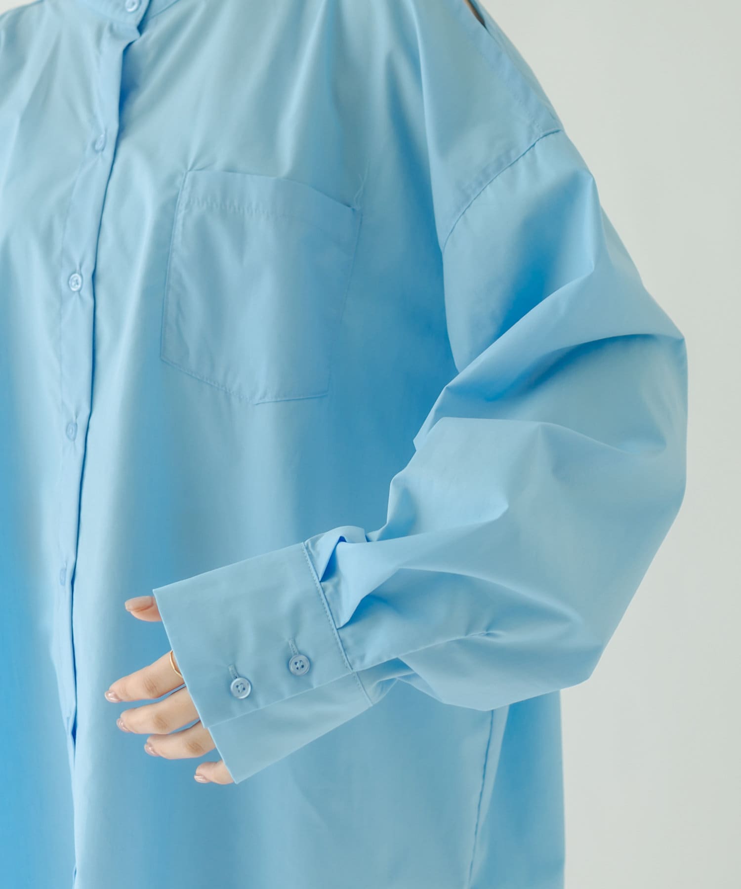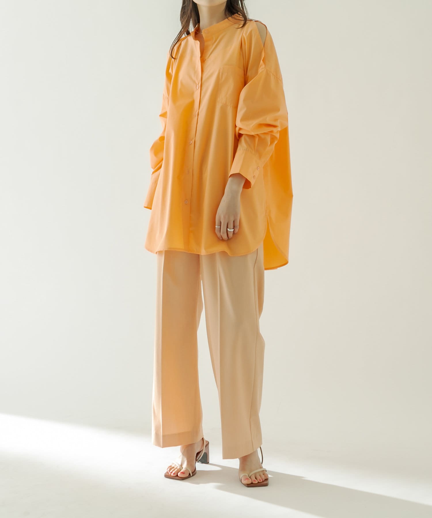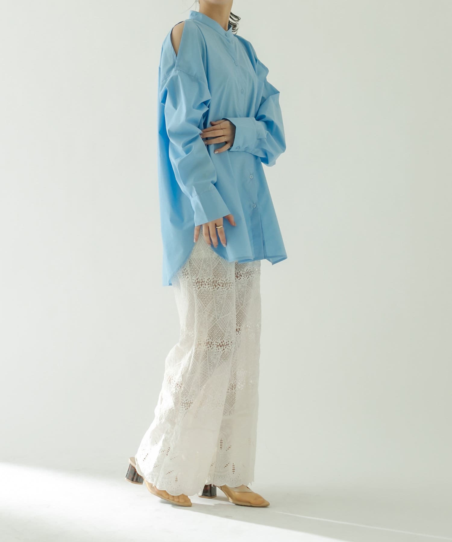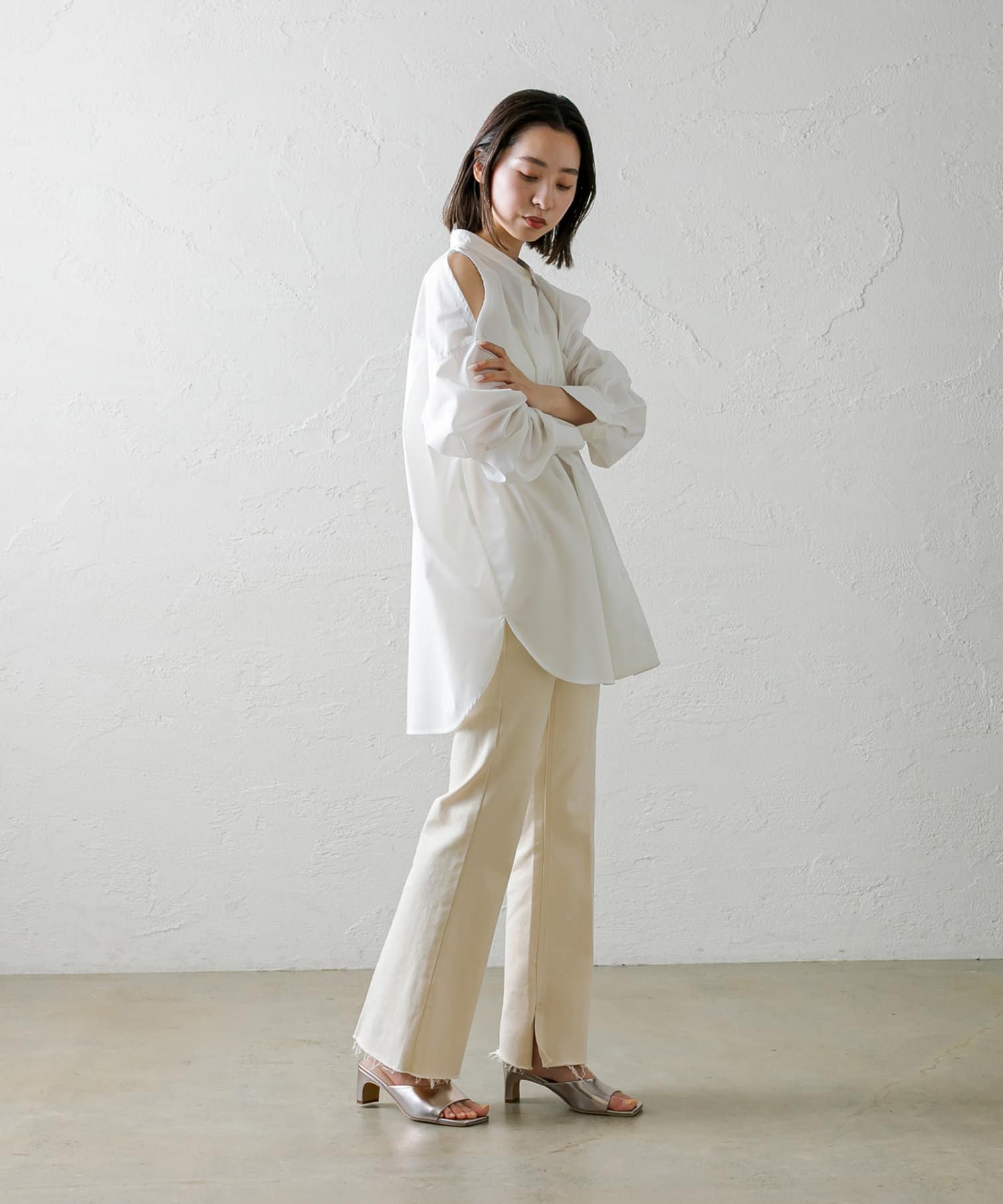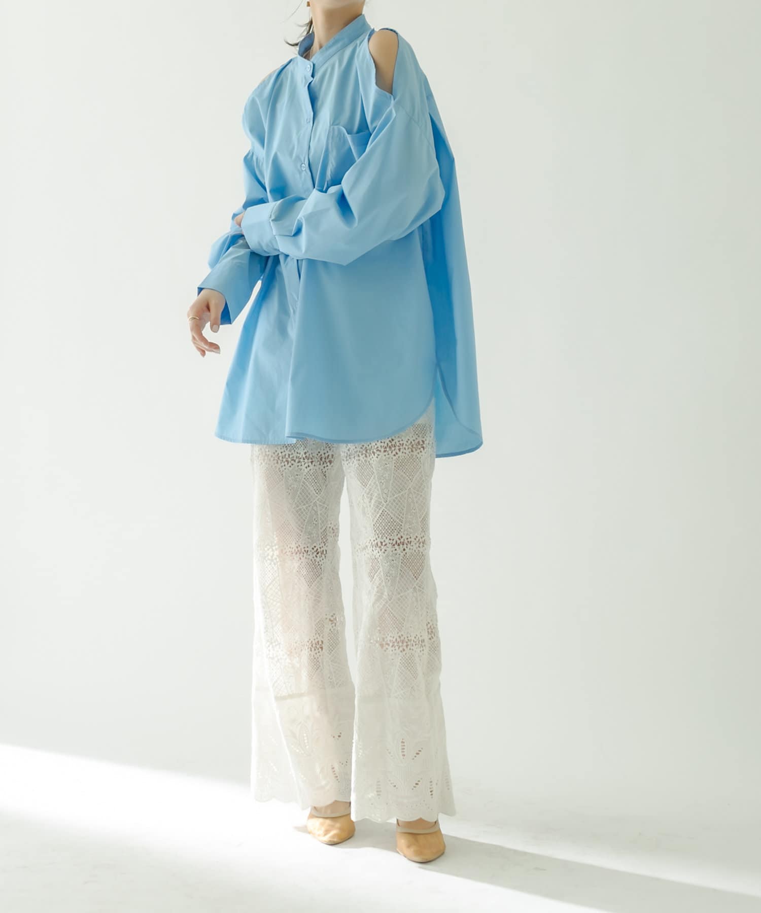 ・肩開きのデザインが1枚でこなれた印象に決まるデザインシャツ。