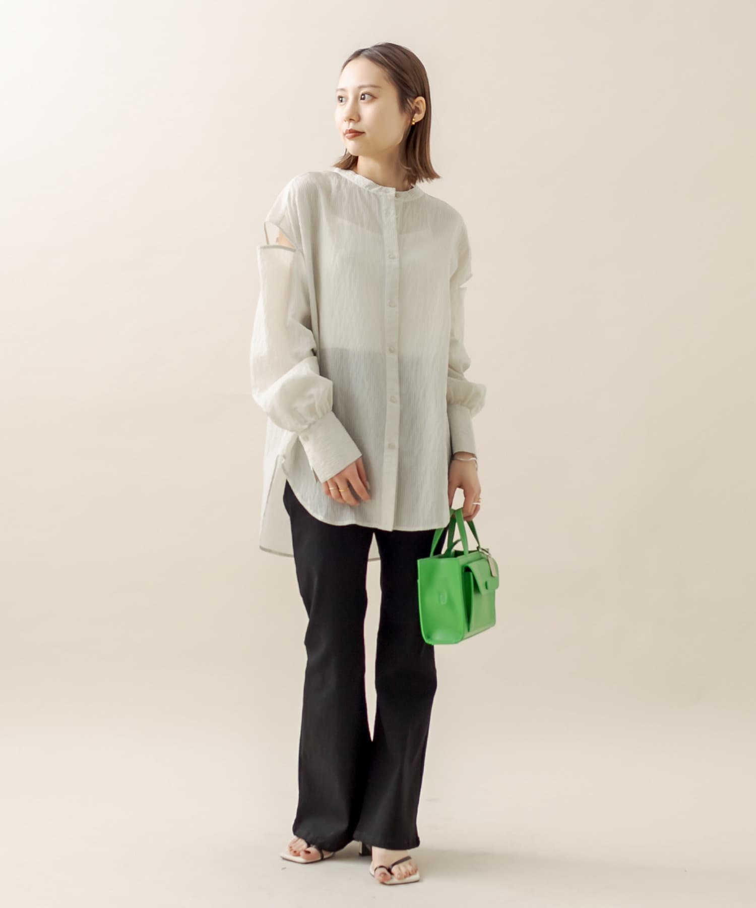 大人な印象になるシャツ、肩開きデザインがポイントで周りと差をつけて!