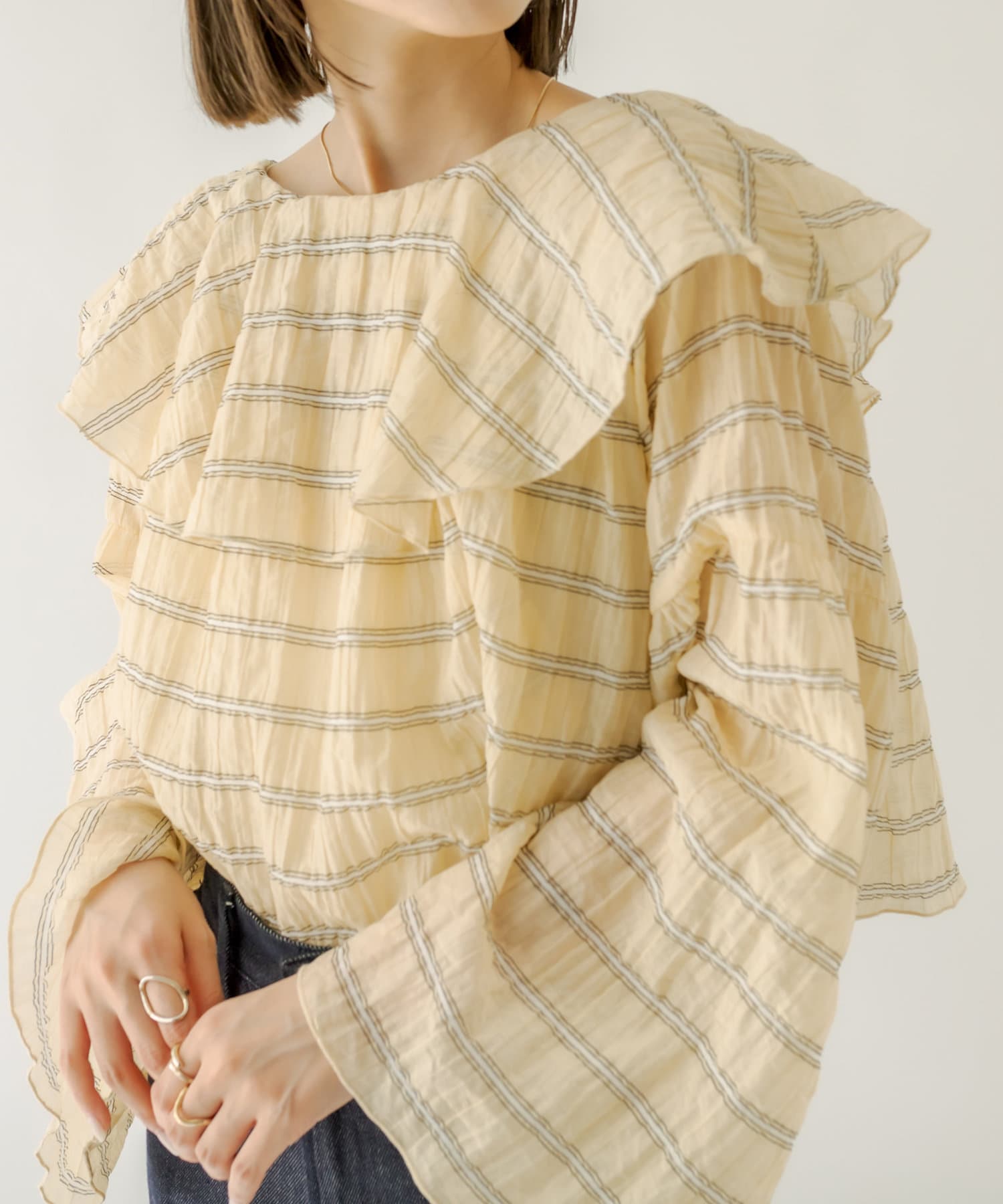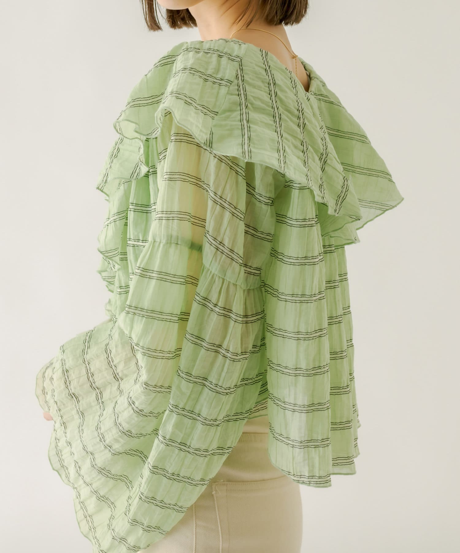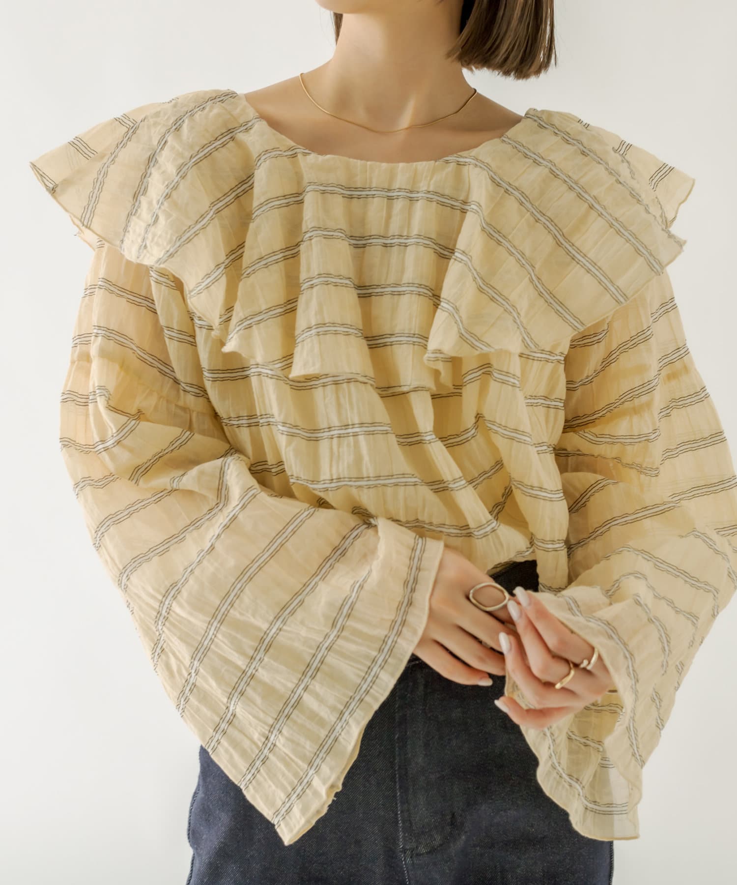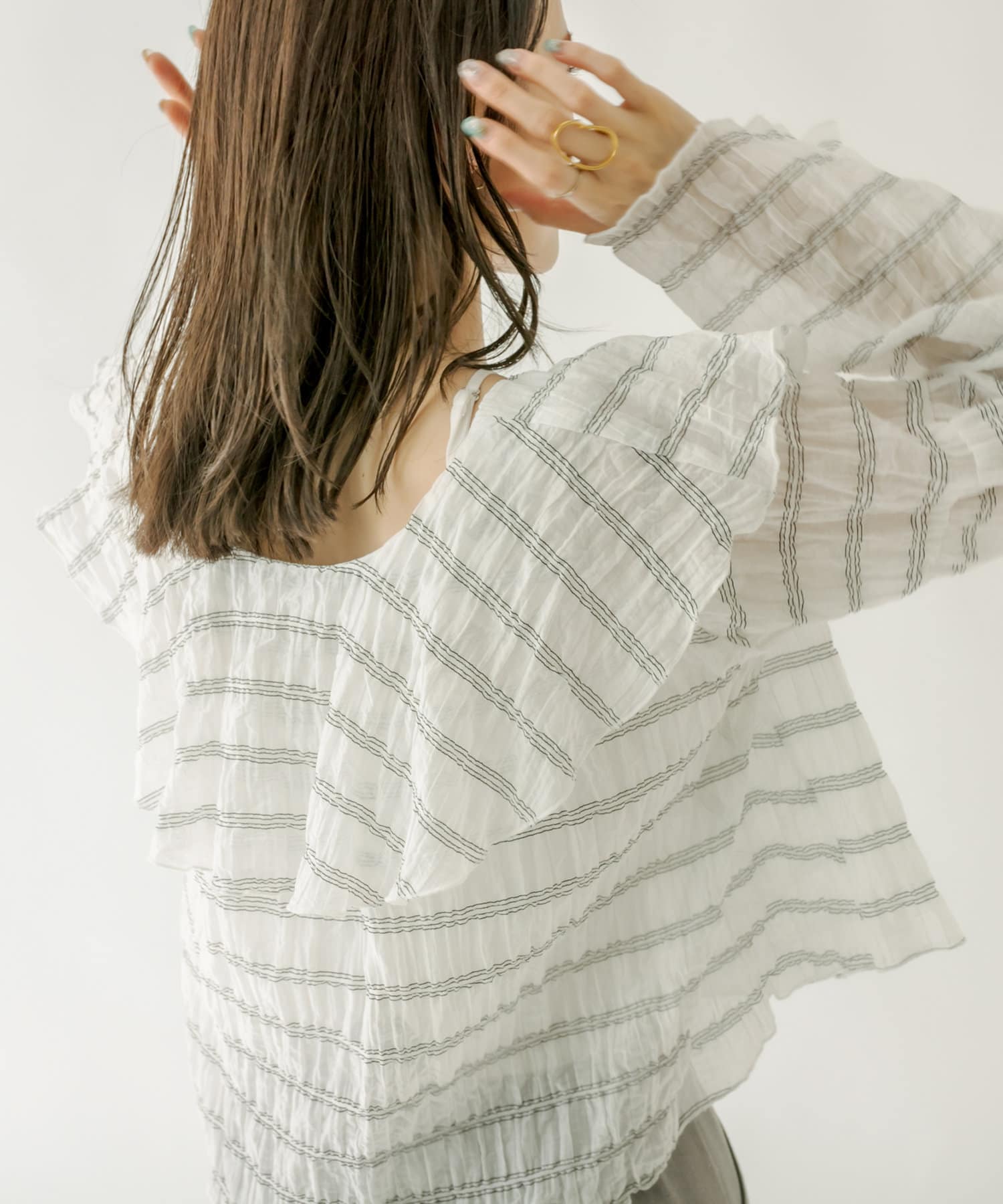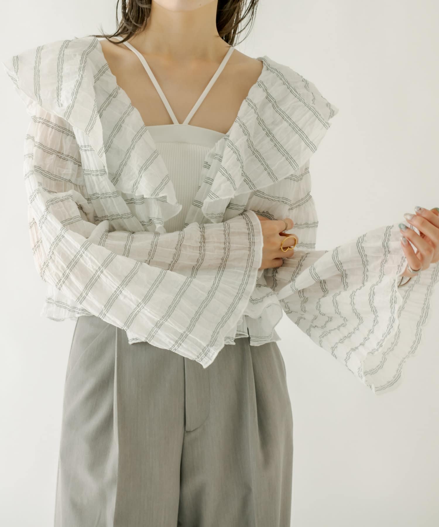 ラッフルデザインが華やかな印象のシアーブラウス!
