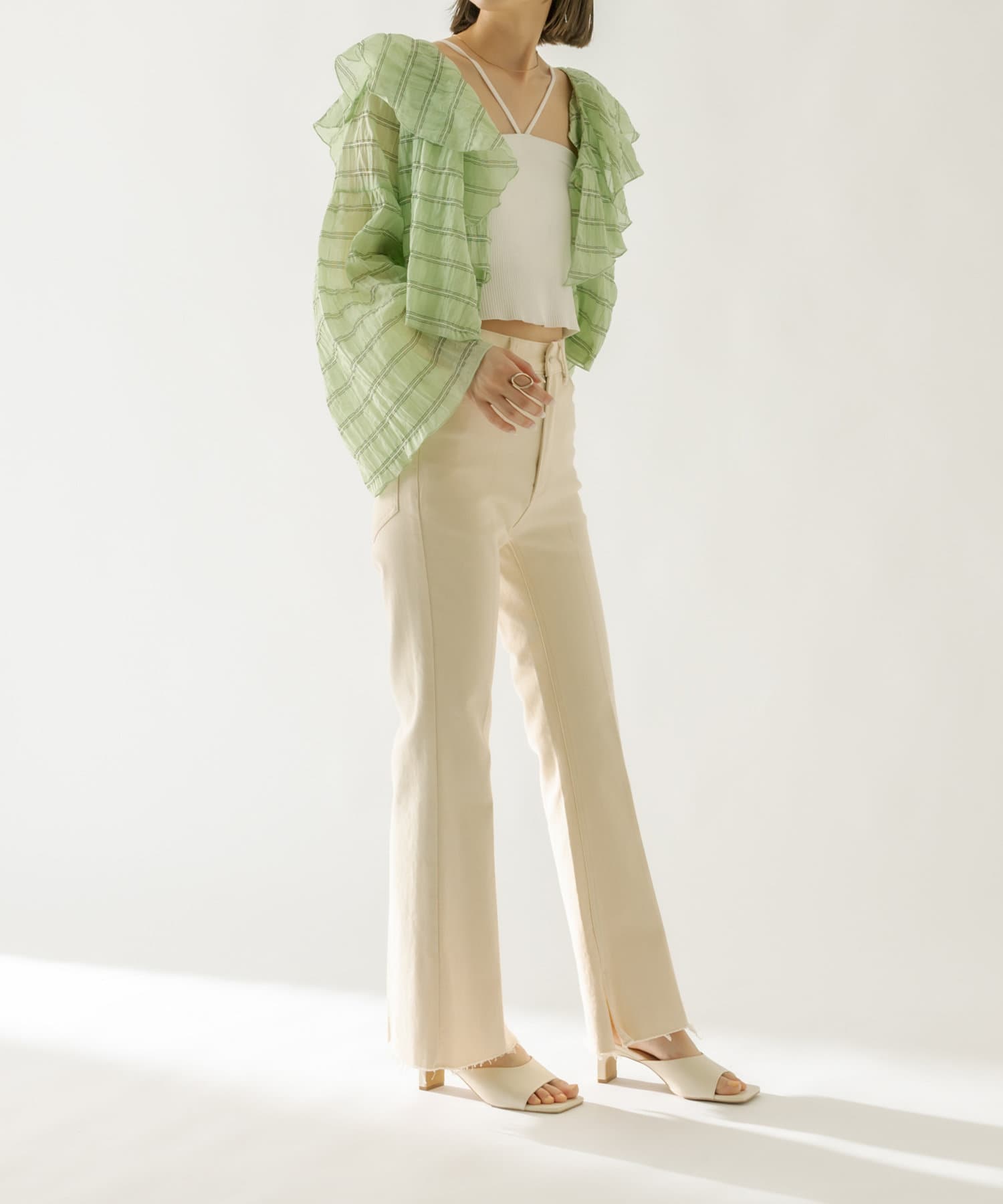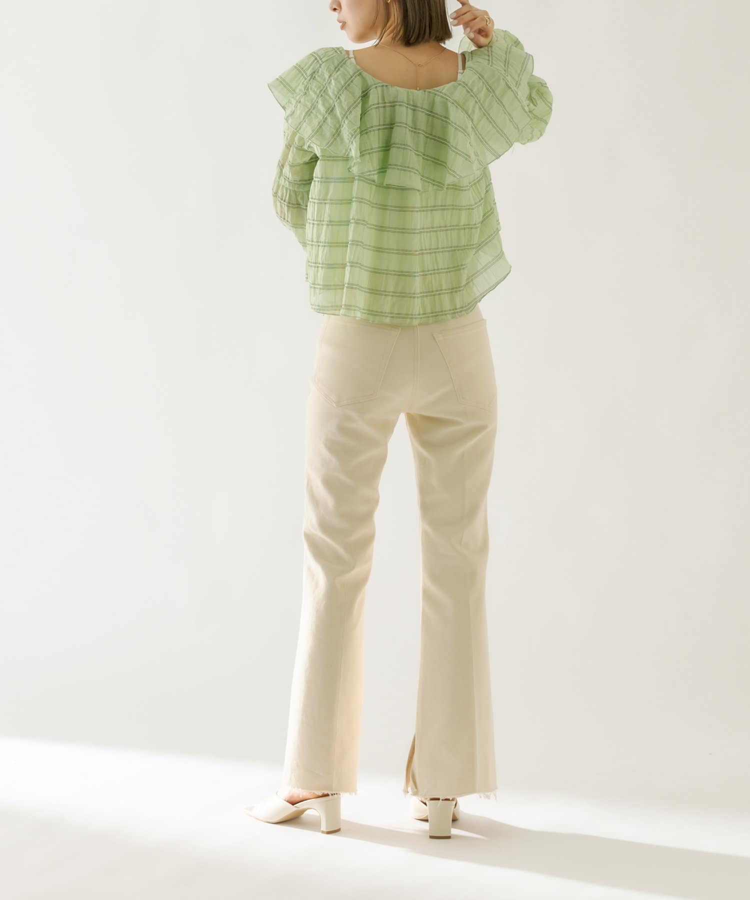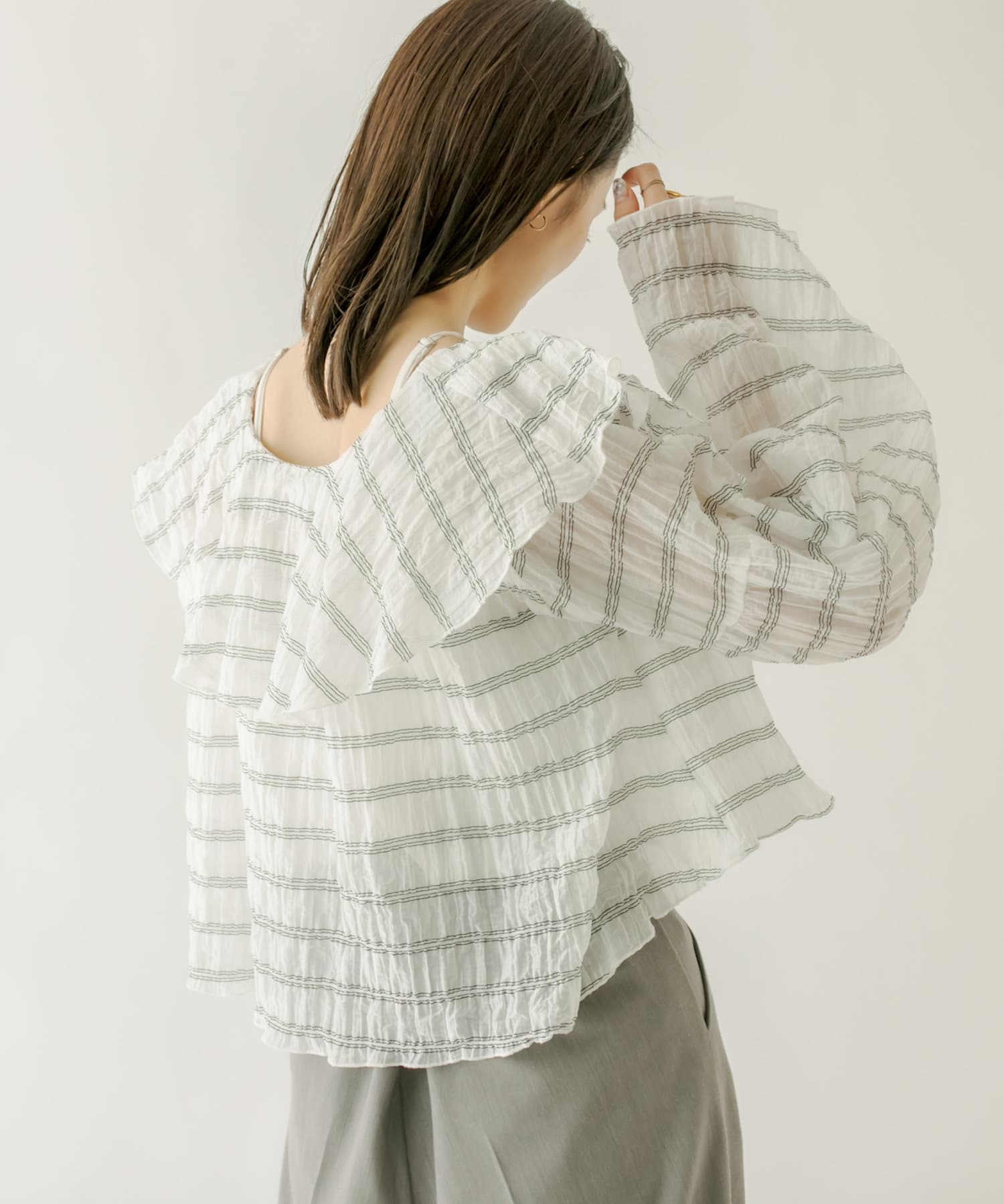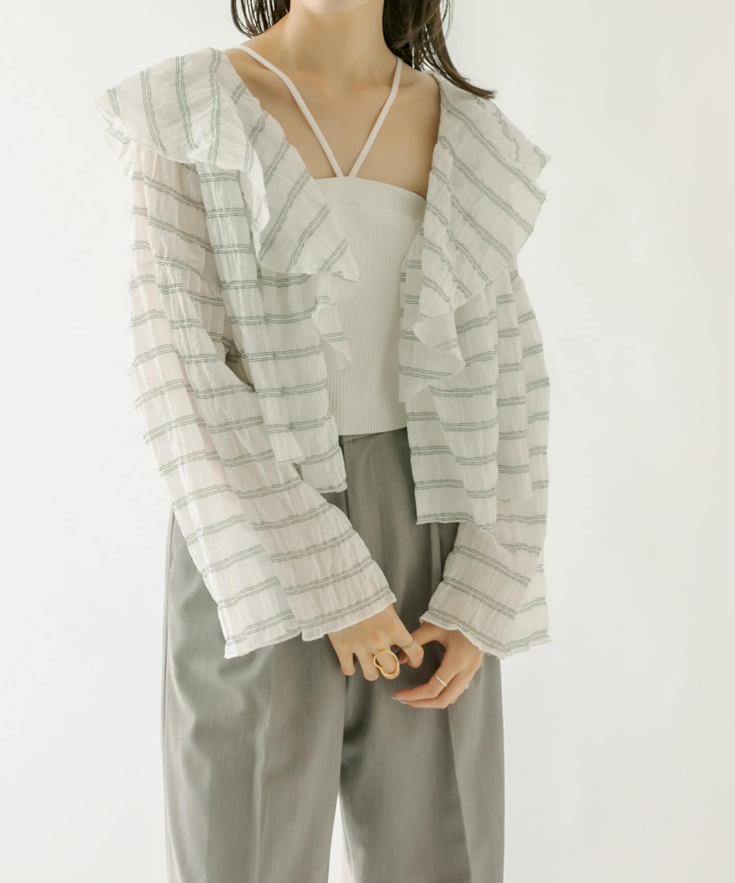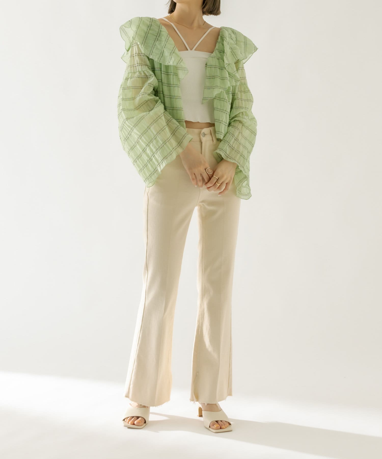 ラッフルデザインが華やかな印象のシアーブラウス!