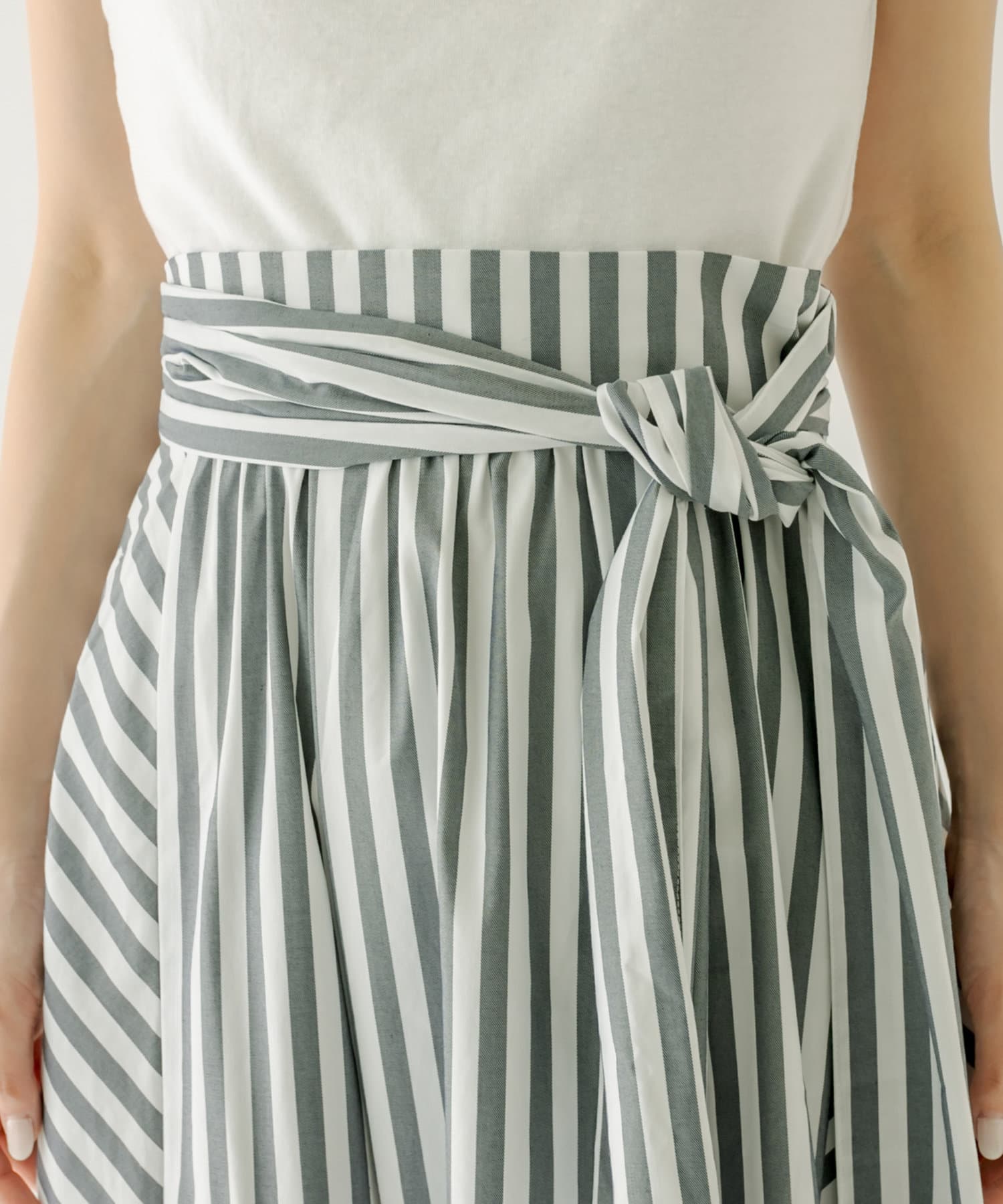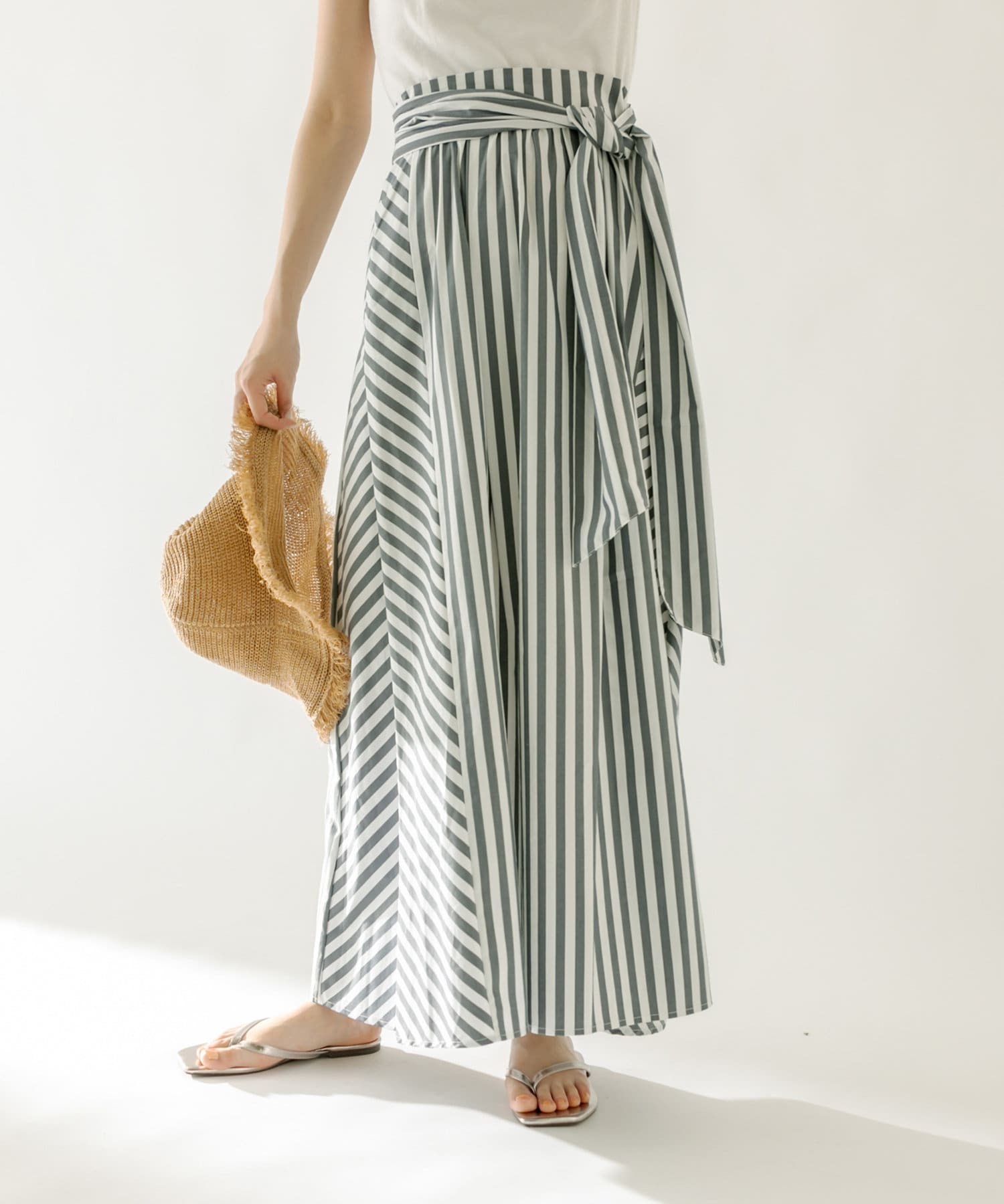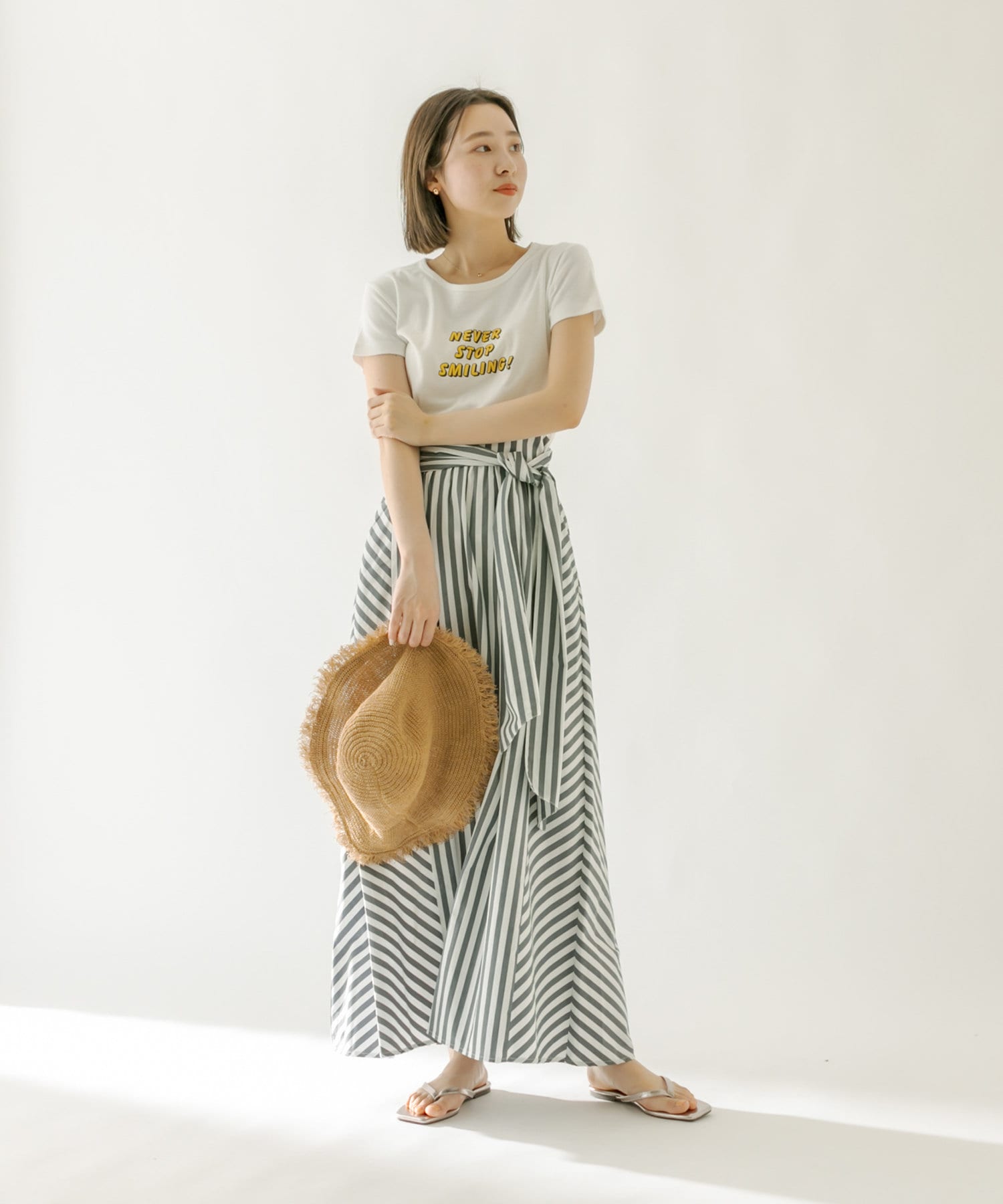 ストライプが爽やかでウエストのリボンもアクセントとしてかわいいです!トップスはシンプルなもので十分です!