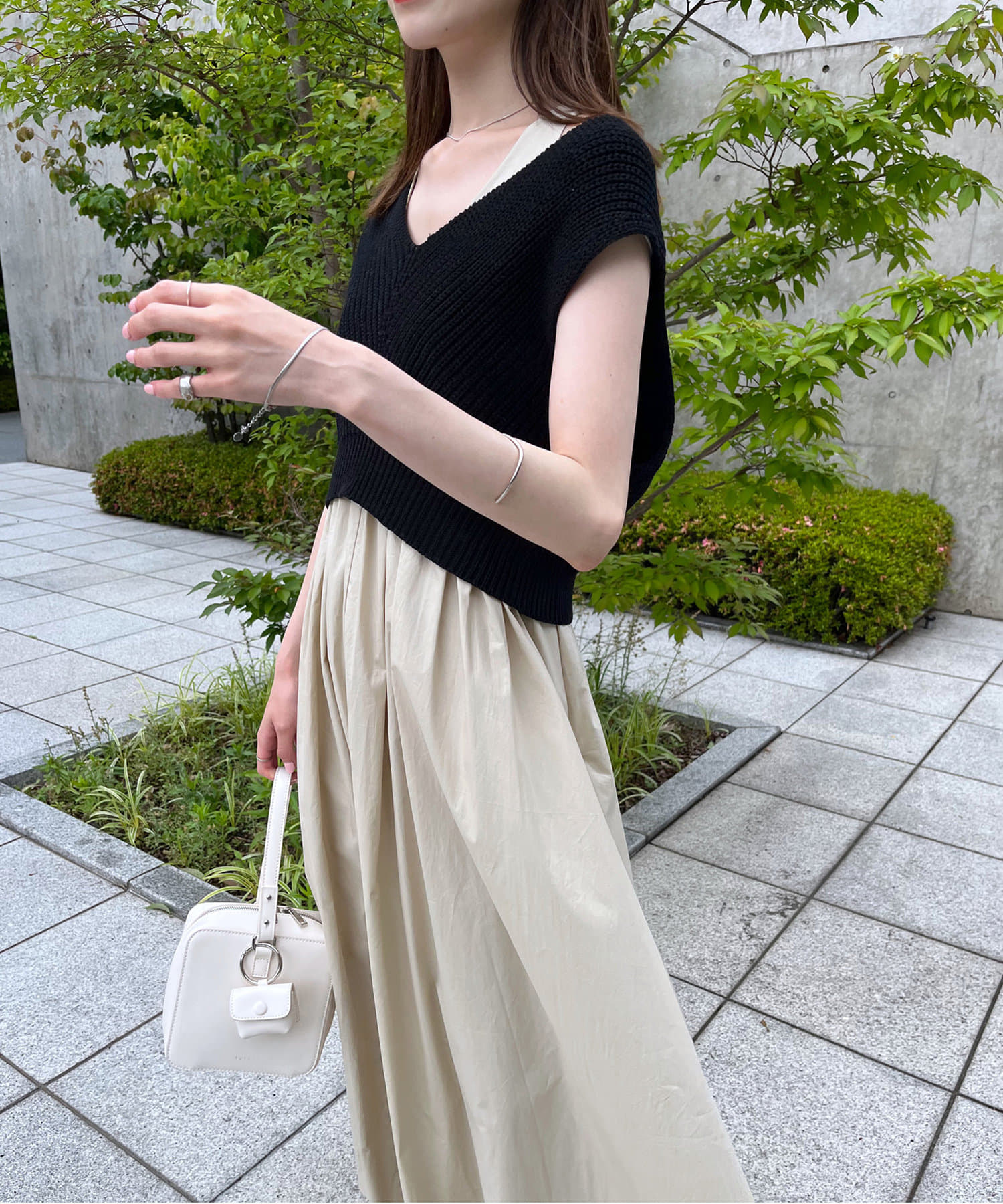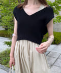 ・コンパクトなニットベストは重すぎず、抜けのある印象に。