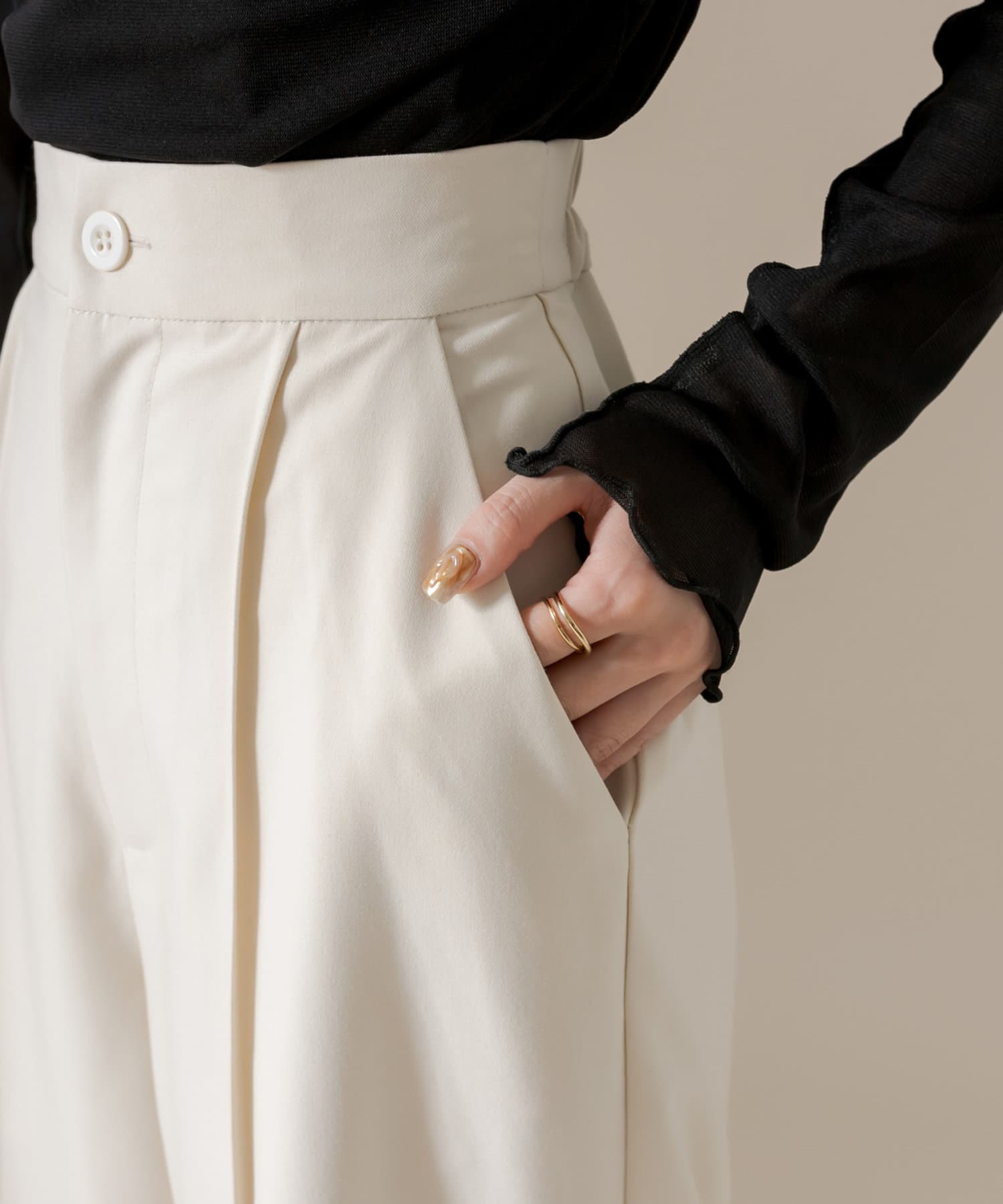 ・ハイウエストデザインなので今季トレンドのミニ丈トップスとの相性も抜群
