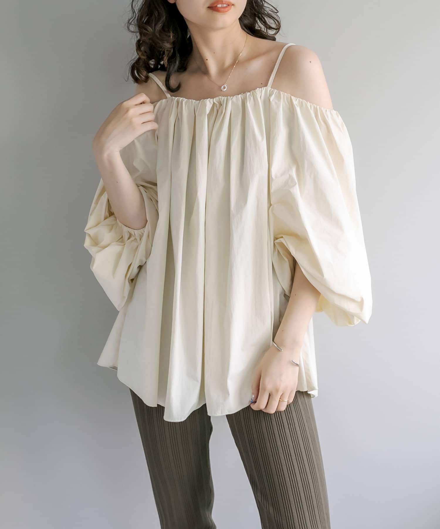 シャカシャカっとした生地が新鮮で、大人っぽく着れる気がするオフショルです。2wayで着れるのも◎長い季節活躍してくれそうです♪アイボリーの色味も可愛い♡