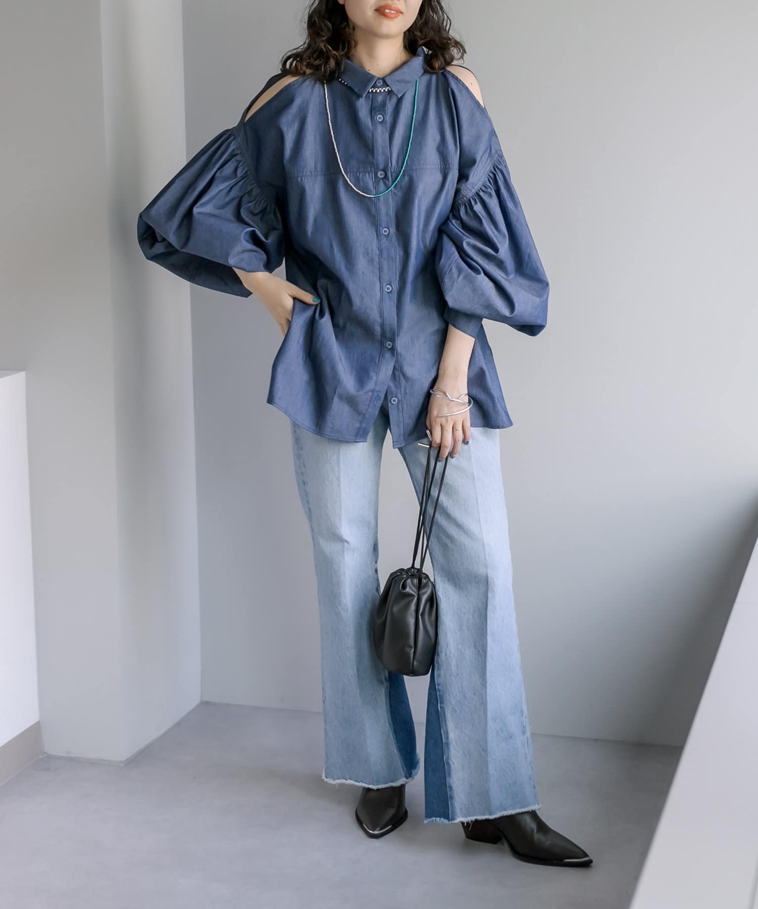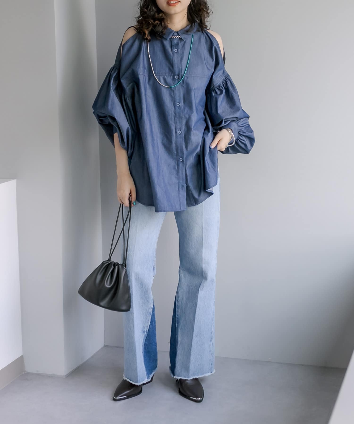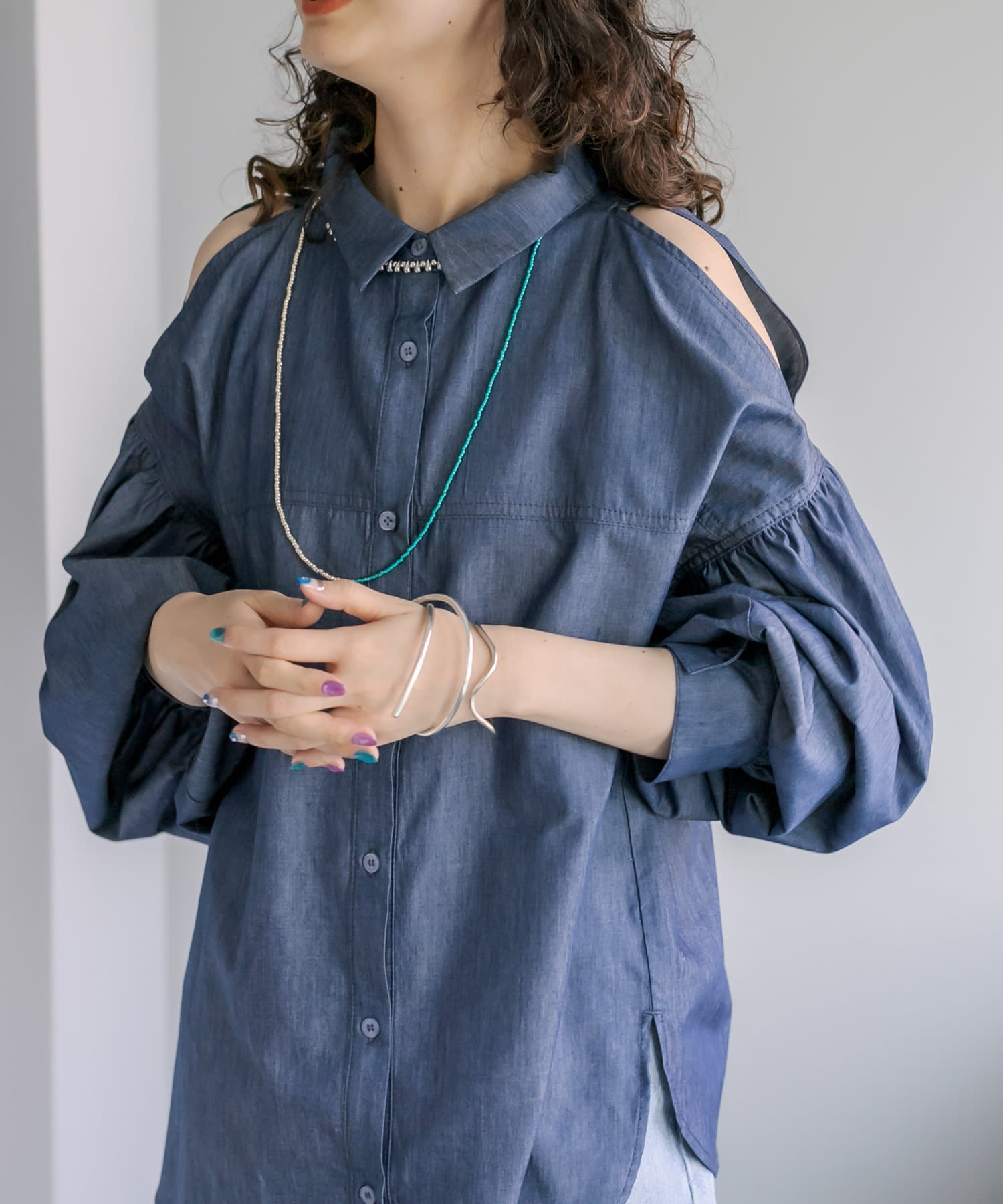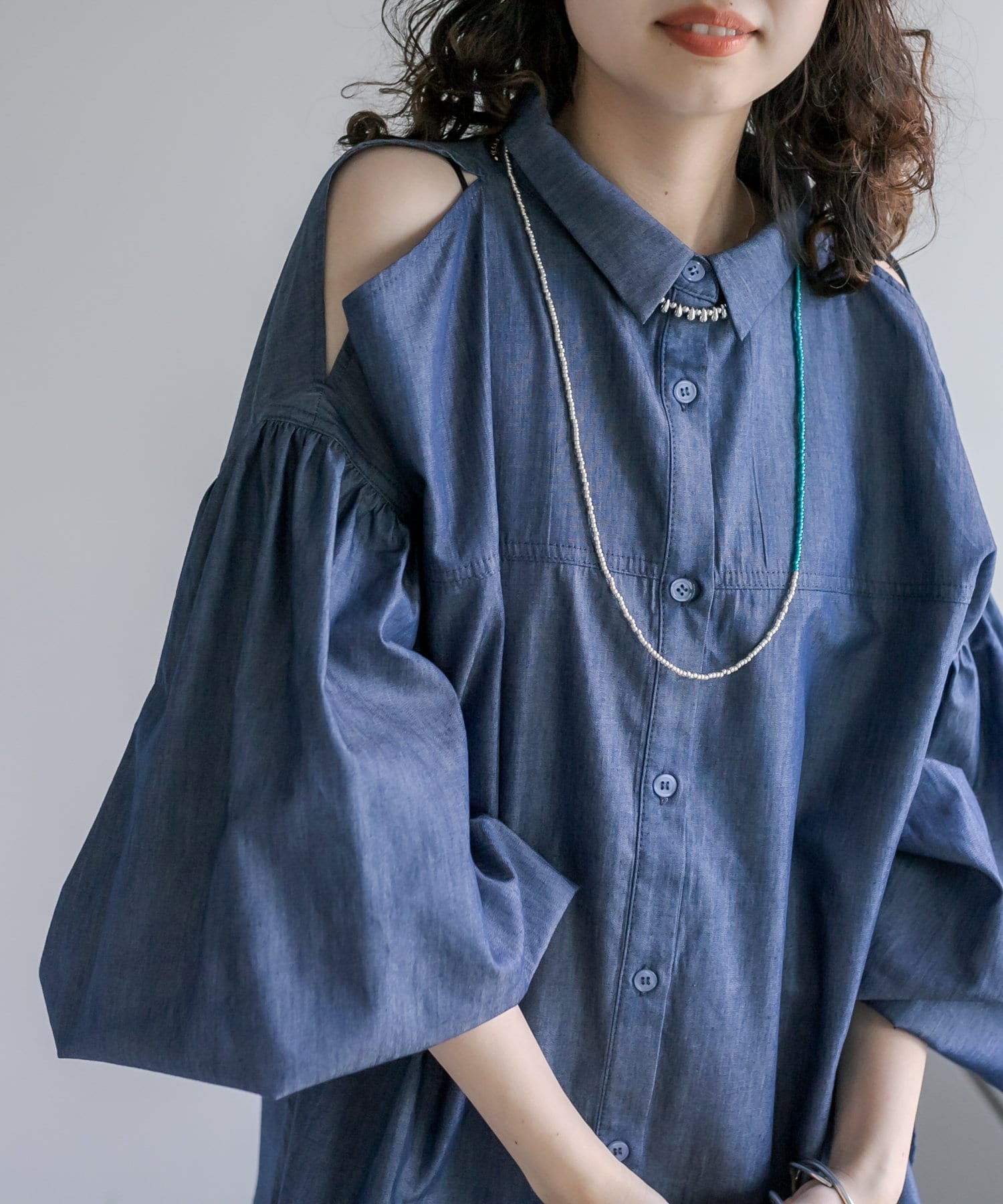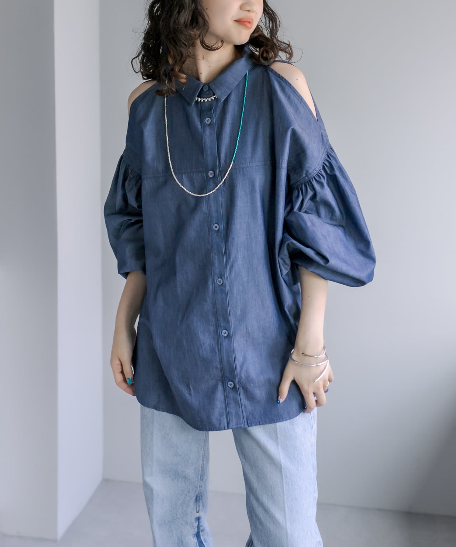 【新色追加】デニム肩あきボリュームシャツ