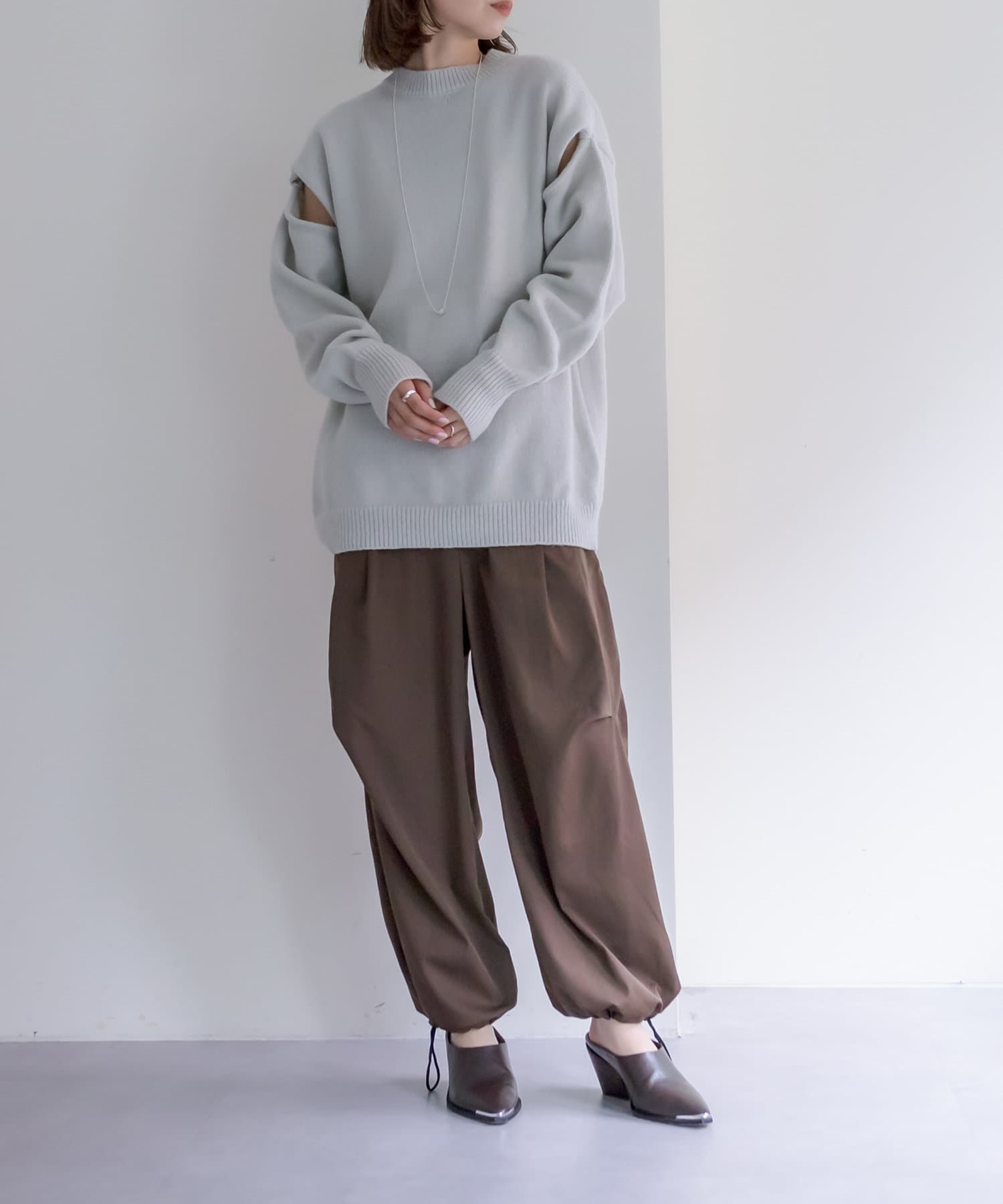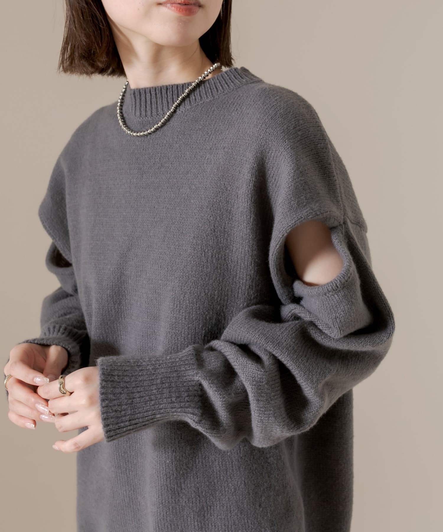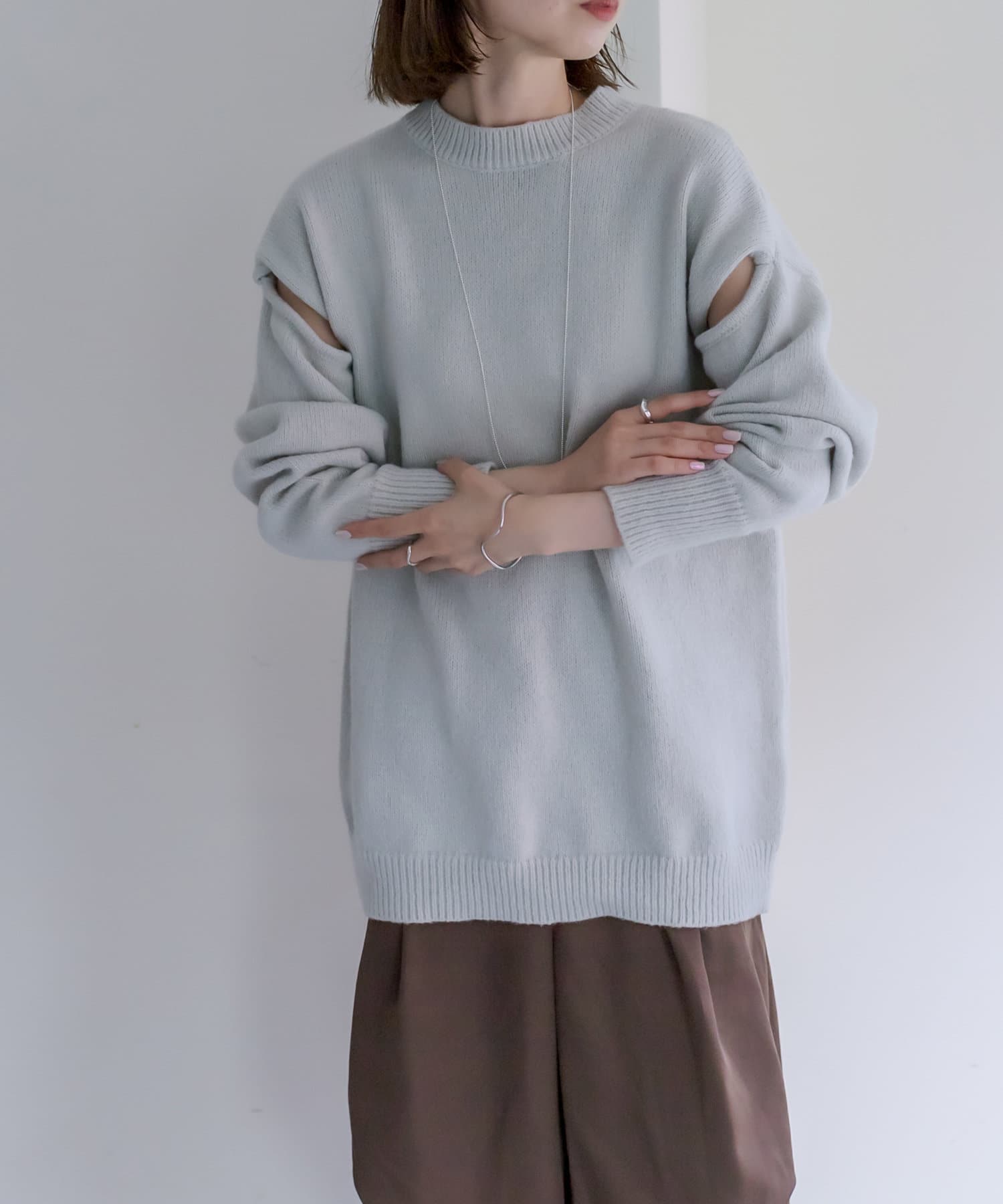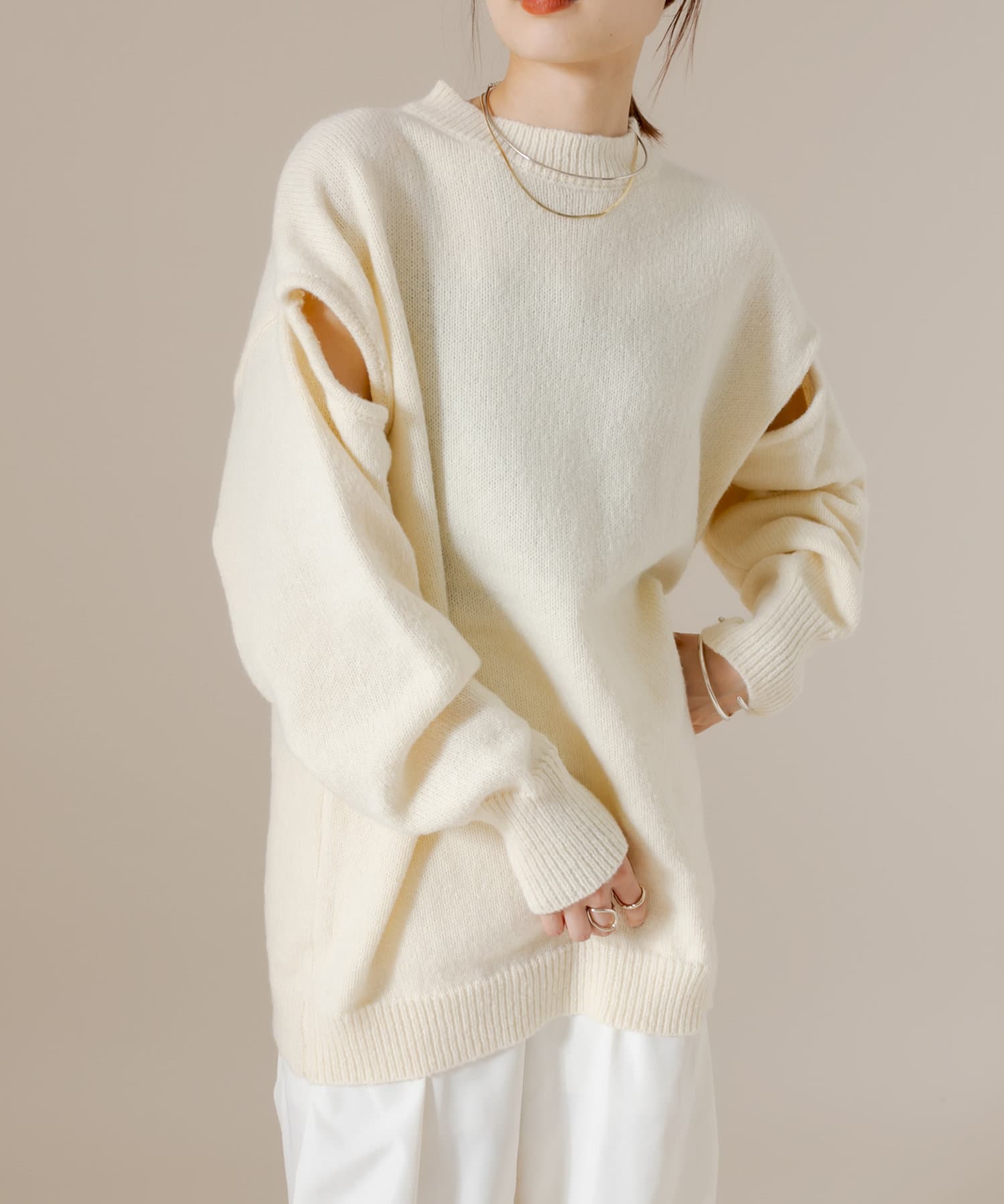 ショルダー部分にスリットが入るだけで、オーバーサイズニットだけど女性らしさが出てかわいすぎます◎