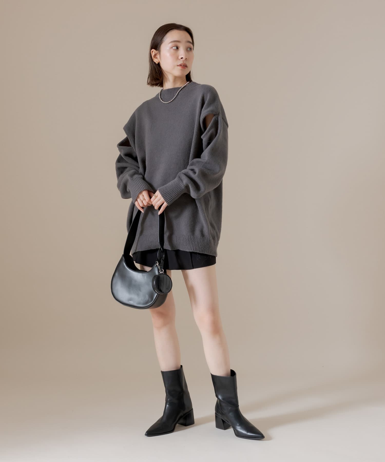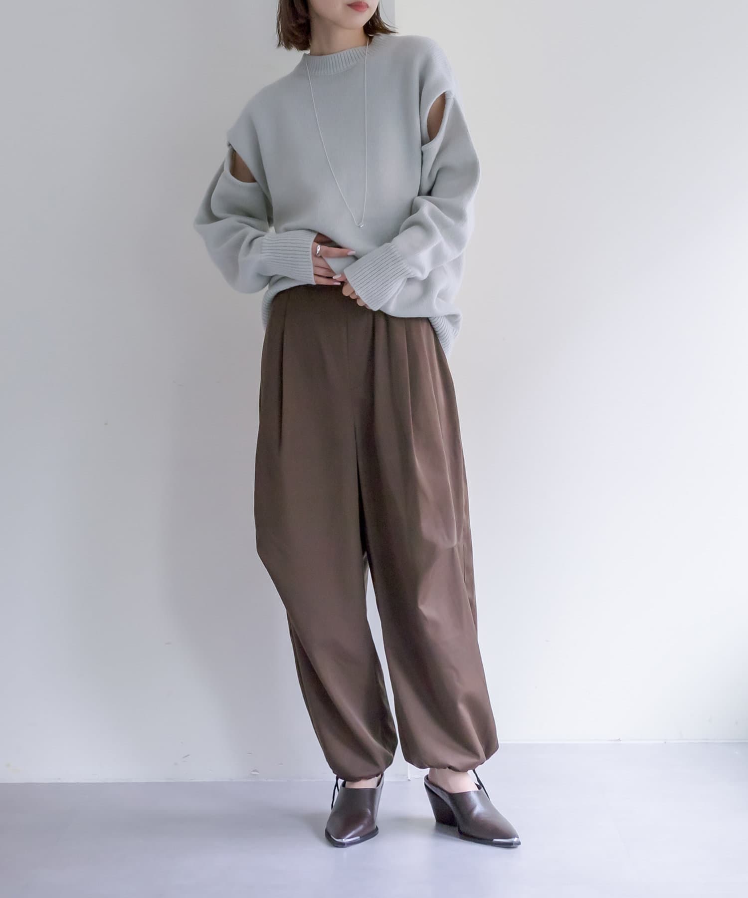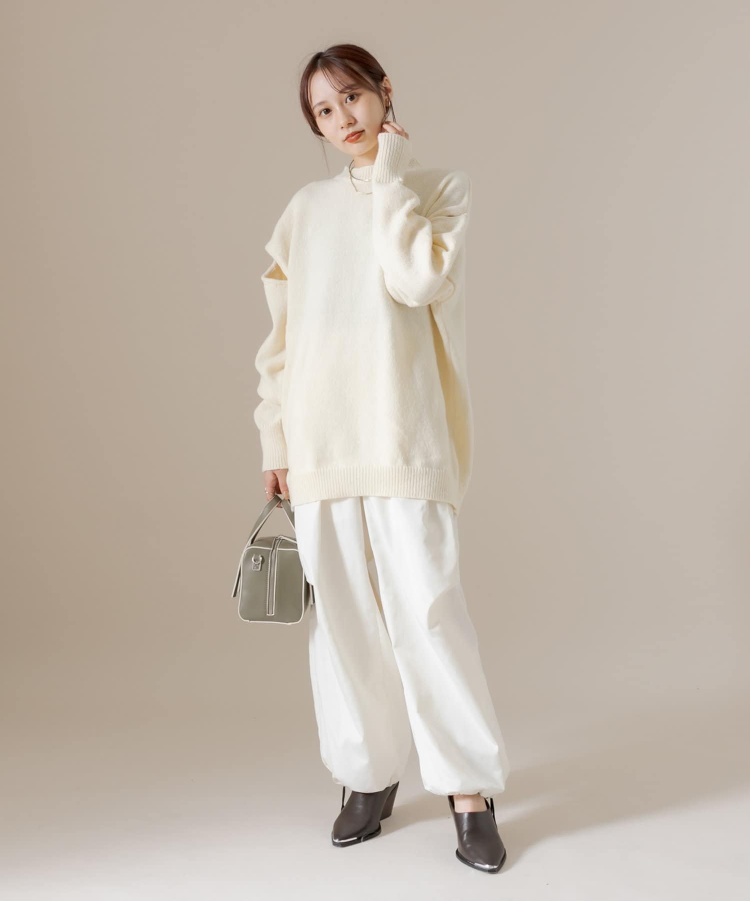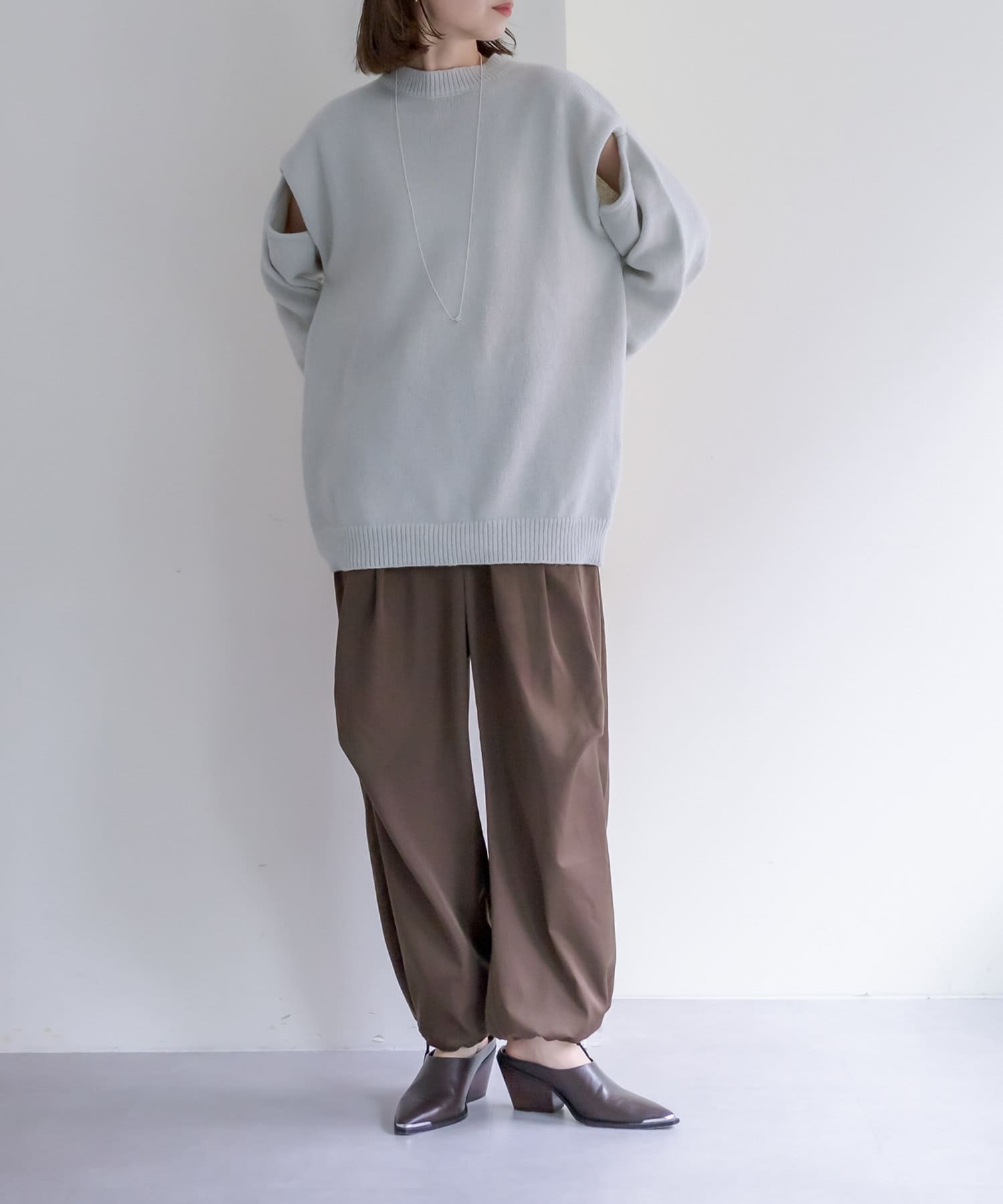 ショルダー部分にスリットが入るだけで、オーバーサイズニットだけど女性らしさが出てかわいすぎます◎