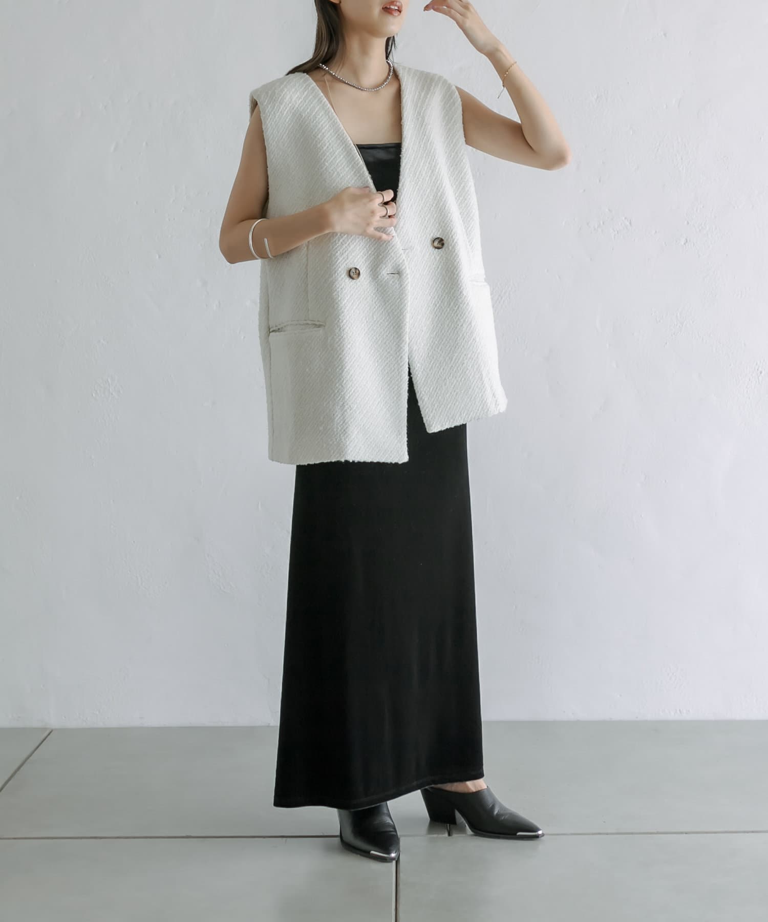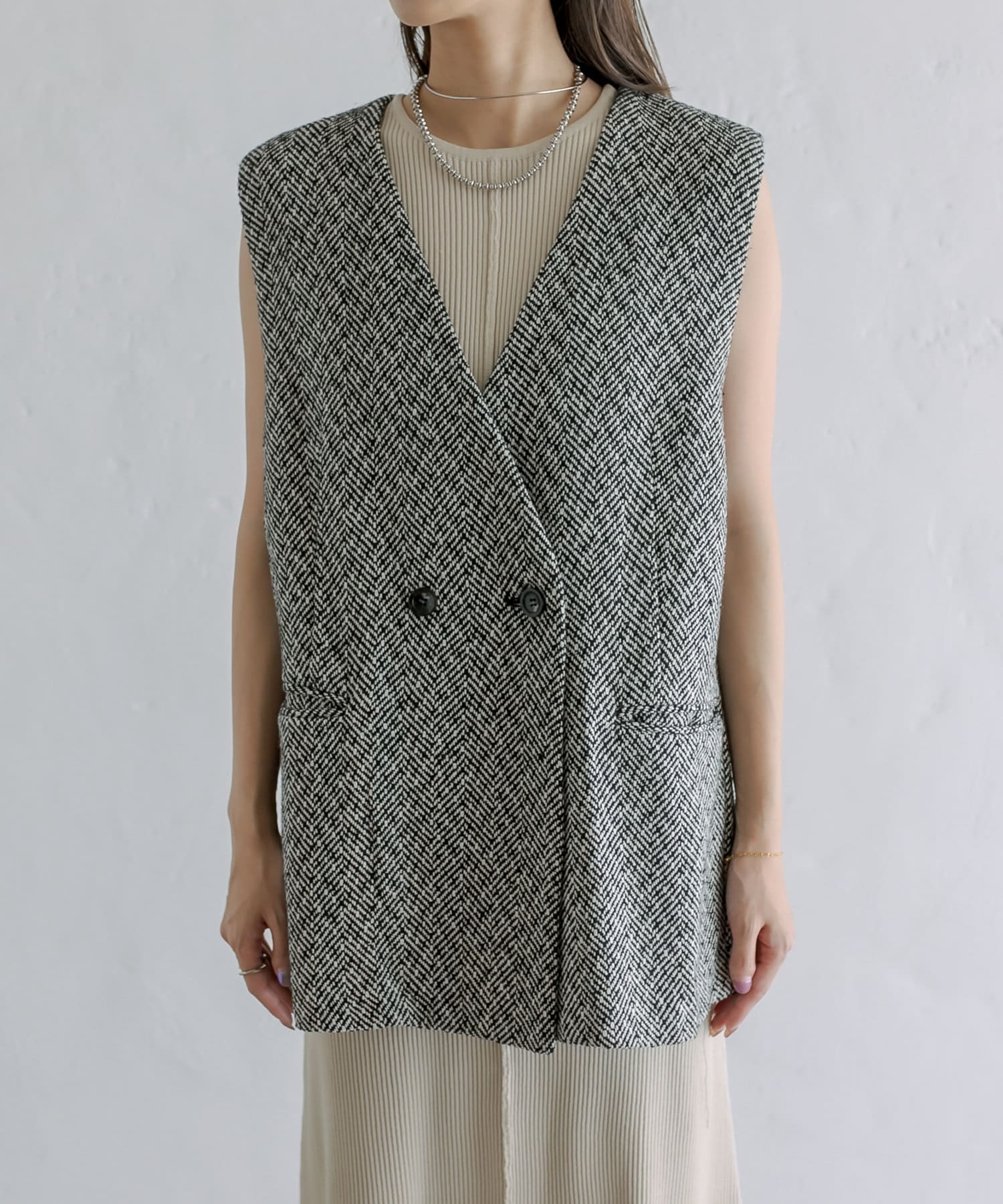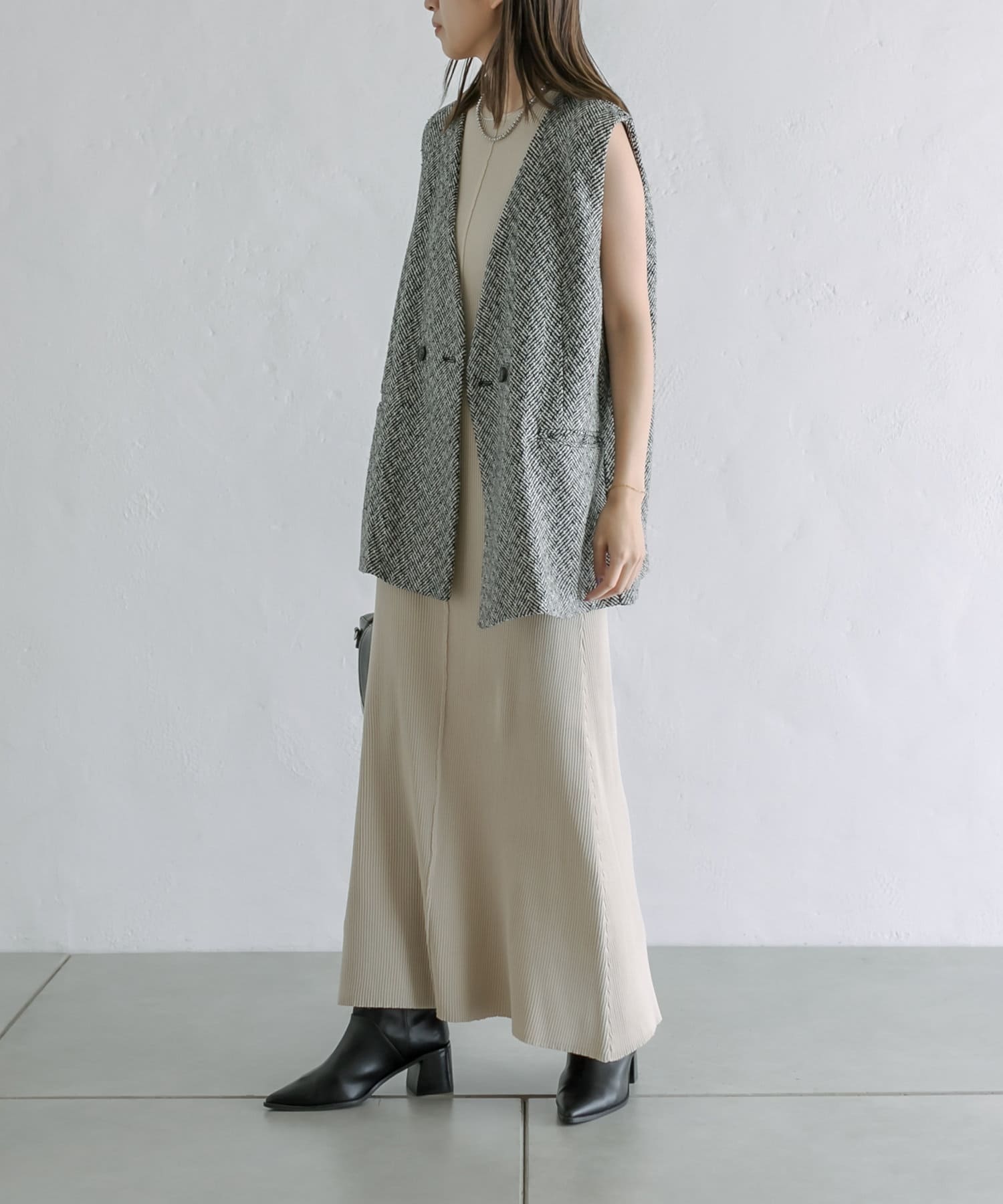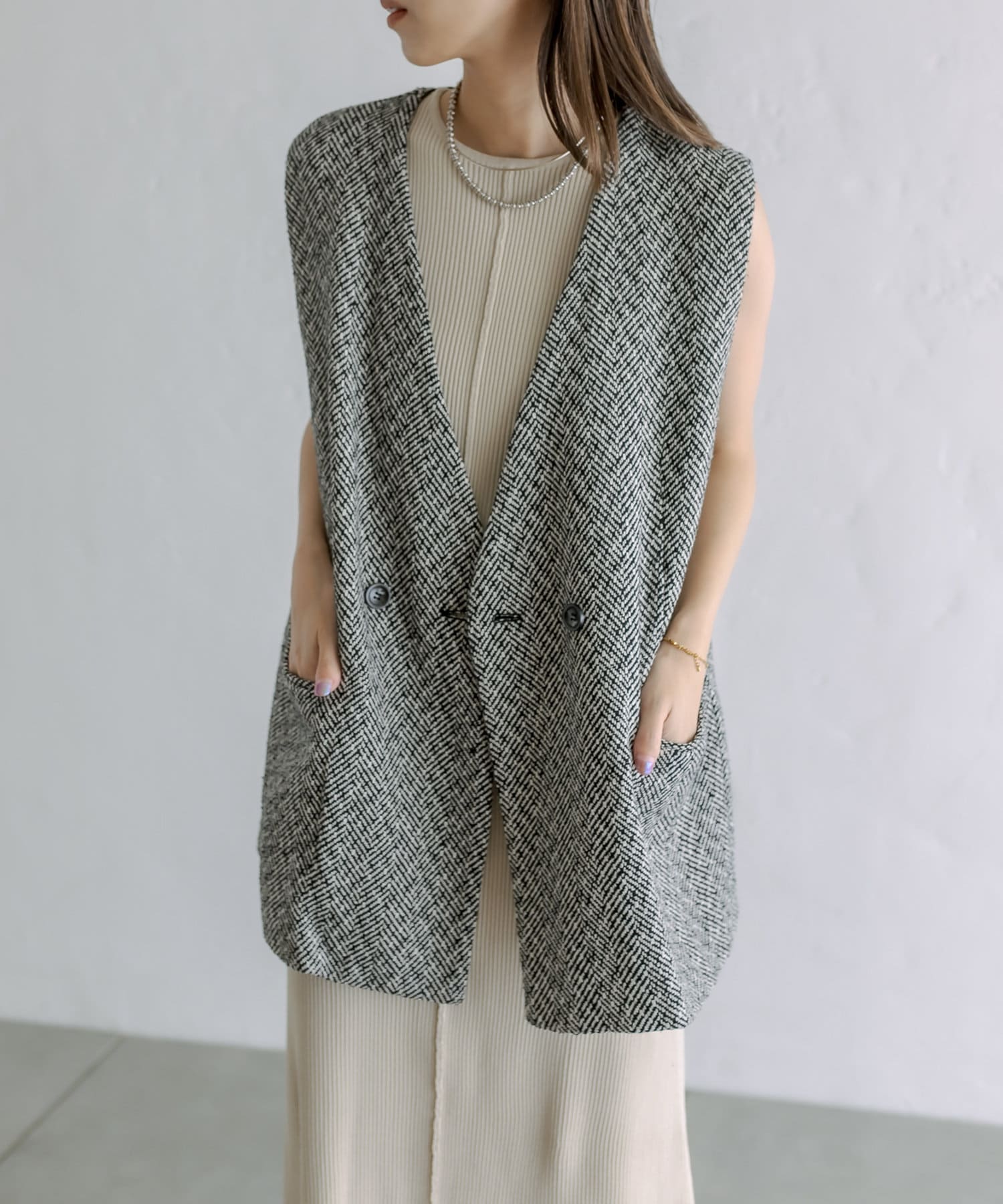今季のレイヤードスタイルに最適!高級感のあるツイード素材のジレが登場!