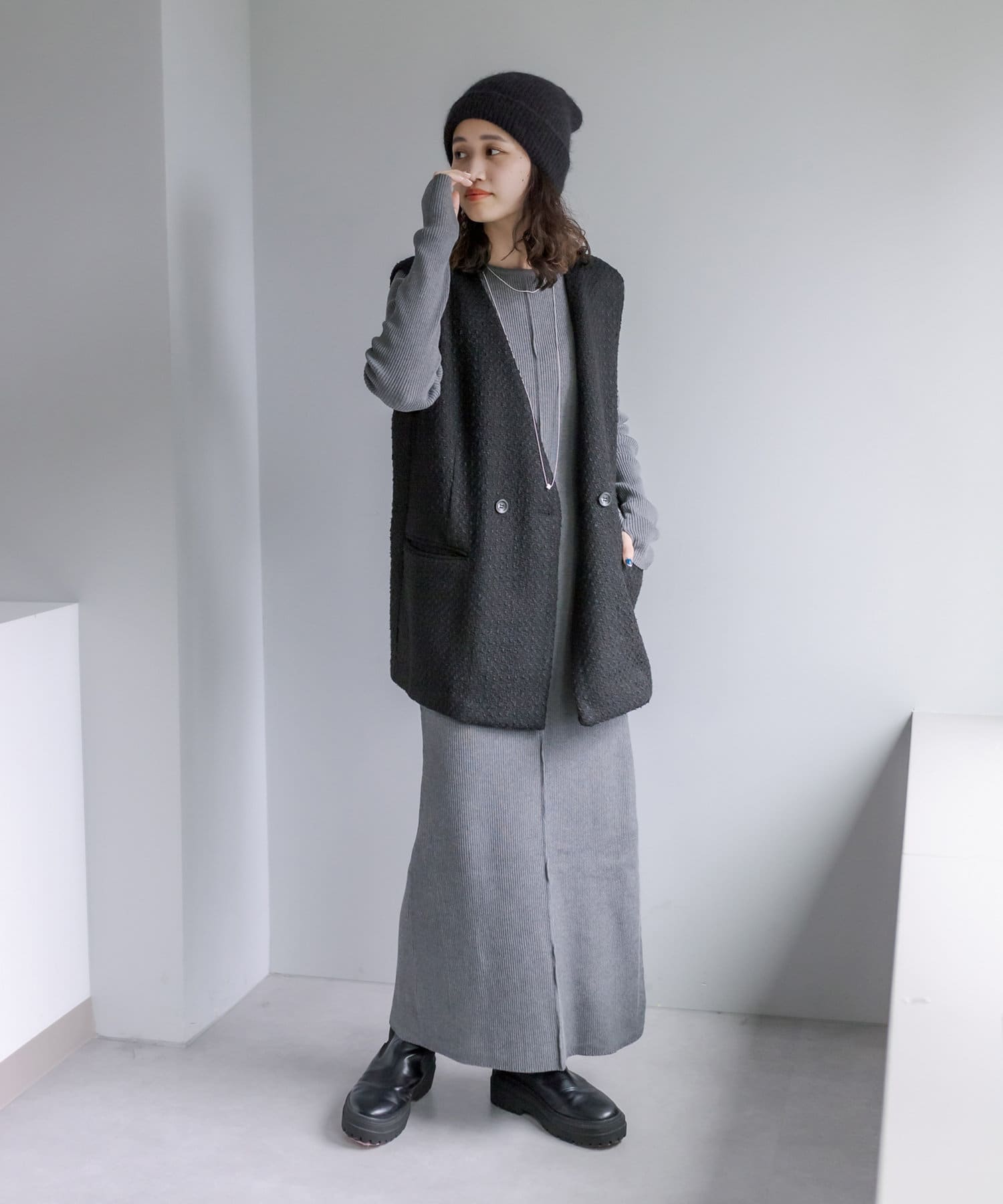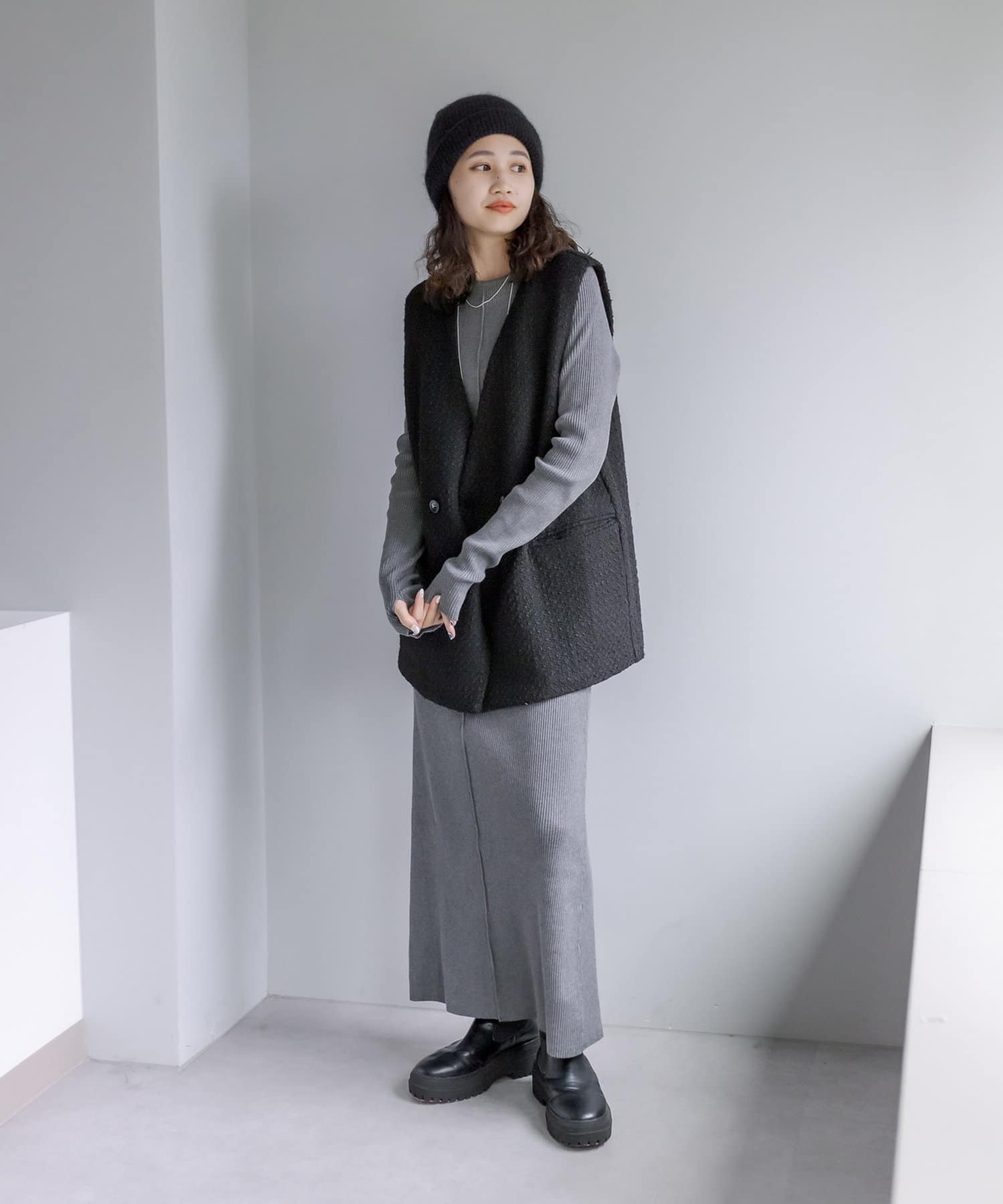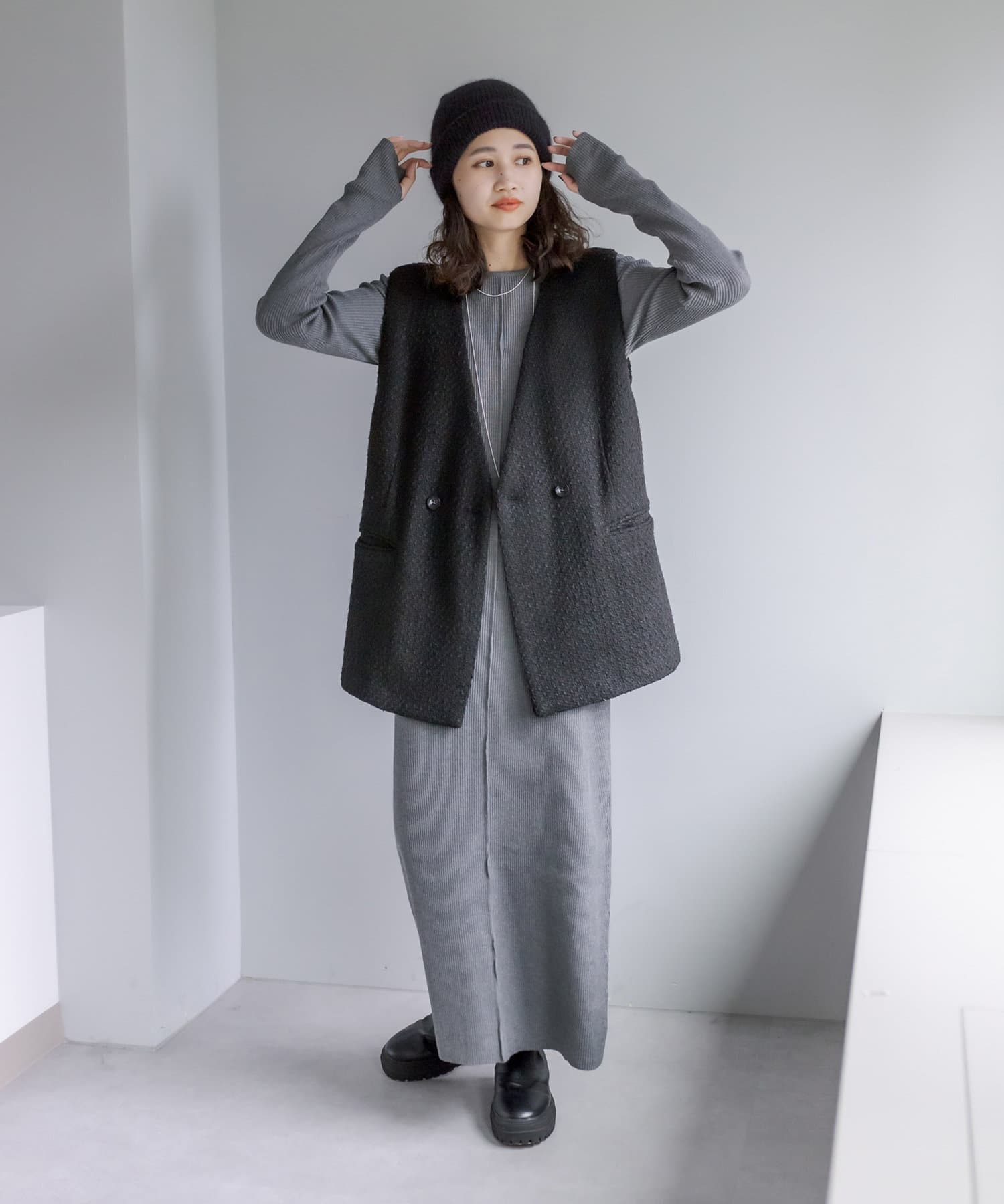 ・ツイードの編地が1枚でスタイリングの主役に決まります。