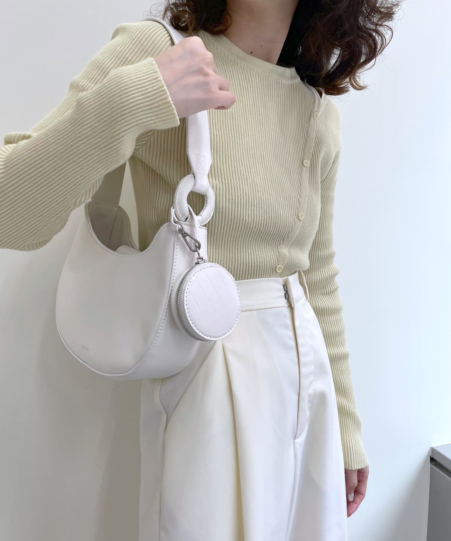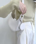 ・クロコ素材の丸ポーチはスタイリングのアクセントに。