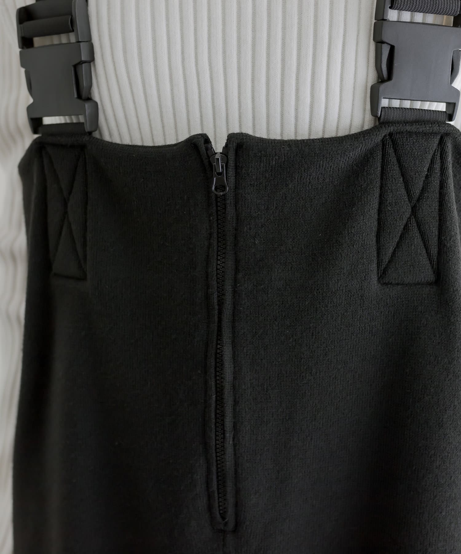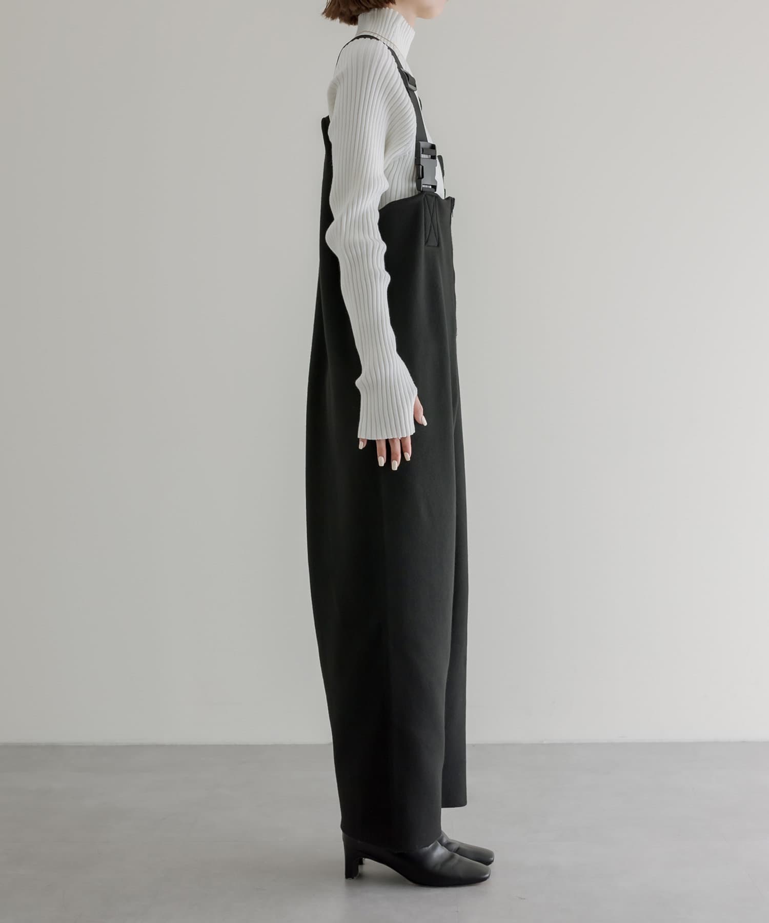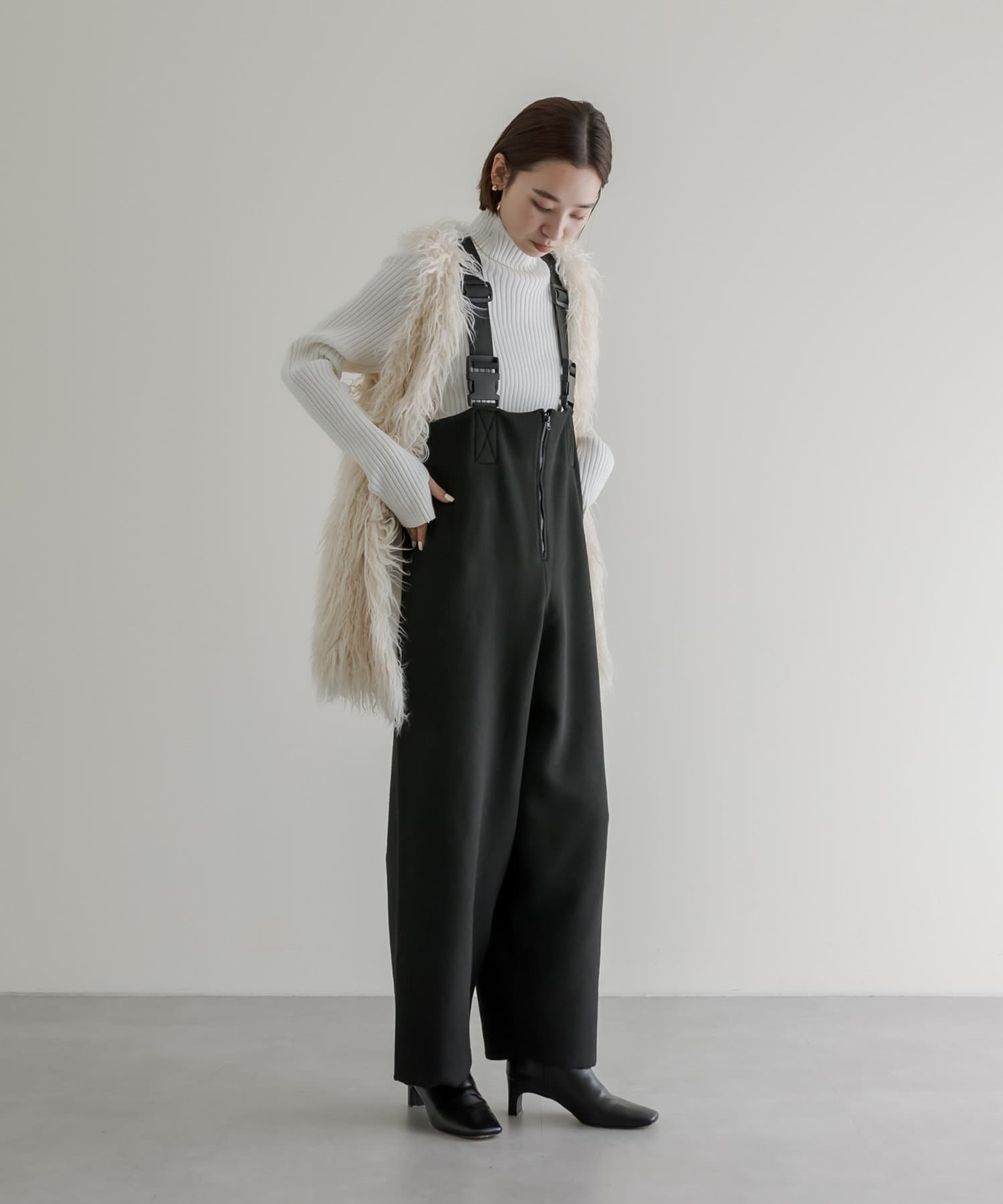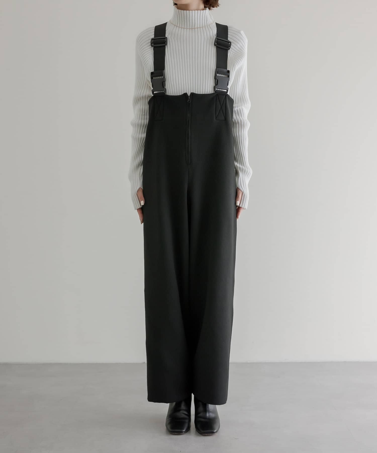・フロントジップとベルトがポイントのサロペット風オールインワン。