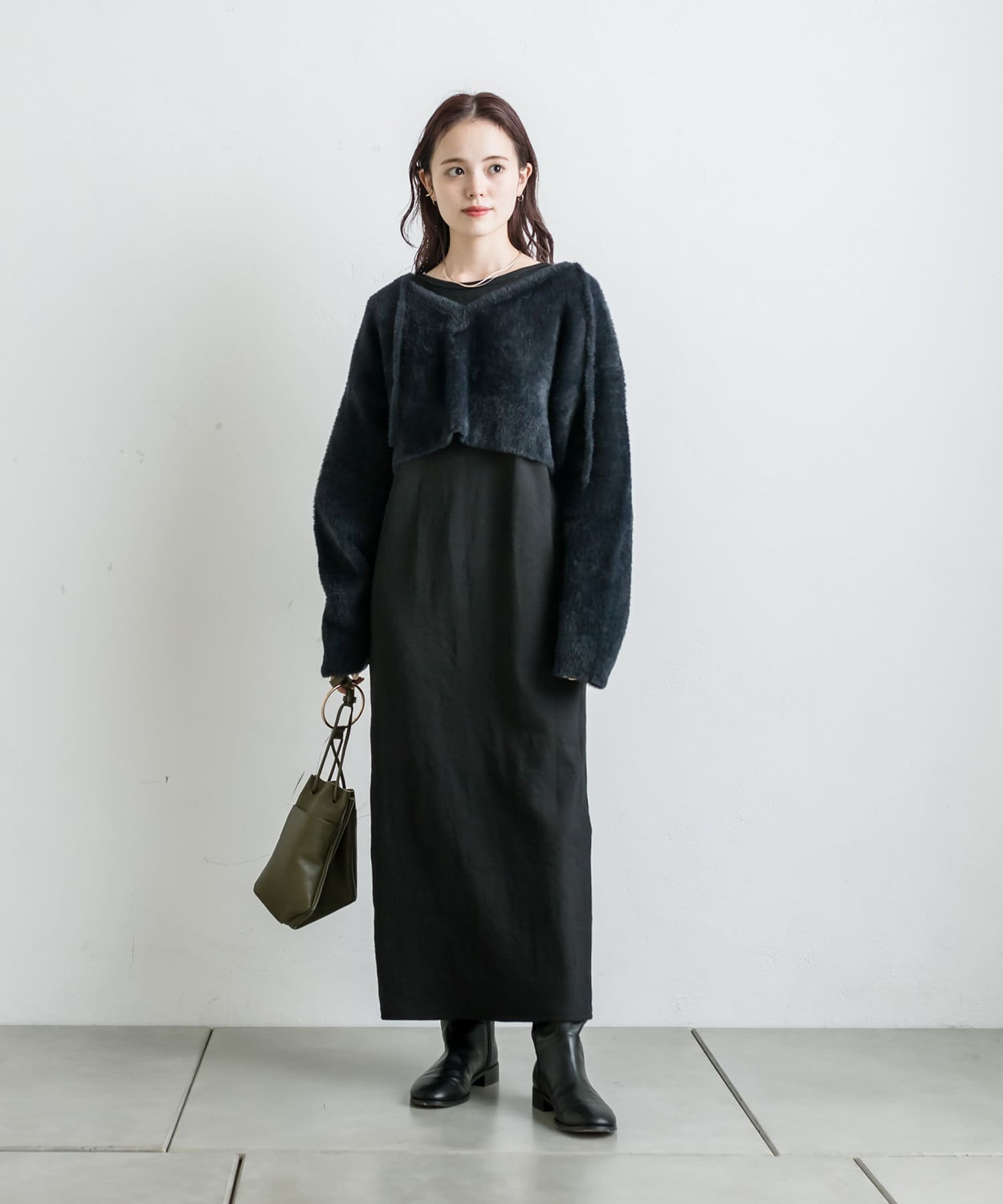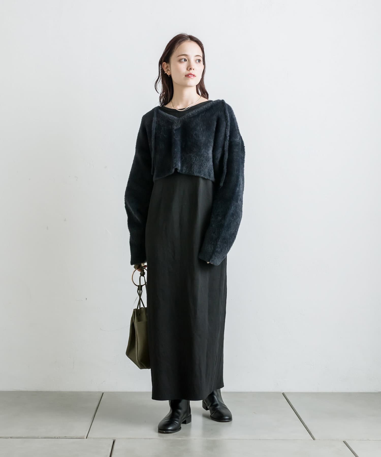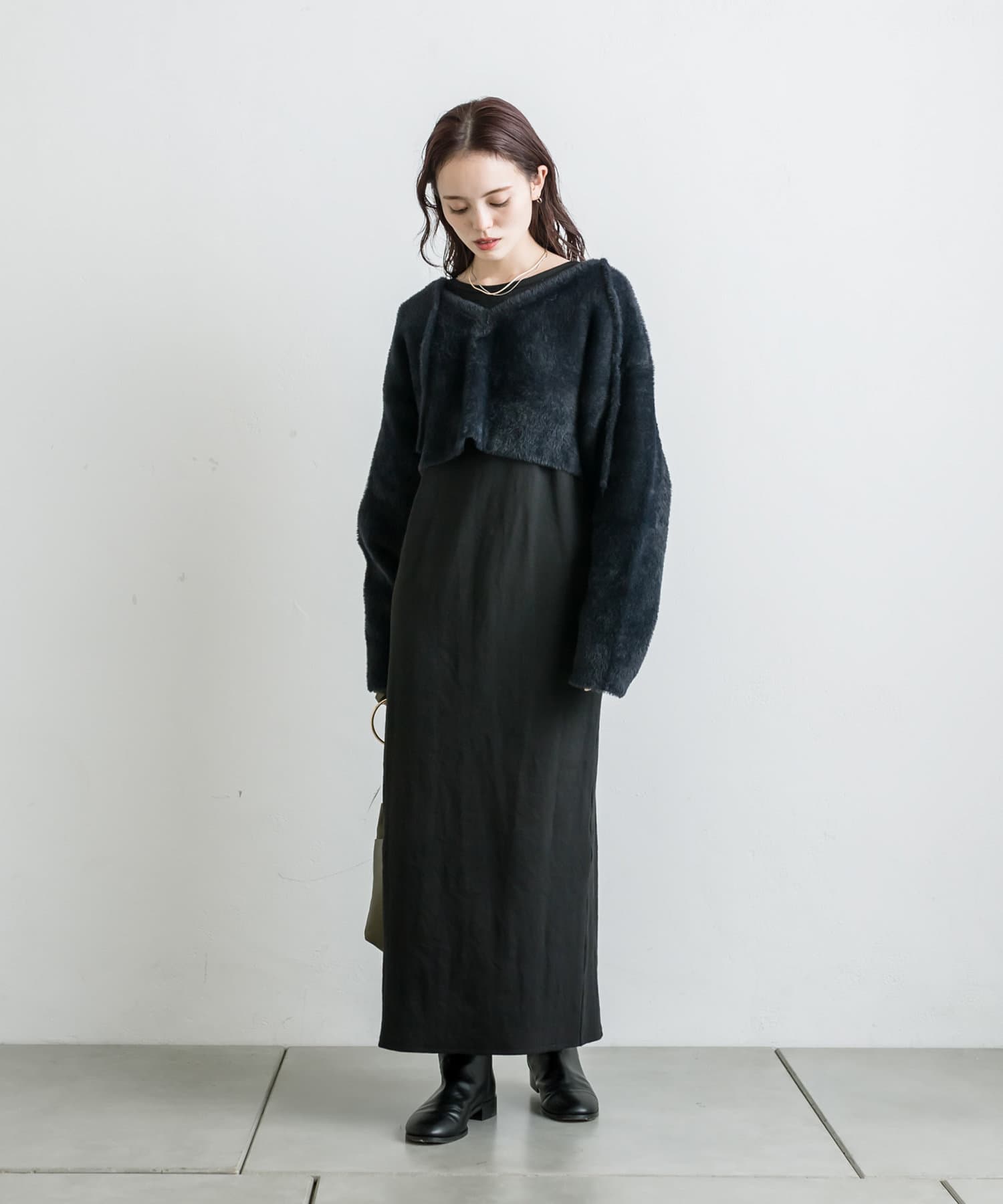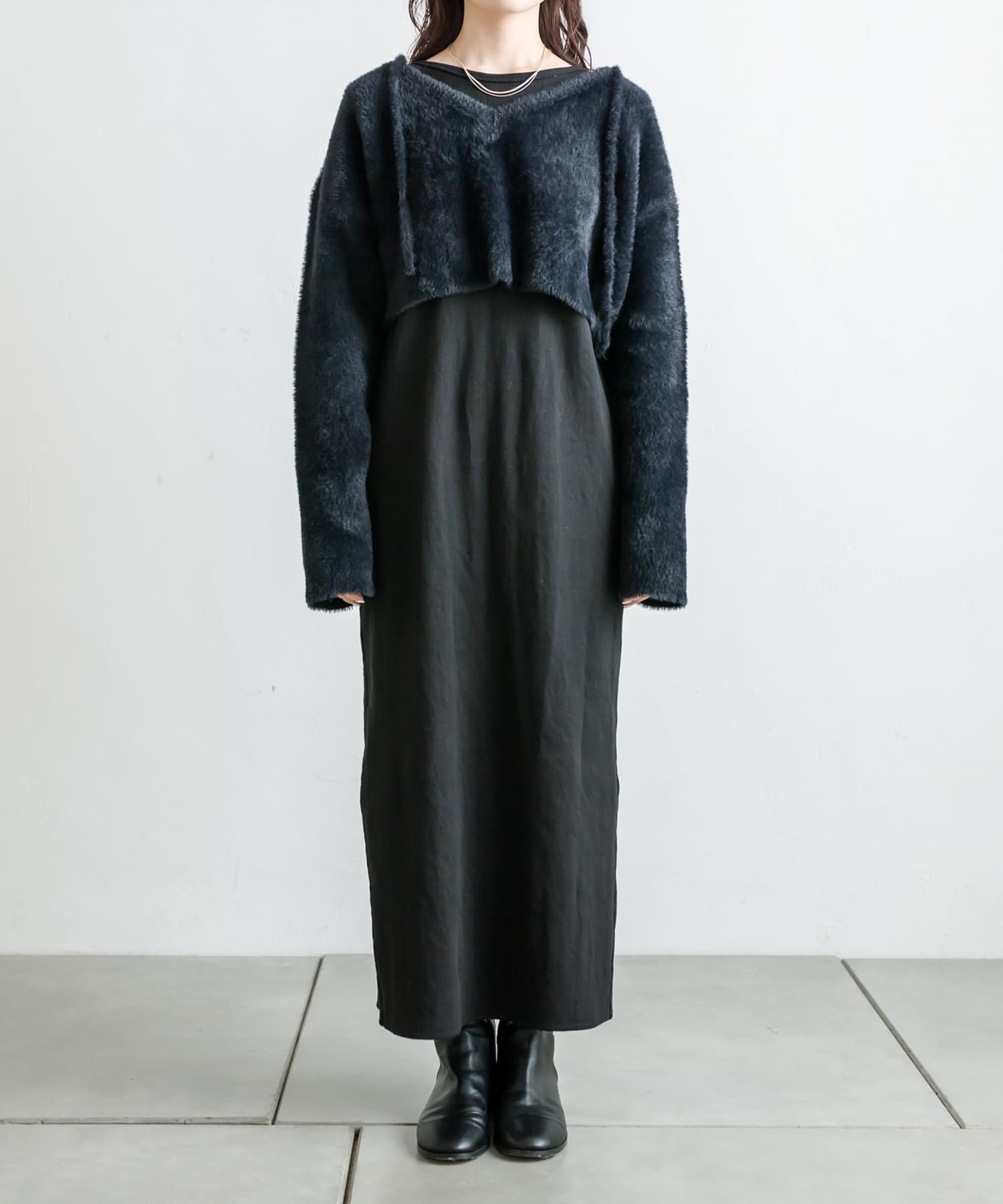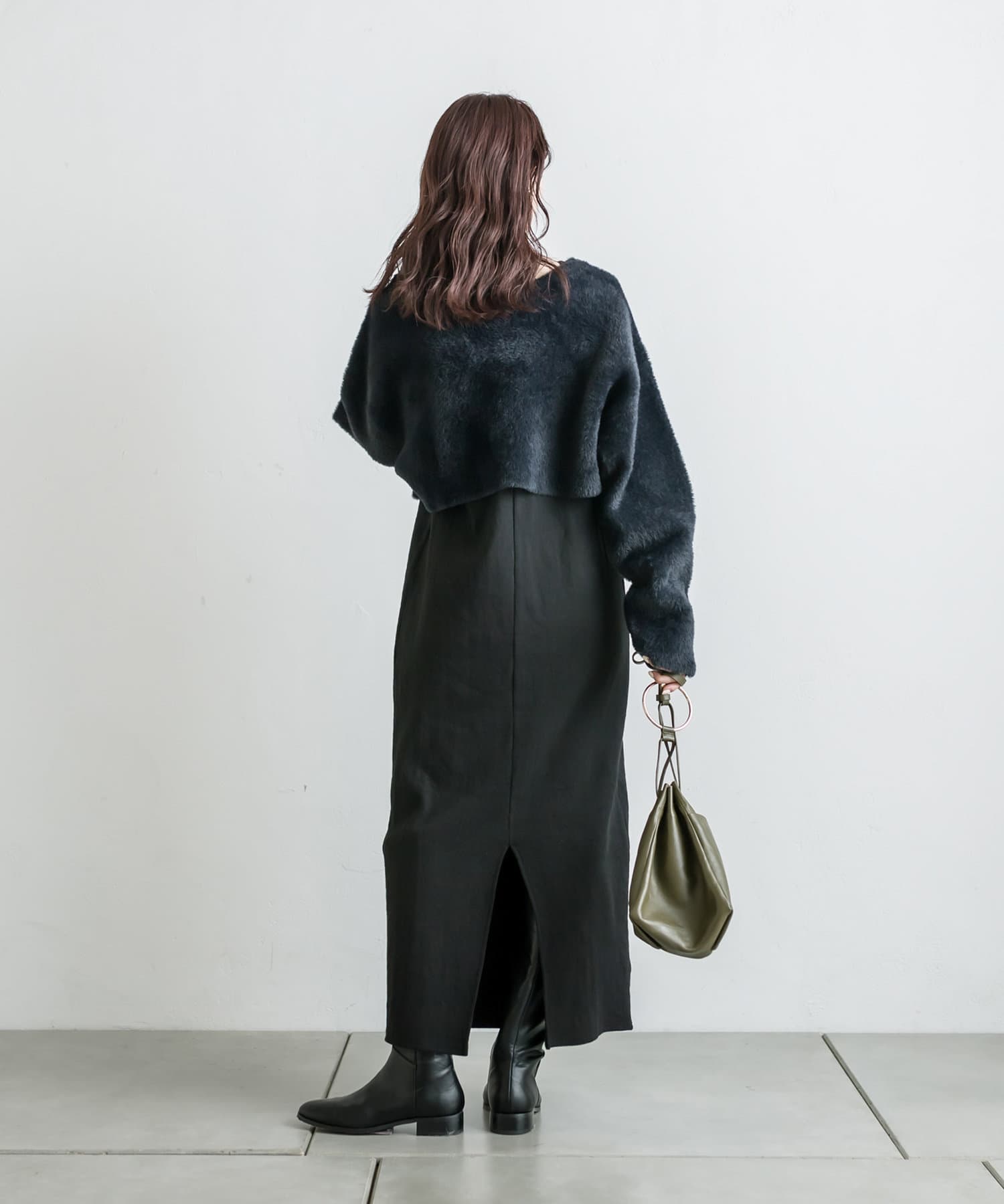 ・ワンピースと、ニットはどちらも前後両前で着れるセットアイテム。